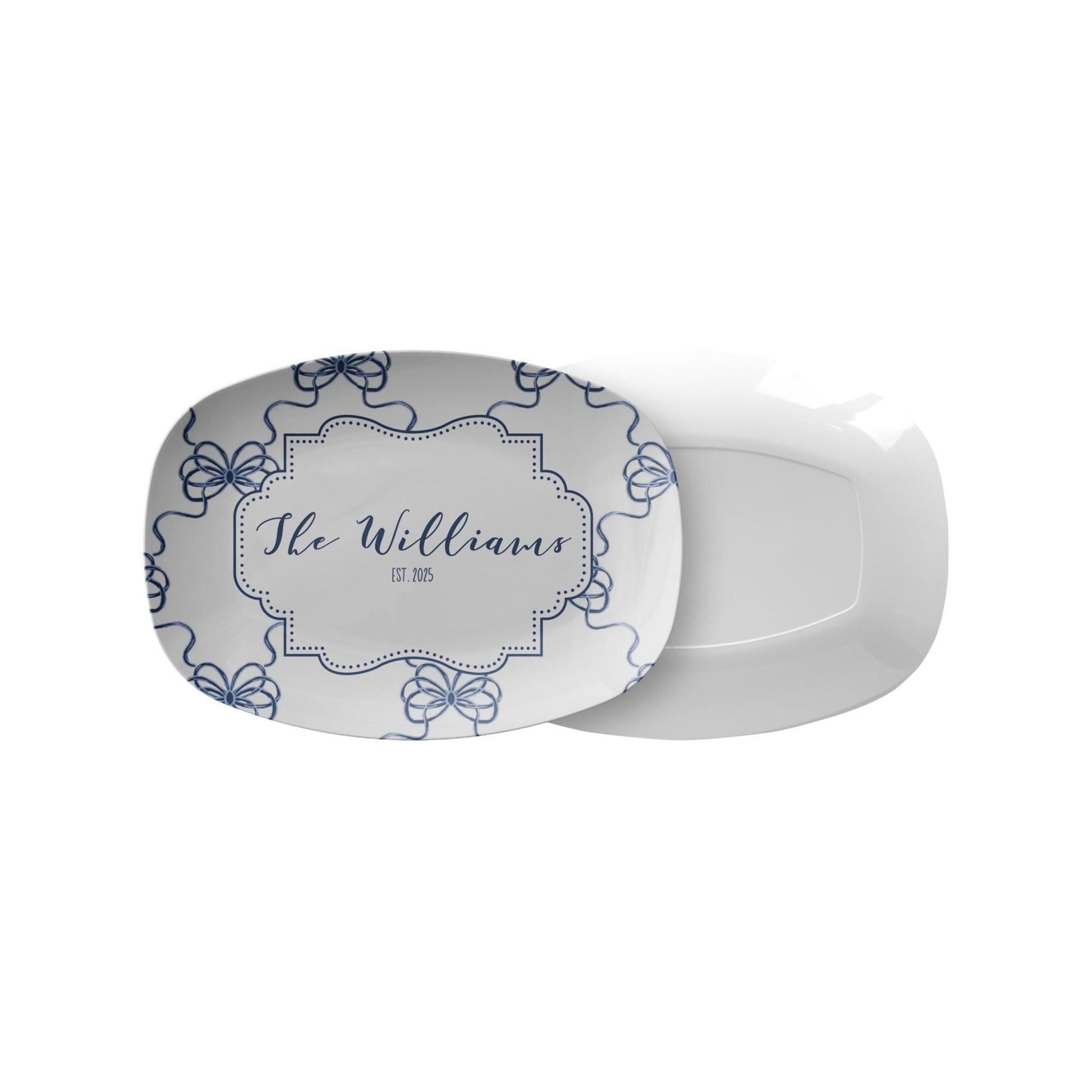 Elegant and timeless, our Blue Bow Personalized Platter is a graceful addition to any celebration. The hand-drawn bows give off classic charm, making it perfect for weddings, bridal showers, or hostess gifts. Personalize with your family name and established year to create a beautiful serving piece or treasured keepsake.