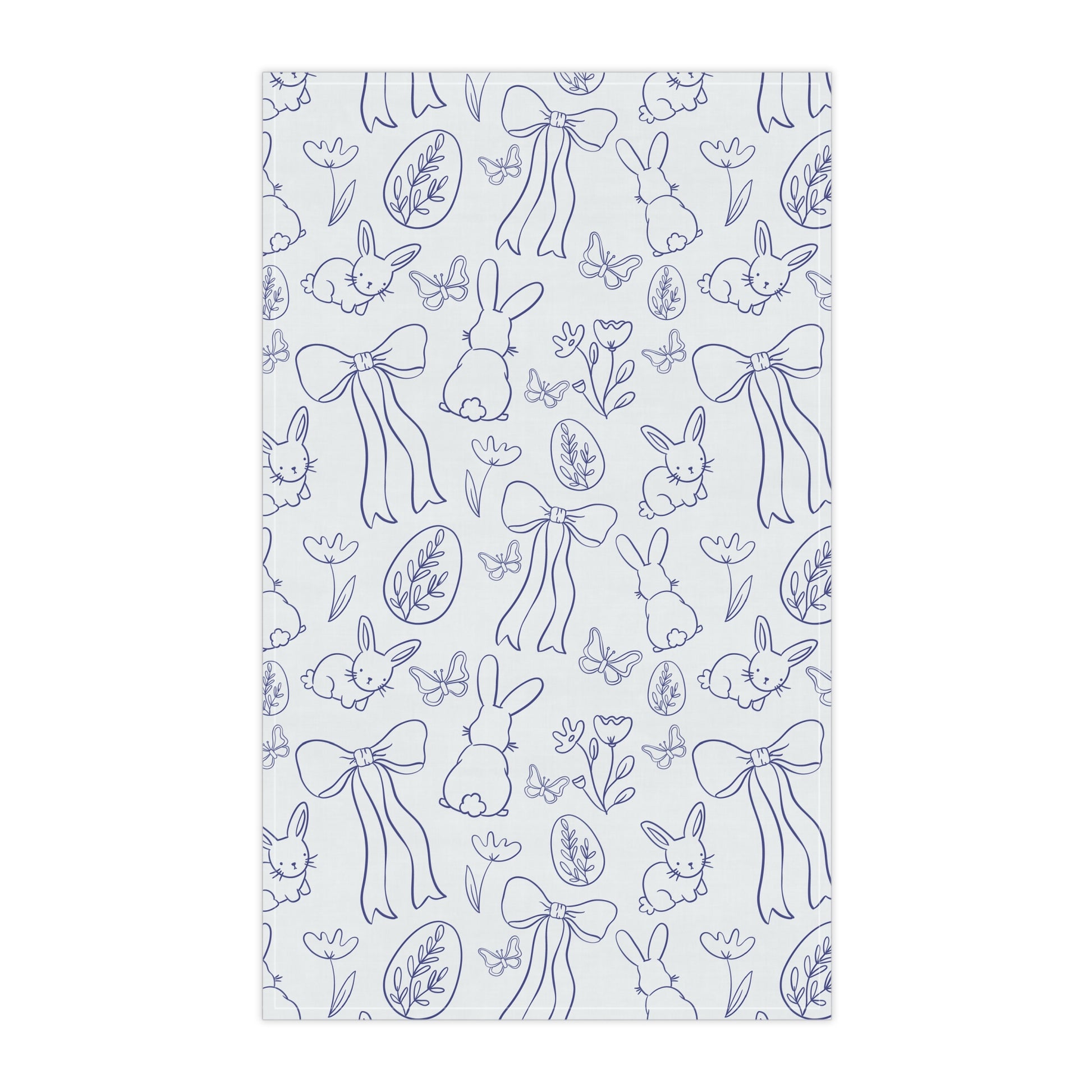 Clean, classic, and perfectly springy—this tea towel features a blue line-art Easter pattern with sweet bunnies, bows, decorated eggs, butterflies, and simple florals. The crisp blue-on-white look feels like a modern preppy/toile-inspired doodle, making it an easy seasonal swap that still matches a neutral kitchen.