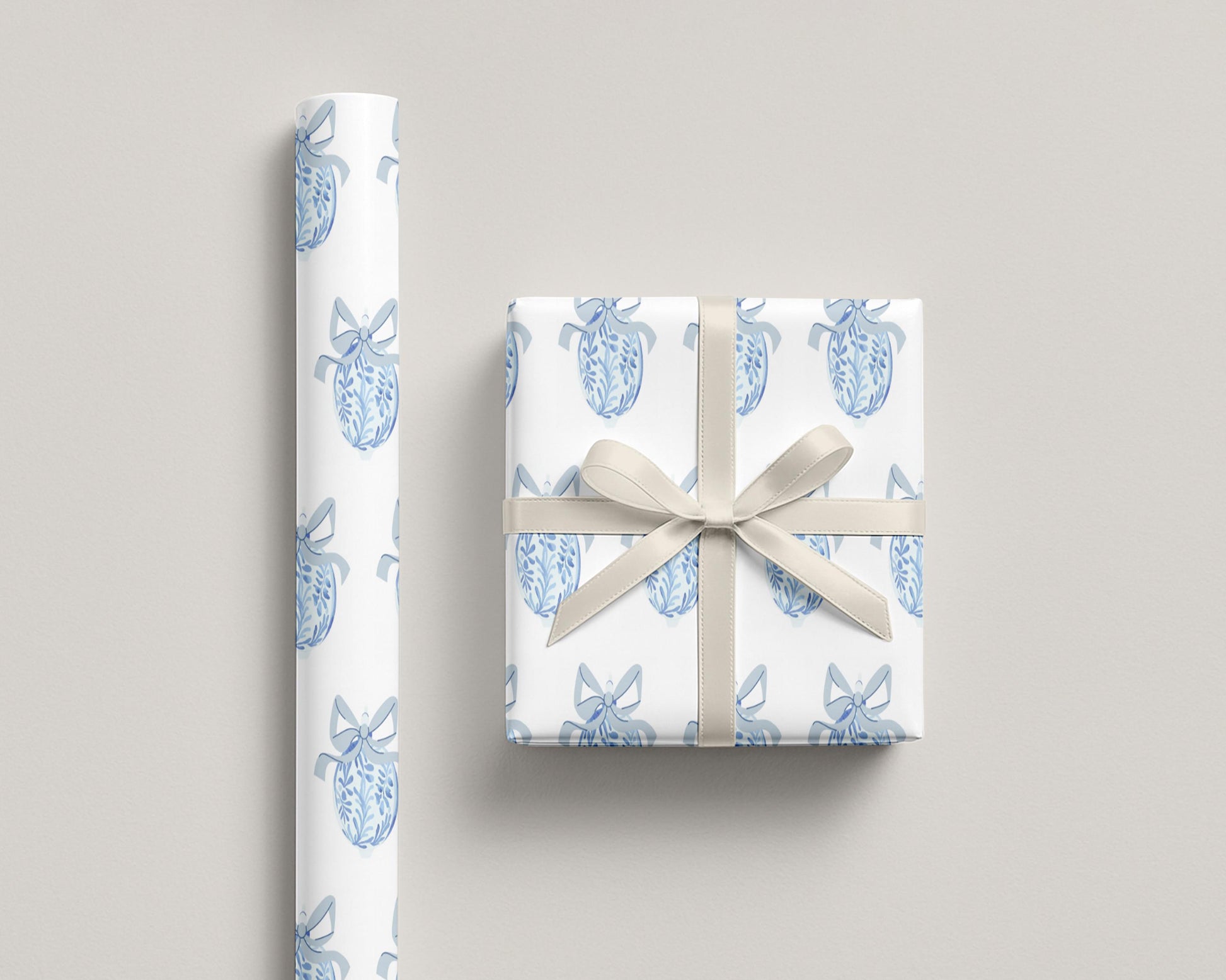 Wrap your gifts in timeless elegance with our Blue Chinoiserie Ornament Wrapping Paper, featuring delicate watercolor Christmas ornaments adorned with graceful blue bows and botanical patterns.