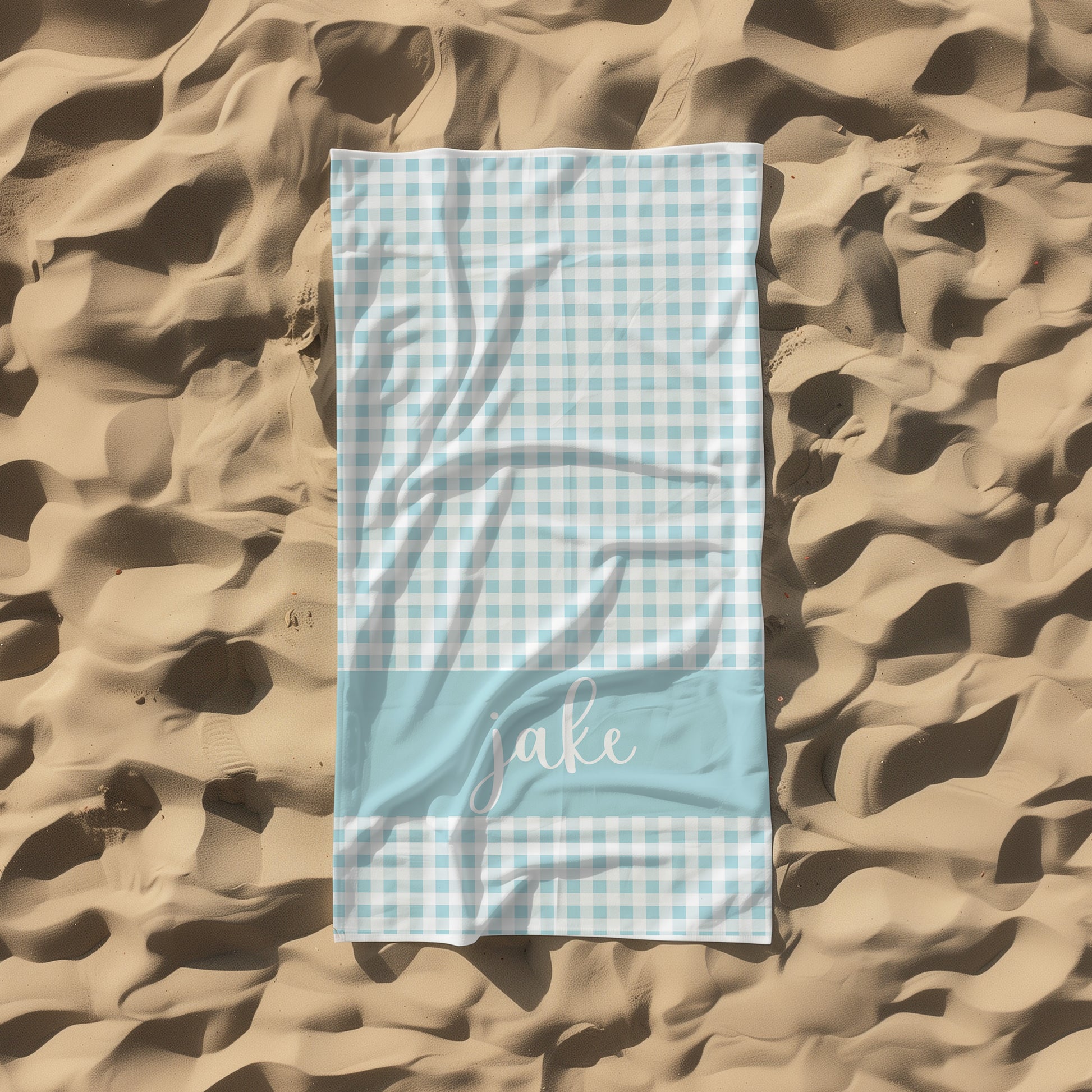 Light, breezy, and quietly personal — this Blue Gingham Personalized Kids Beach Towelwraps familiar gingham in a soft seafoam blue with a vertical name panel for a handwritten touch. The printed face shows crisp, summery checks that read fresh on sand or poolside, while the cotton loop backing gives a gentle, absorbent feel against skin. It drapes easily over a lounge chair or spreads out for a picnic, and the hemmed edges keep the shape tidy wash after wash. Bring a calm, coastal rhythm to long days in the sun with a towel that reads like a seaside note.Product features- Soft, quick-dry polyester print face with vibrant one-sided design- Absorbent white cotton loop backing for comfort and drying- Durable hemmed edges to prevent fraying- Available in two sizes: 30"×60" and 36"×72"- Blend materials: approx. 50–52% polyester / 48–50% cotton; meets safety and chemical standardsCare instructions- Wash the item only cold machine wash with similar colors garments using a gentle cycle. Tumble dry on low settings or hang dry. Do not bleach or dry clean.