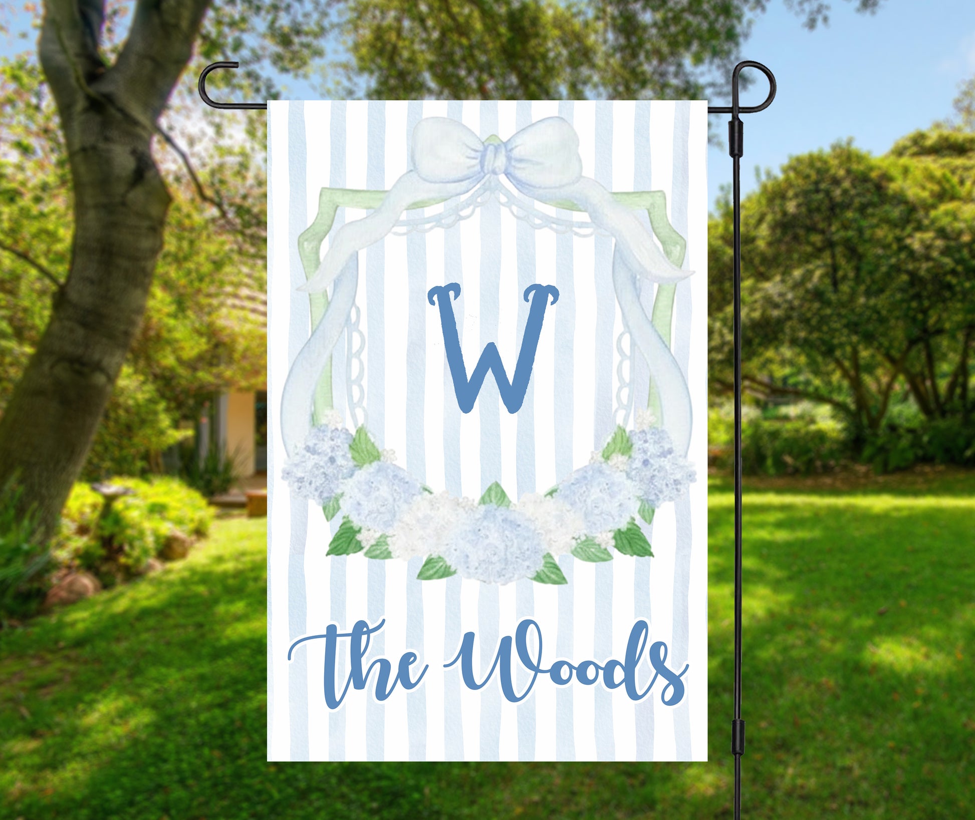 A light, welcoming garden and house banner that brings a soft, cottage-garden feel to your entryway. Pale blue stripes, a delicate hydrangea wreath, and a ribbon-tied monogram create a calm, comforting look that reads like a friendly hello to neighbors and guests. Hang it on a porch post, in a small yard garden, or by the front door to add a touch of seasonal charm and personal style. The double-sided print keeps the design visible from every angle, while the subtle palette blends easily with both classic and modern decor.