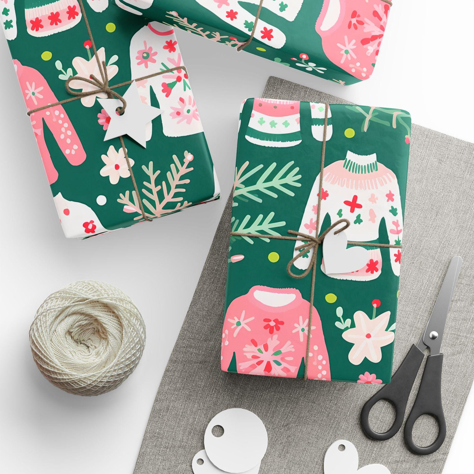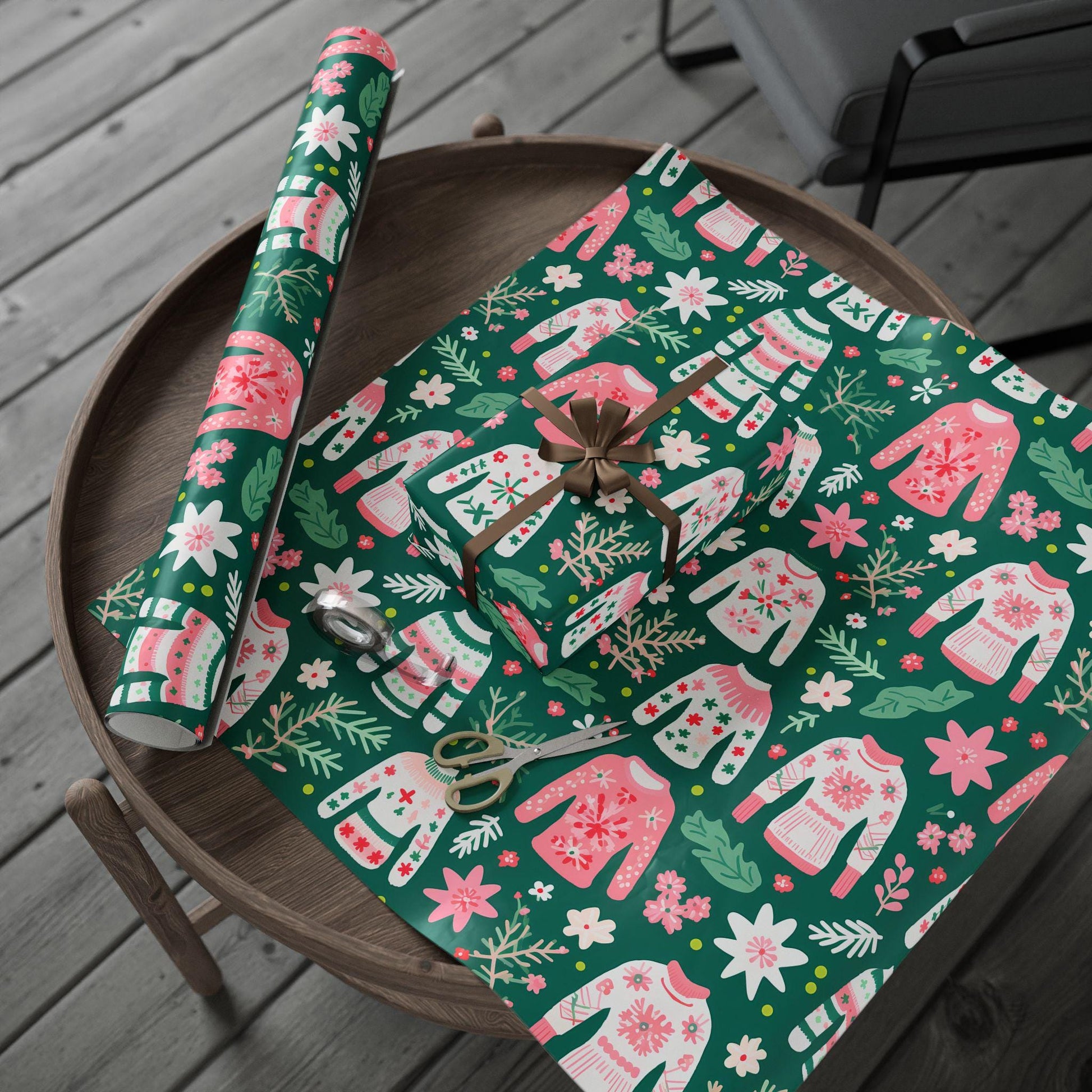 Perfect for wrapping Christmas morning presents, Secret Santa gifts, or holiday party favors, this festive sweater gift wrap is both fun and chic. The mix of pink, green, and cream makes it ideal for anyone who loves whimsical holiday décor, girly Christmas themes, and playful grandmillennial style.