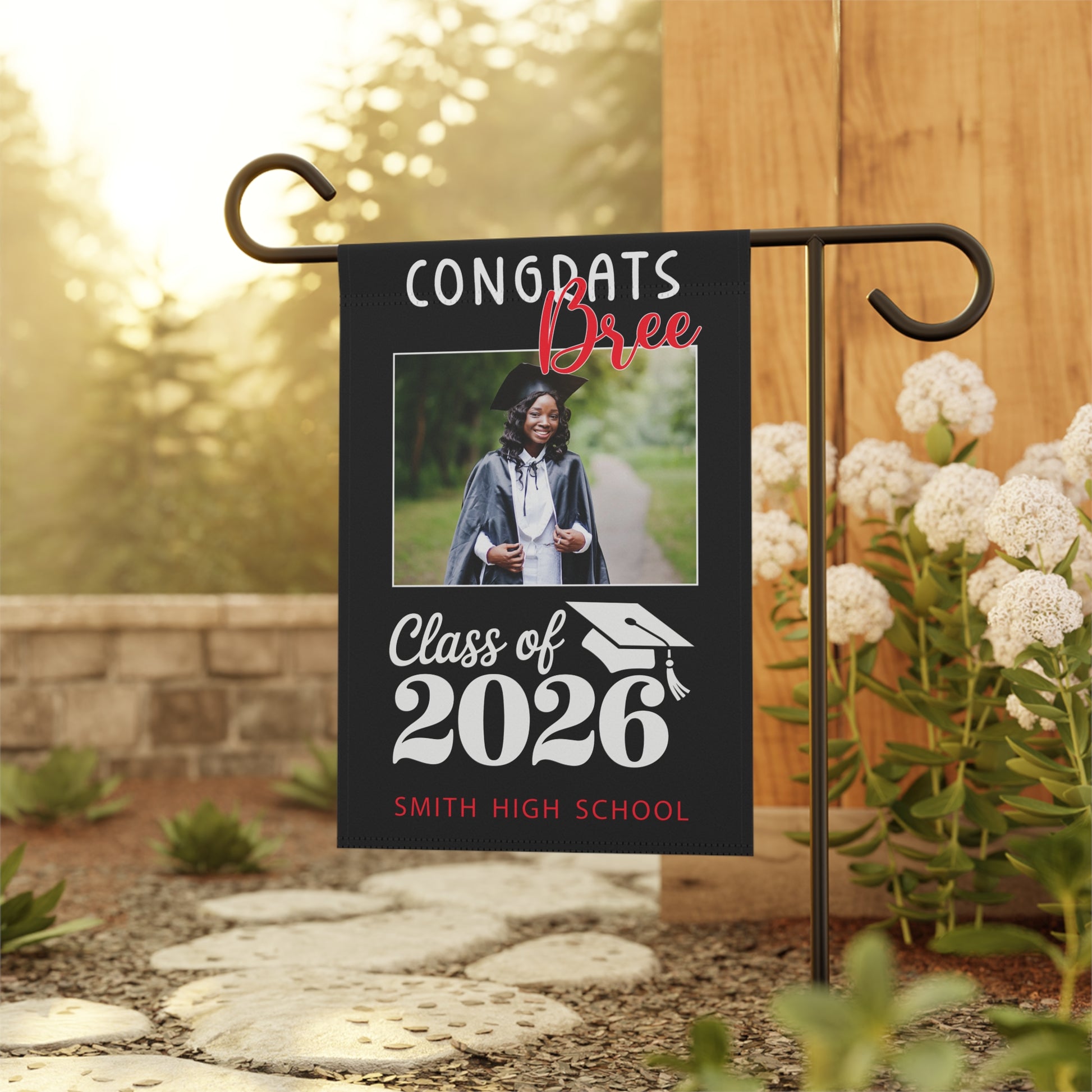 Show off your 2026 graduate with this fully personalized graduation photo garden flag — featuring their name, photo, school name, and a bold Class of 2026 design with a graduation cap icon.