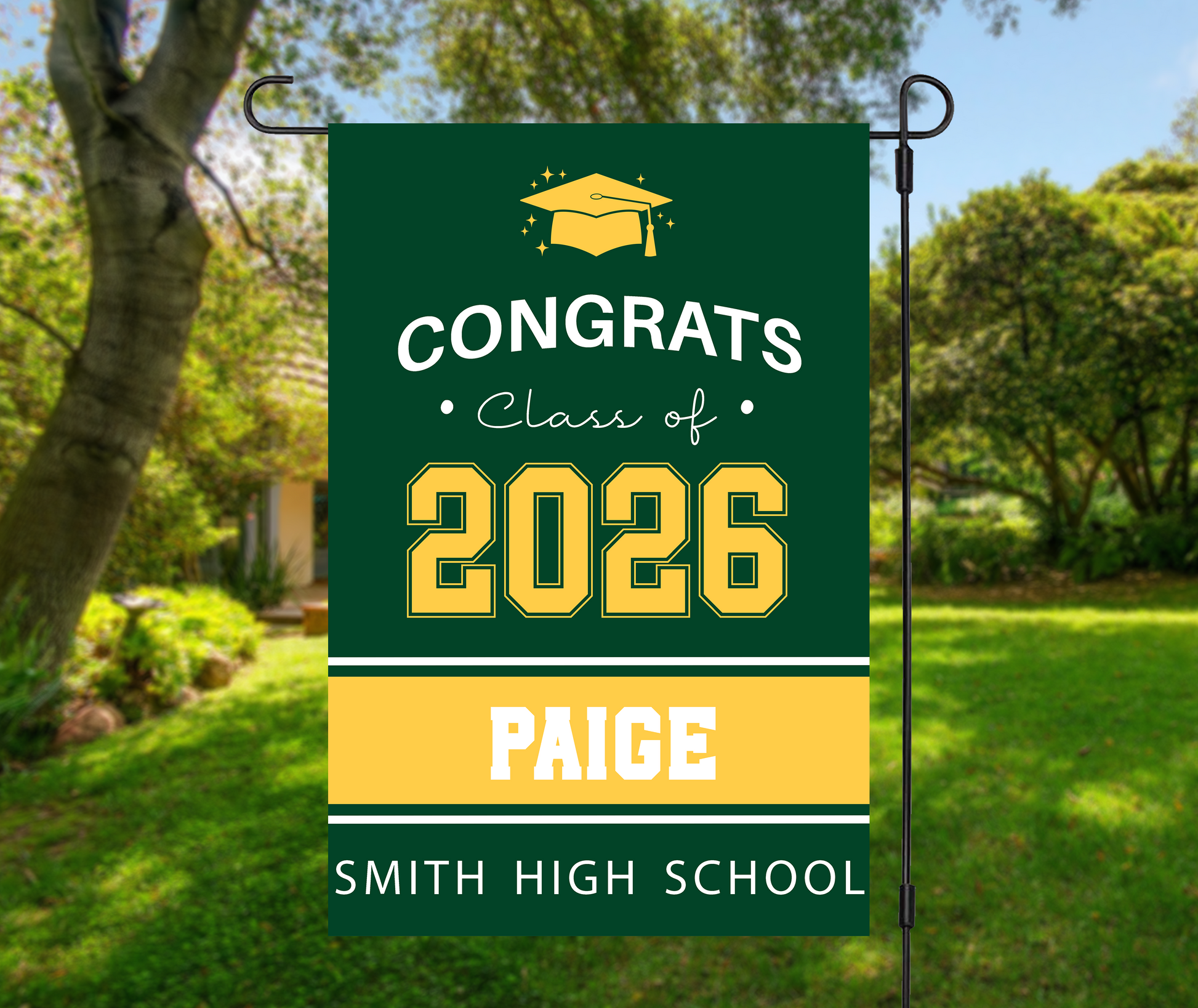 This custom graduation garden flag features bold varsity-style “Class of 2026” text, a congratulatory cap graphic, and includes the graduate’s name and school name — all printed in your chosen school colors!