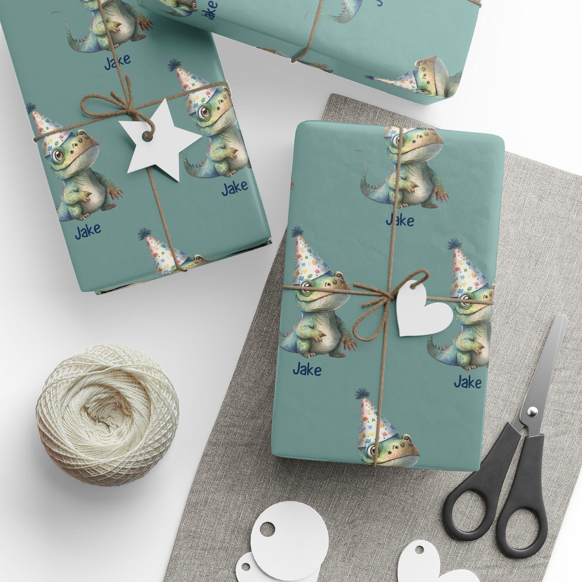 Make birthday gifts extra special with this fun and whimsical custom dinosaur wrapping paper featuring a cute green dino wearing a polka-dot party hat! Each dinosaur is personalized with your name of choice, making this the perfect one-of-a-kind gift wrap for boys and girls who love dinos and birthdays.