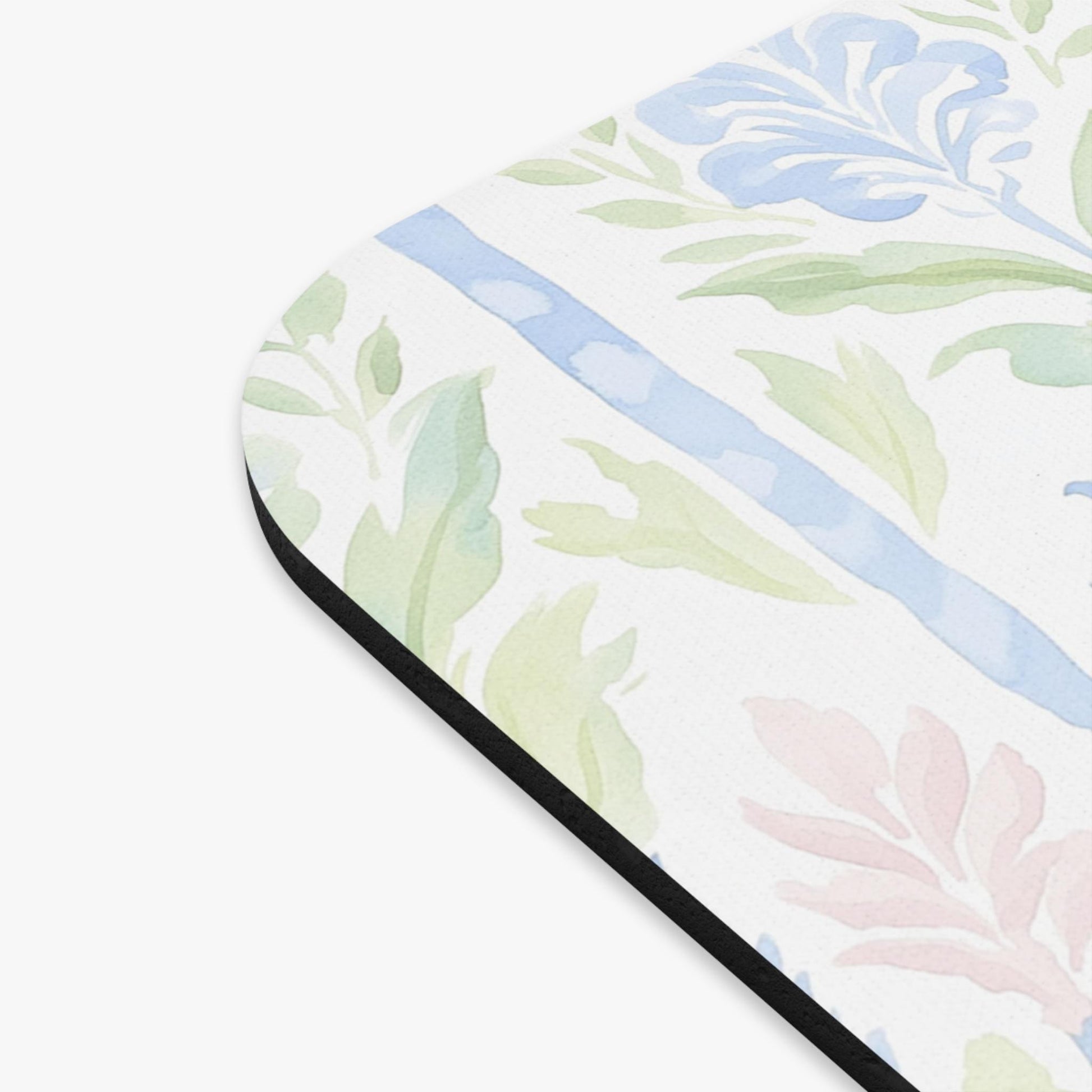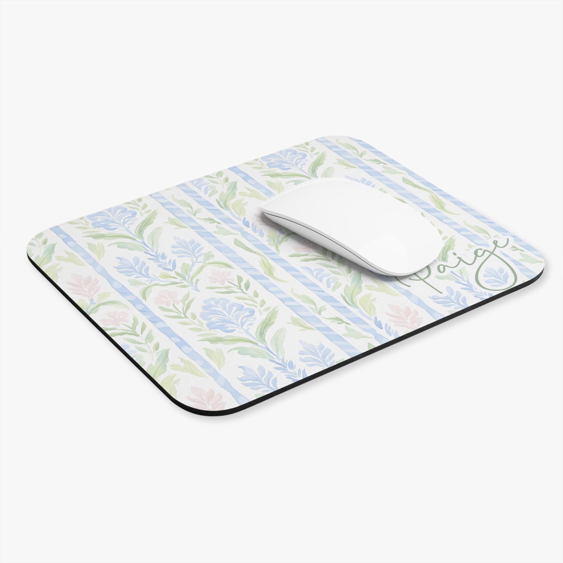 Brighten your desk with this personalized grandmillennial-style mouse pad, featuring delicate blue, green, and blush watercolor florals with soft stripe accents. The name “Paige” is elegantly printed in script, making it a perfect blend of beauty and function for any workspace.