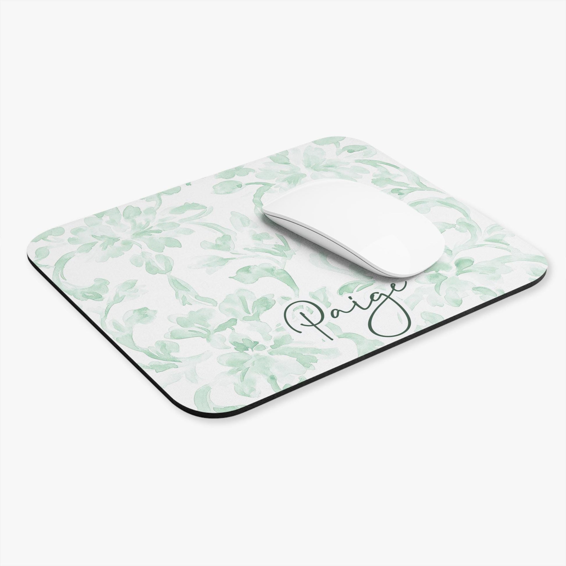Elevate your workspace with this personalized green damask mouse pad, featuring a soft watercolor floral design in a classic grandmillennial style. The name “Paige” is elegantly scripted, making this a unique desk accessory that blends timeless charm with modern personalization. Perfect for home offices, students, or gift-giving.
