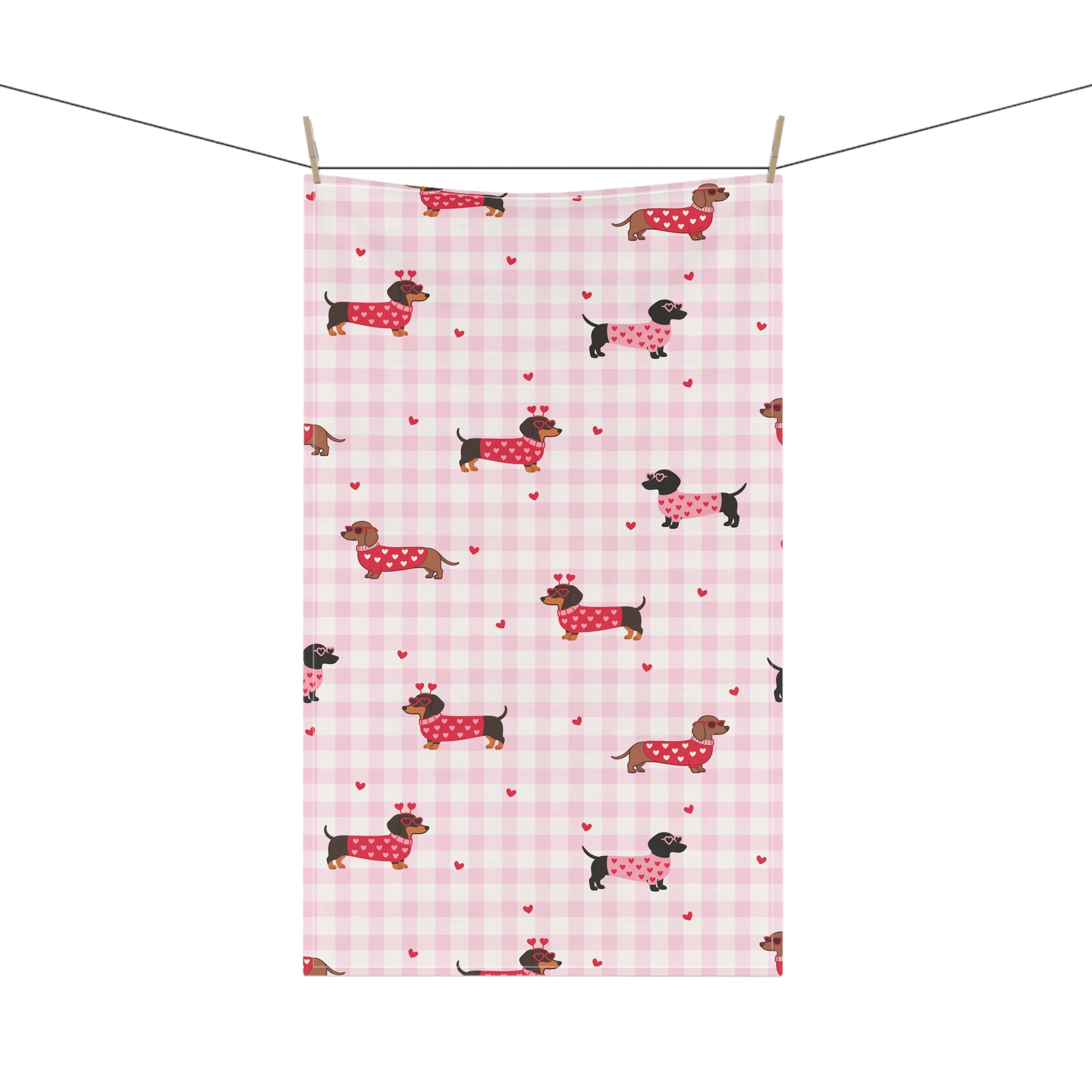 Add the cutest Valentine vibe to your kitchen with this dachshund (weenie dog) tea towel featuring adorable doxies in heart sweaters on a soft pink gingham background with tiny scattered hearts. It’s sweet, cozy, and perfect for dog lovers who want festive décor that still feels classic and clean.