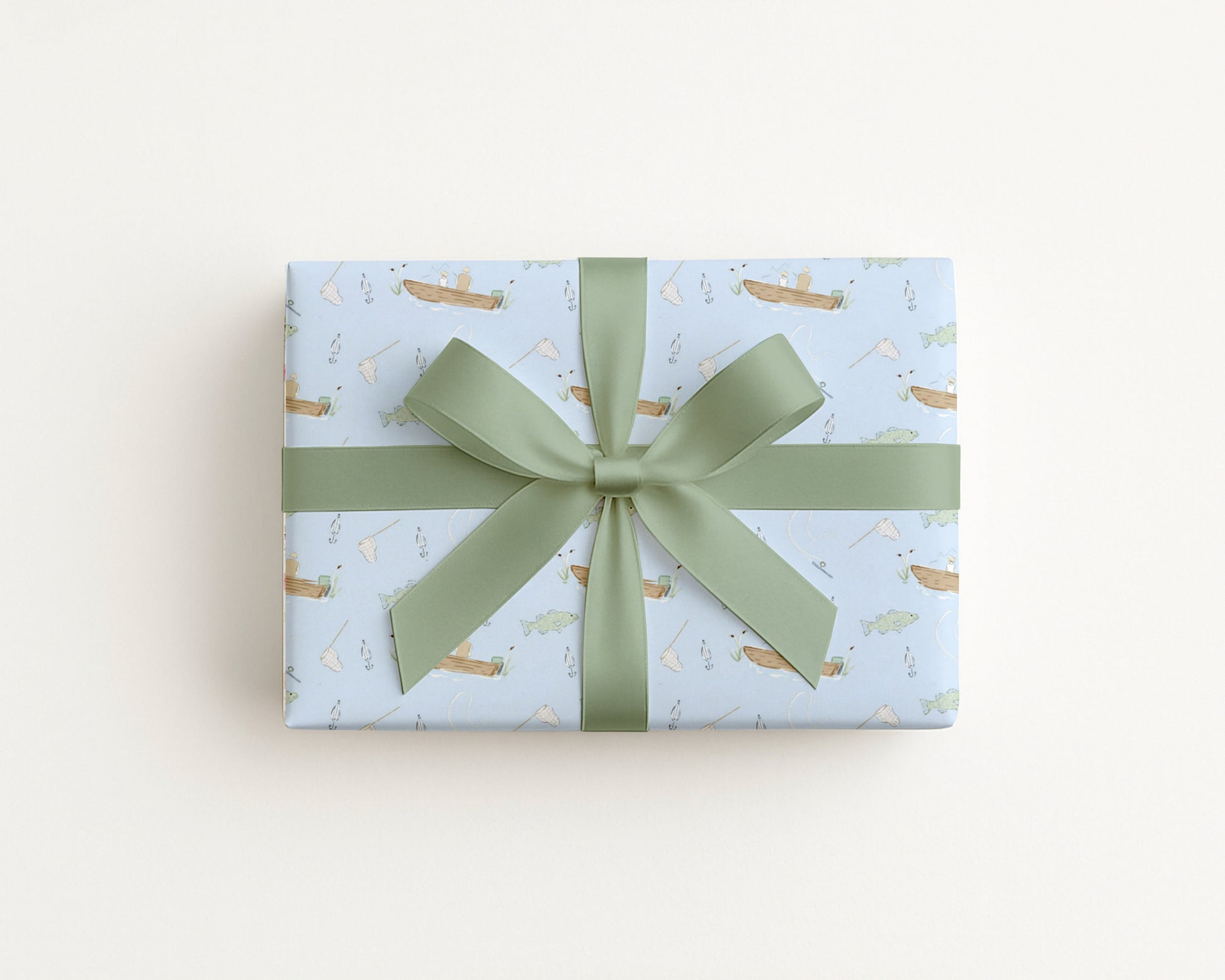 Featuring hand-illustrated scenes of two people fishing from a boat, along with fish, fishing poles, bobbers, hooks, and reeds – this gift wrap captures the tranquil charm of lake life and the joy of casting a line.