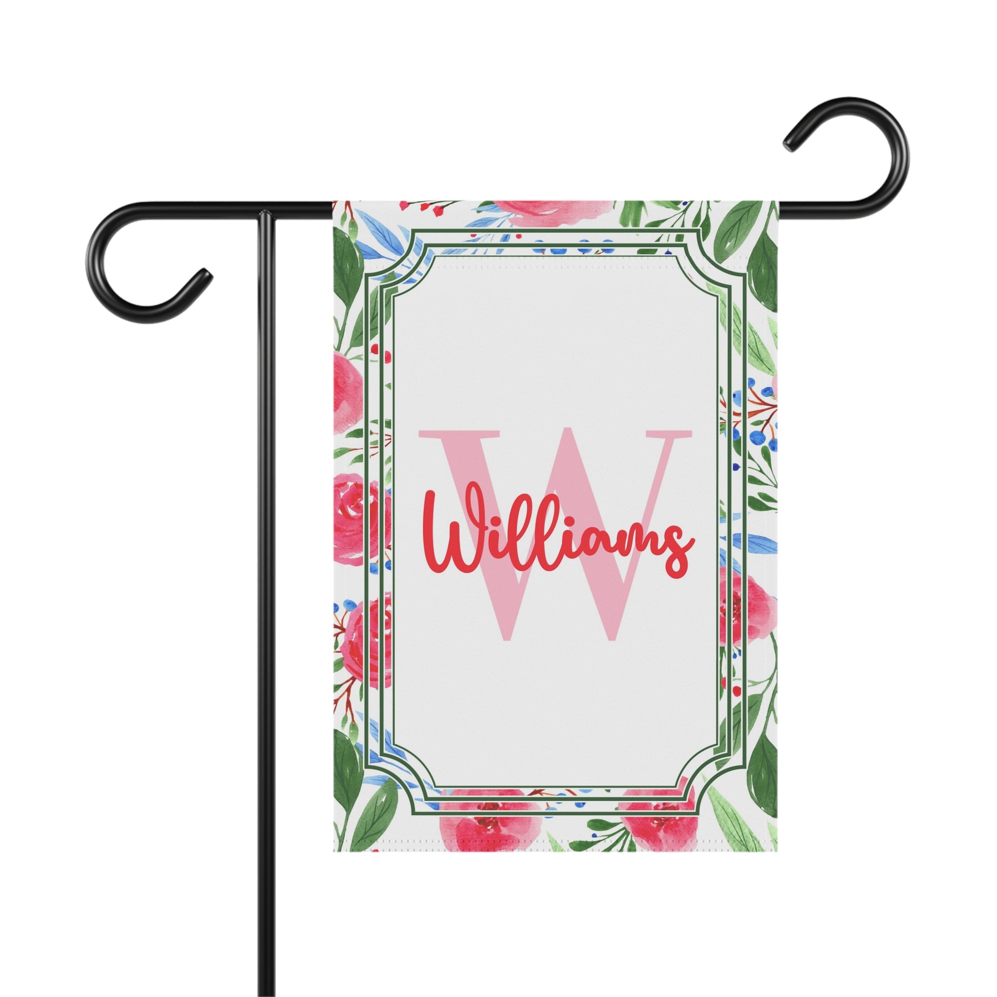 A cheerful garden and house banner that brings a fresh, floral touch to porches, patios, and entryways. Printed on lightweight poly poplin-canvas, the design shows bright, watercolor-style blossoms framing a central monogram area — a soft background initial with a flowing script name layered over it. The colors are vivid and crisp thanks to modern printing, and the image appears on both sides so the artwork reads beautifully from any angle. A top sleeve slips over standard garden flag poles or stands; the banner’s black inner lining gives depth to the print while keeping the back neat. Choose between two sizes to suit a cozy porch or a larger front-yard display.