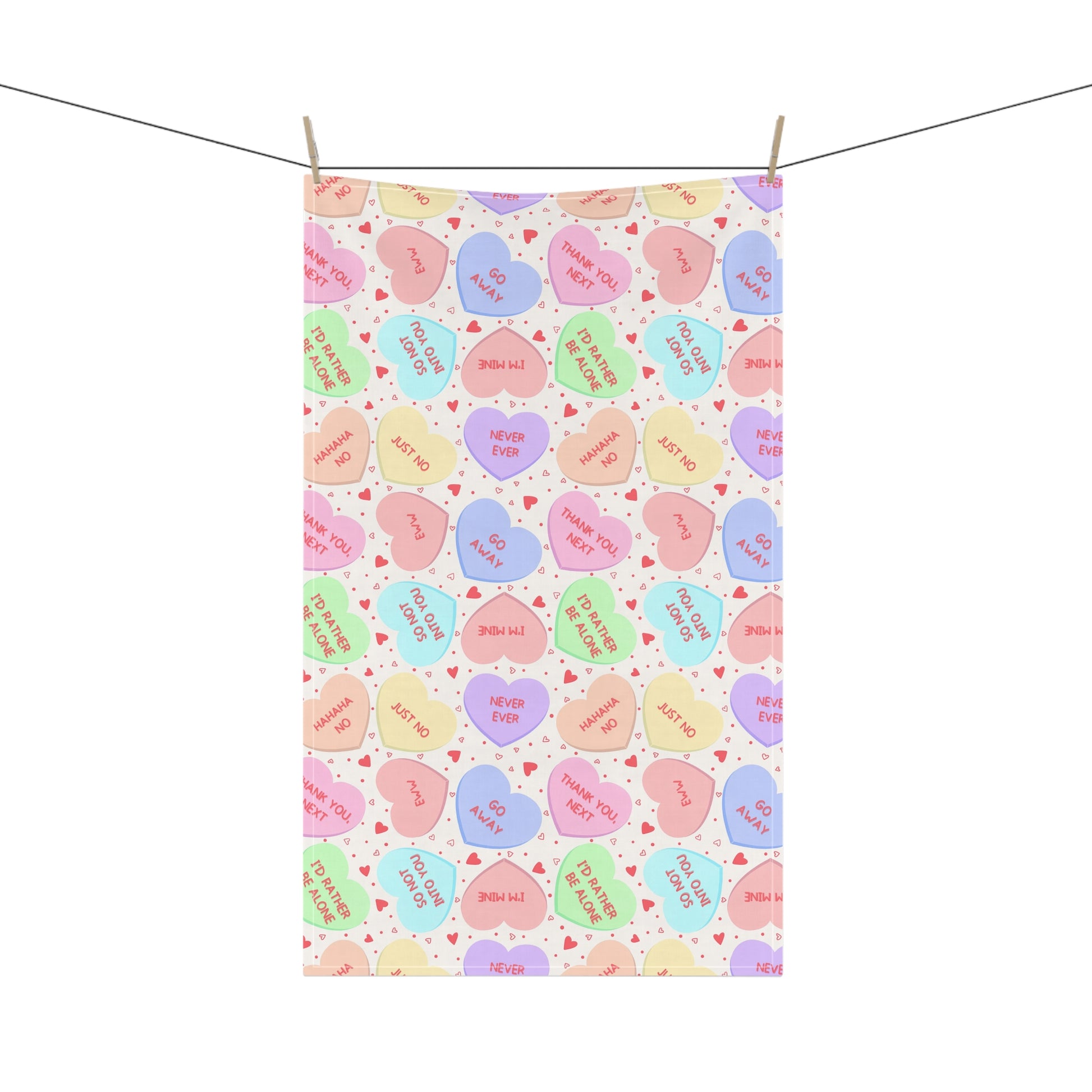 Bring a little sweet-but-savage energy to your kitchen. This funny tea towel features pastel “conversation heart” candies with snarky sayings like “HAHAHA NO,” “JUST NO,” “NEVER EVER,” “GO AWAY,” and “THANK YOU, NEXT.” It’s the perfect anti-Valentine kitchen accessory for anyone who loves cute aesthetics… with a side of attitude.