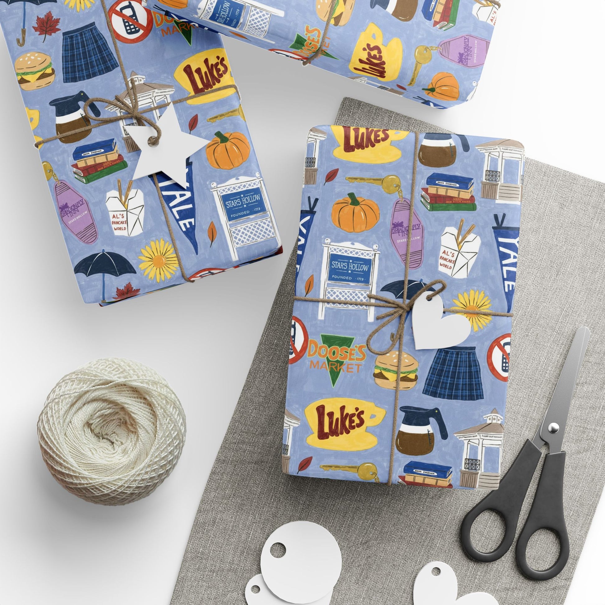 Calling all Gilmore Girls fans! Wrap your gifts in cozy Stars Hollow charm with this adorable Gilmore Girls-inspired gift wrap featuring hand-drawn icons from the beloved show. ☕📚💙