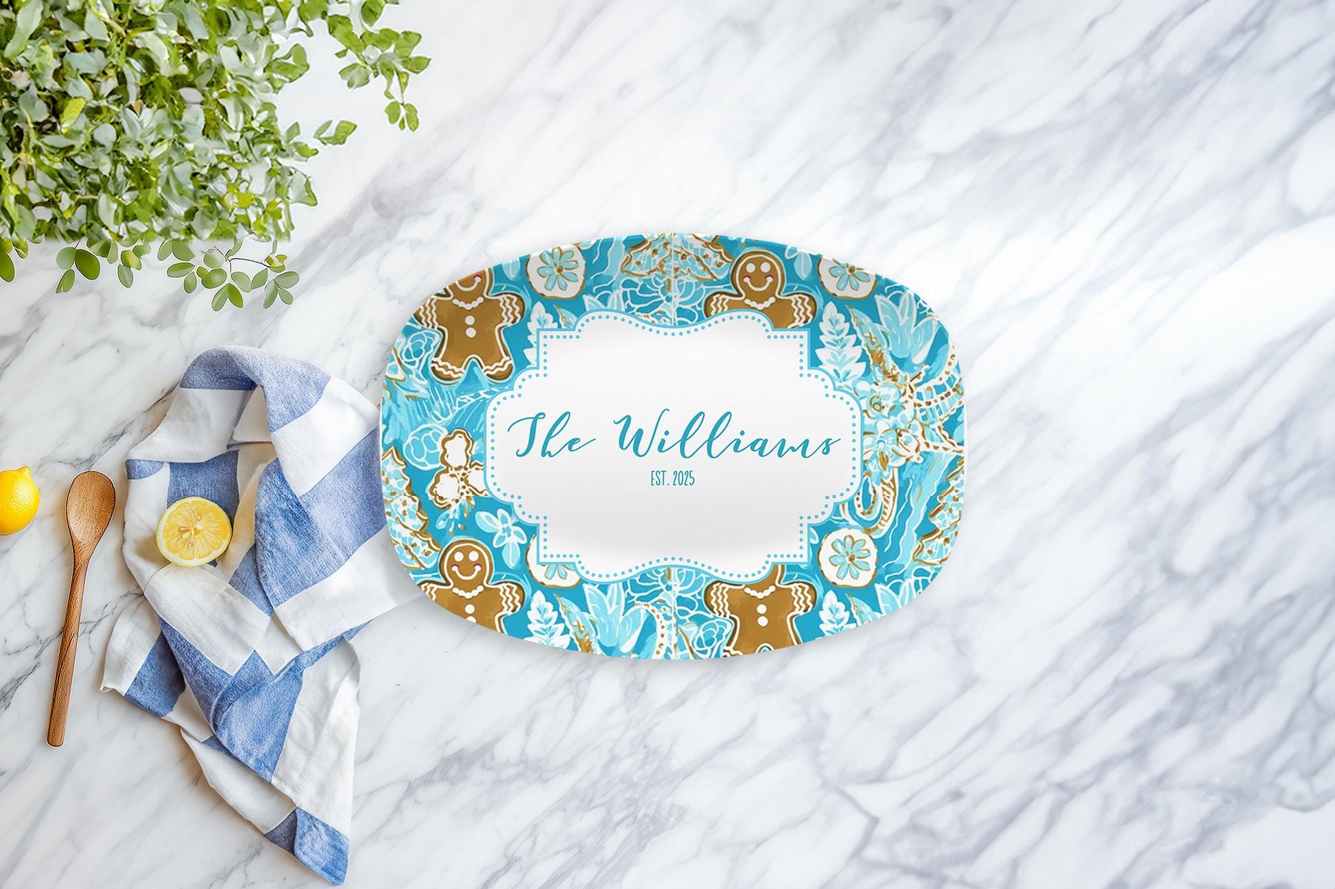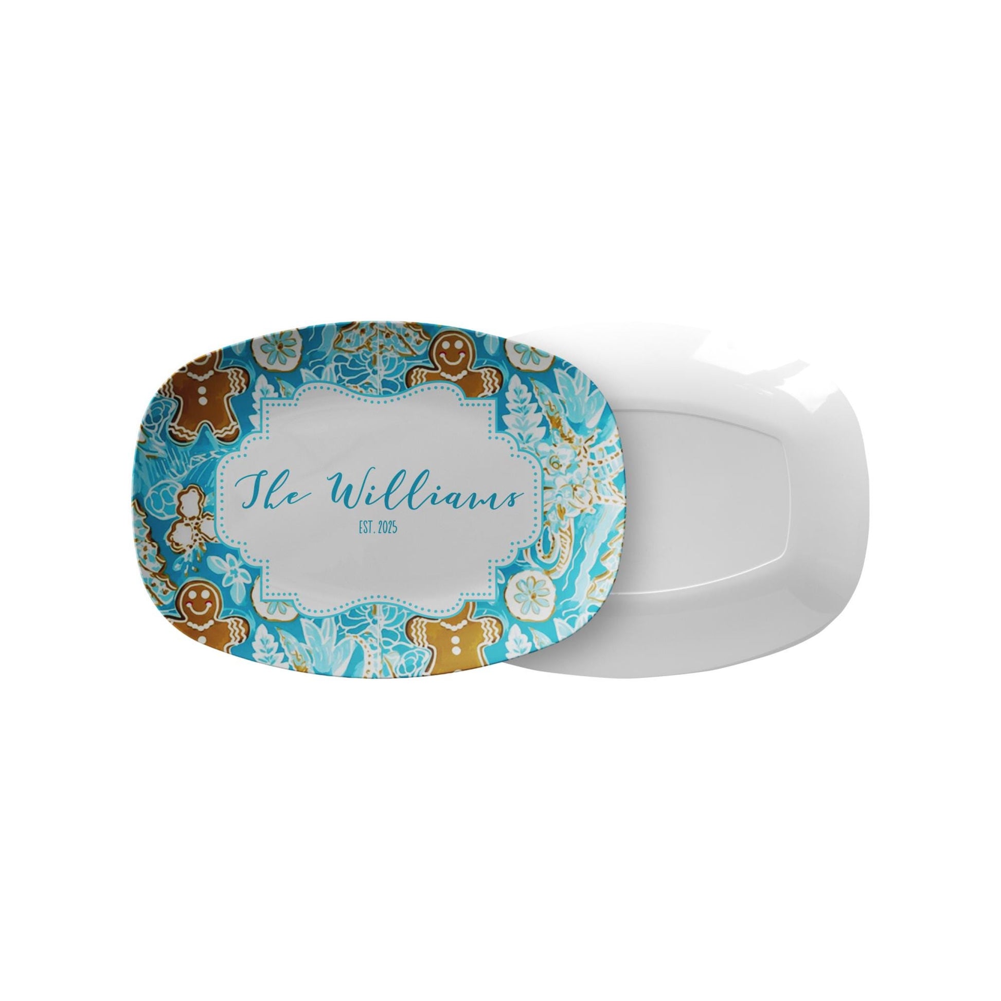 Make your holiday table extra merry with our Gingerbread Cookie Personalized Family Platter. Featuring a vibrant turquoise backdrop with gingerbread men, snowflakes, and Christmas treats, this playful design brings a whimsical twist to your seasonal gatherings. Personalize it with your family name and established year for a sweet keepsake.