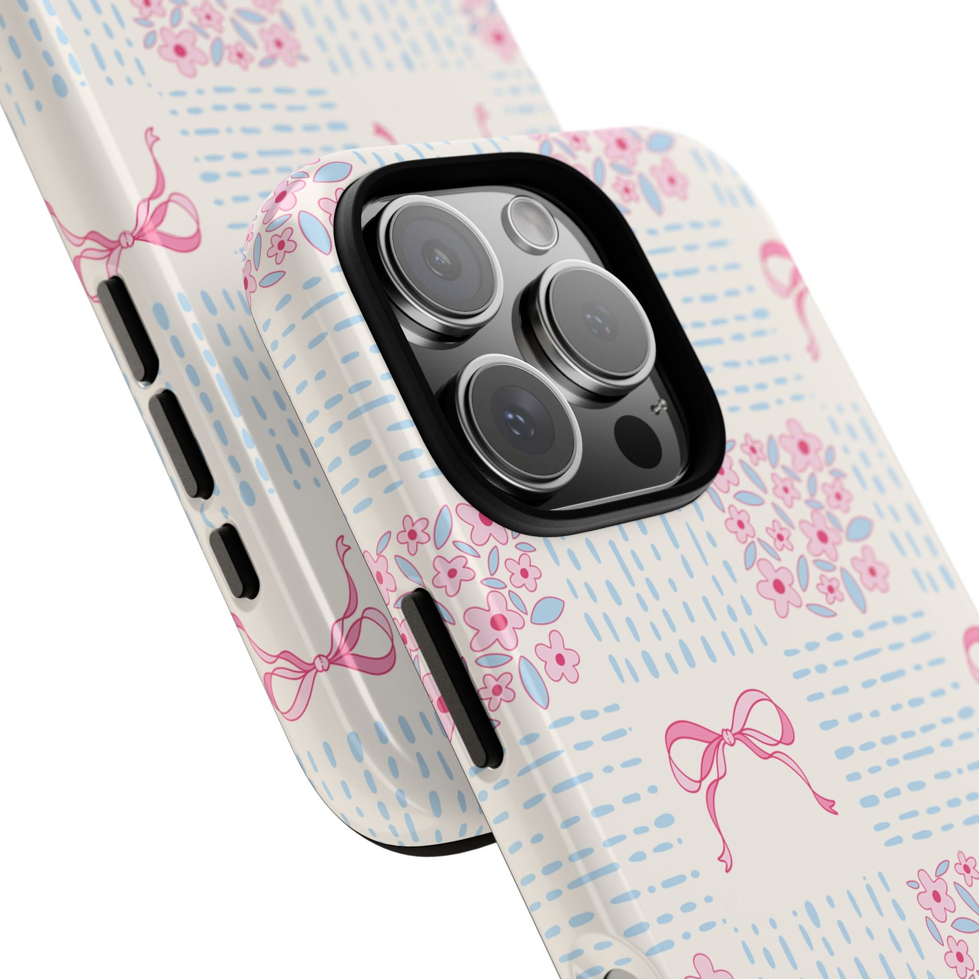 Bring vintage-pretty charm to your everyday with this personalized grandmillennial phone case! The design features a patchwork quilt-inspired pattern with pink floral blocks, blue stitched detailing, and sweet pink bows on a soft cream background—finished with your custom initials/monogram for that polished, preppy look. Perfect for coquette lovers, cottagecore fans, and anyone who loves classic feminine style.