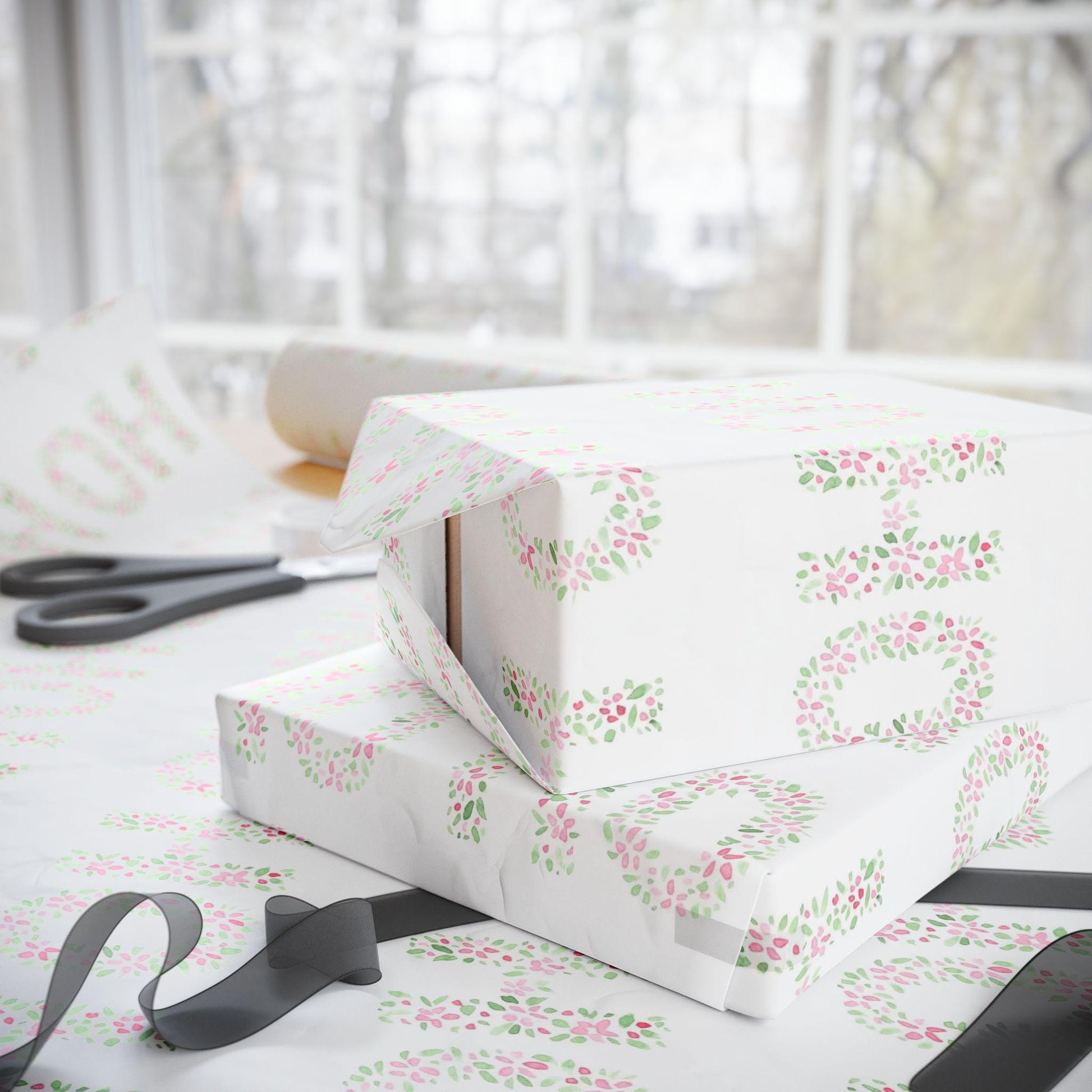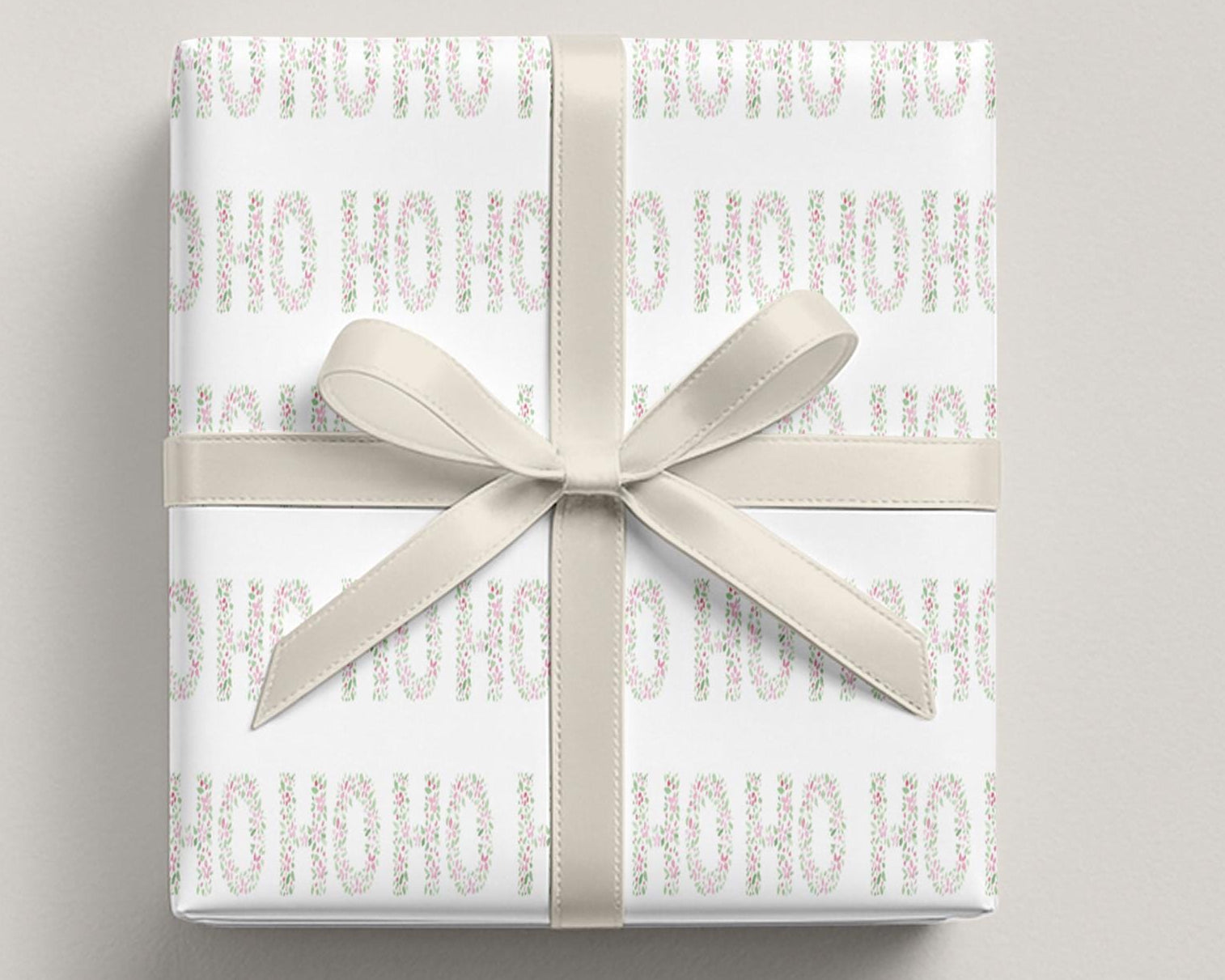 Featuring hand-painted watercolor letters made up of delicate leaves and festive florals, this wrapping paper captures the joy of Christmas in a soft, modern palette of blush pink and fresh green. It’s a chic update on a Christmas classic — perfect for anyone who loves preppy, feminine, or pastel holiday décor.
