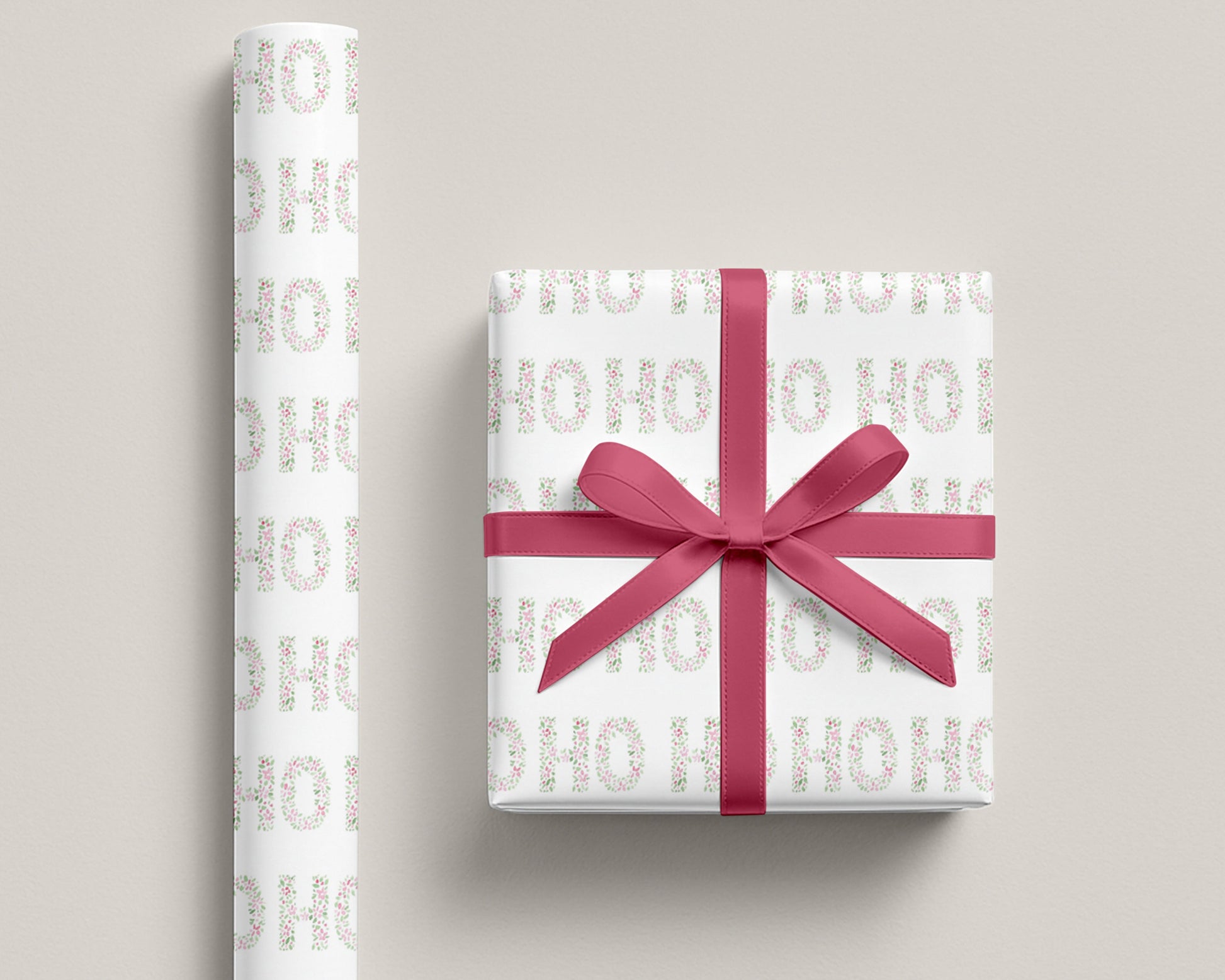 Add a playful touch of holiday cheer to your gifts with our Pink and Green “Ho Ho Ho” Watercolor Wrapping Paper!