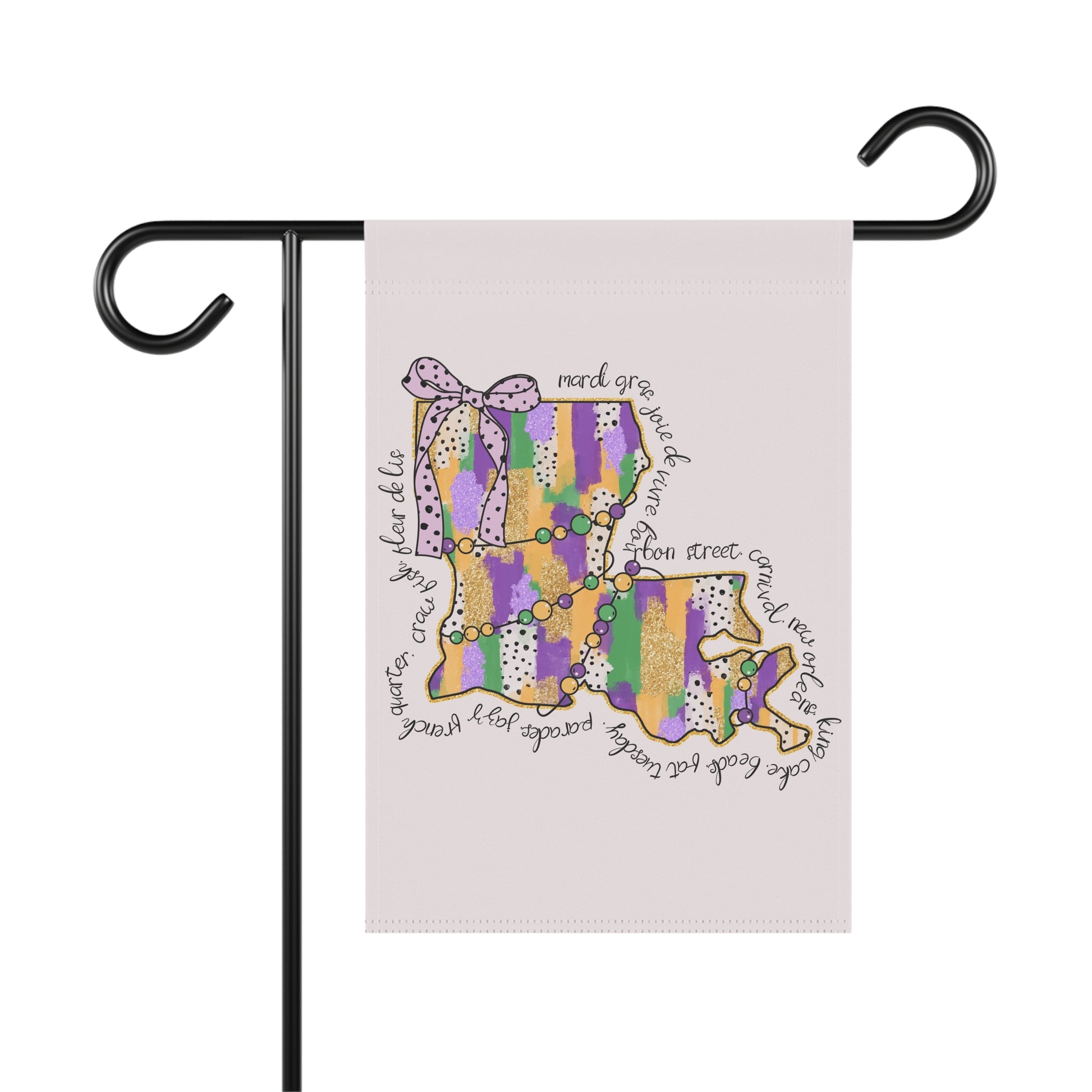 Celebrate carnival season with this fun Mardi Gras Louisiana garden flag featuring the LA state outline in classic purple, green, and gold with a bead strand and a cute bow. The hand-painted, glittery-look brushstrokes give it that festive New Orleans / NOLA vibe—perfect for porches, patios, and party-ready yards.