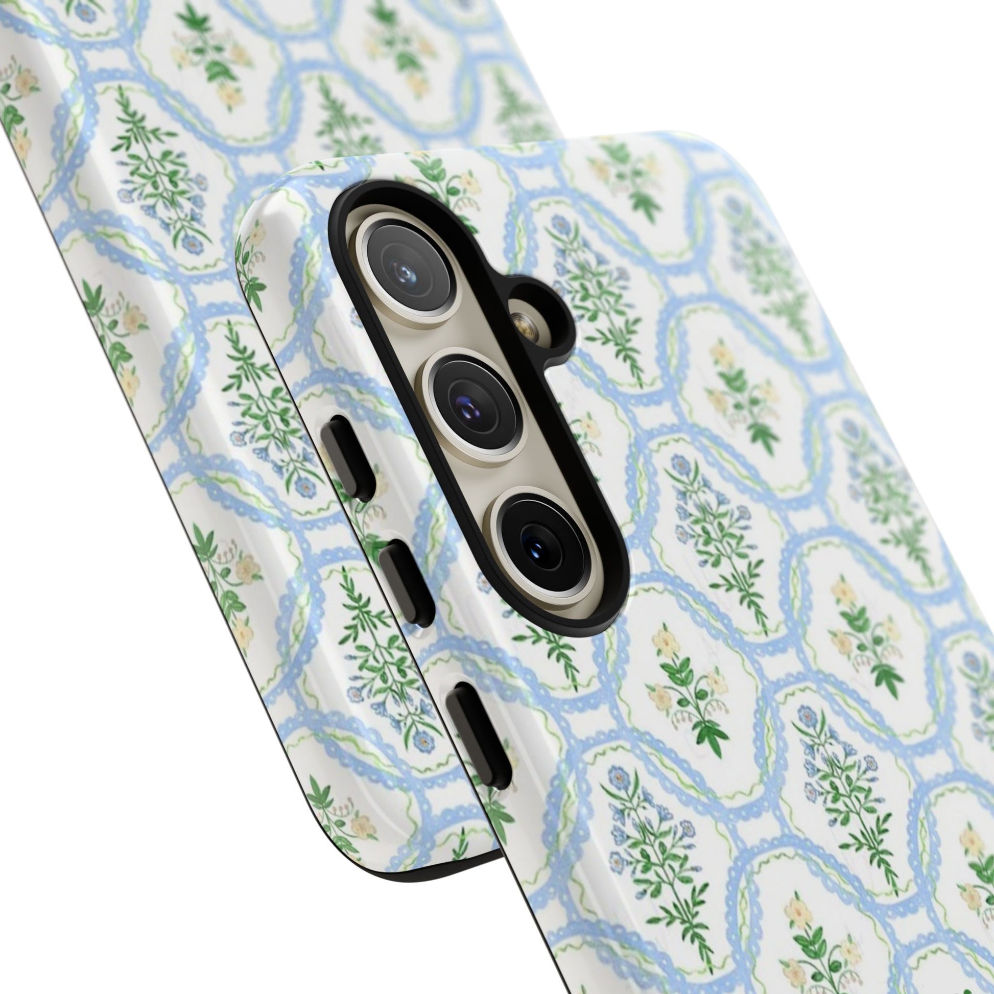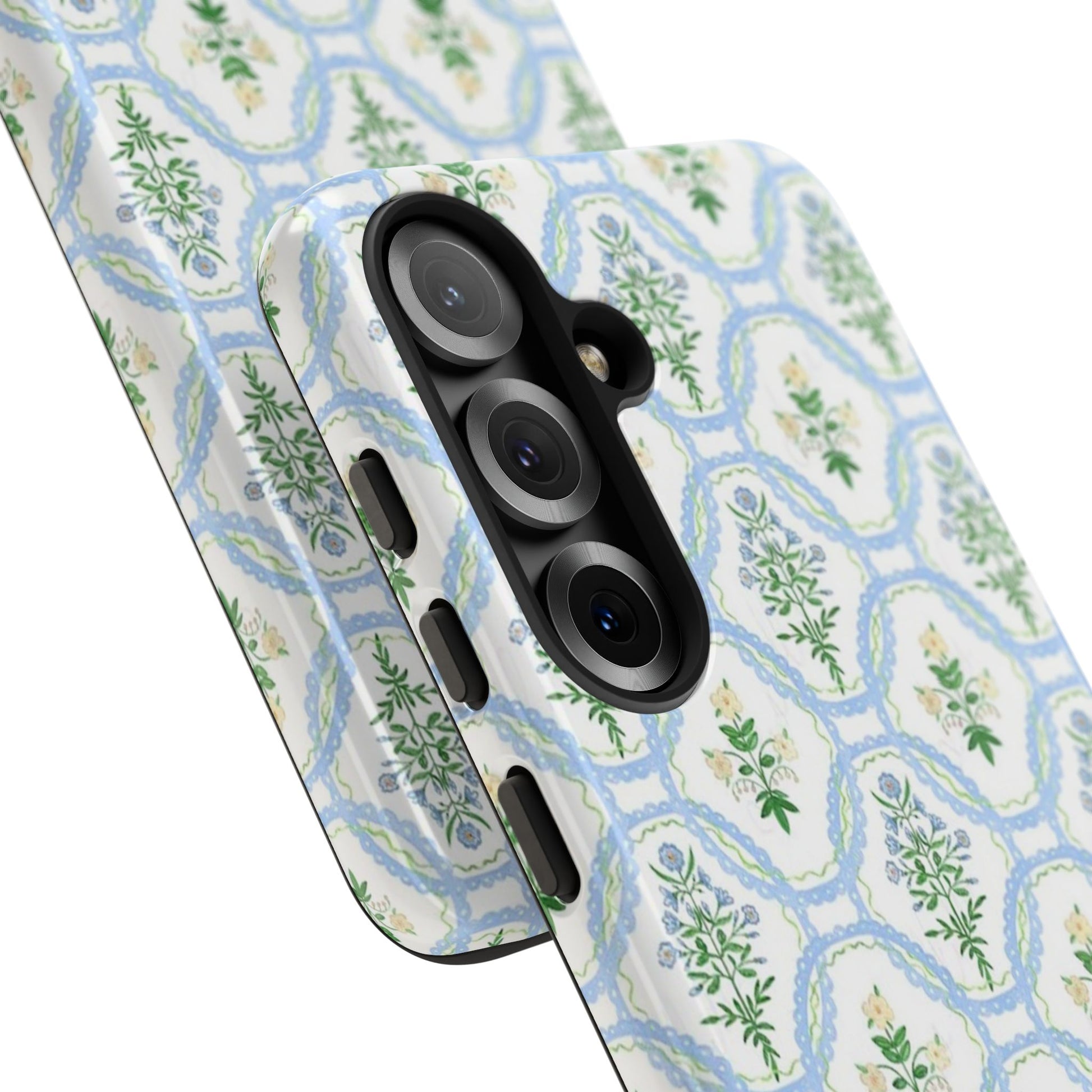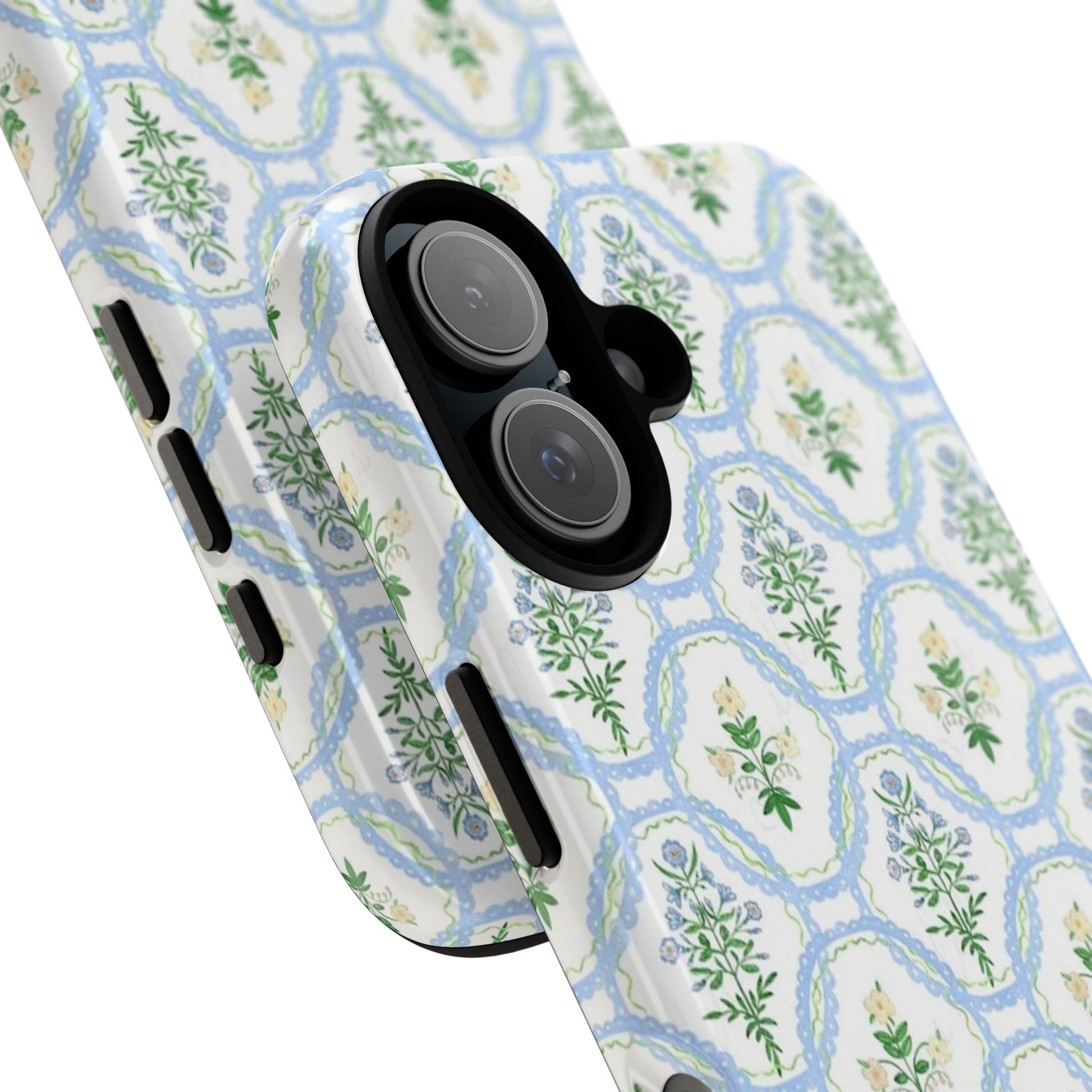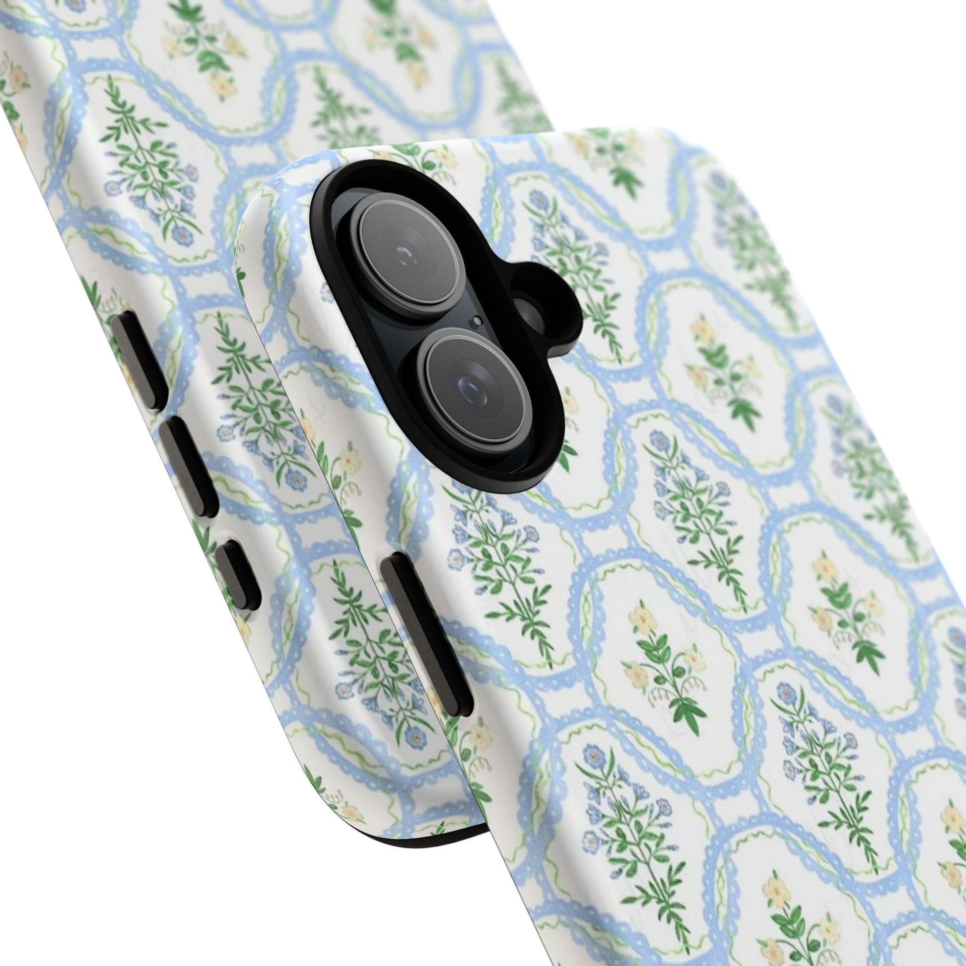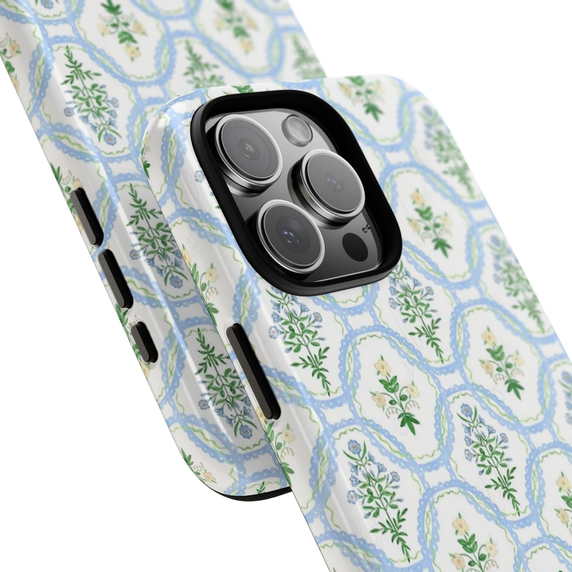 A slim, protective phone case that brings a soft, botanical elegance to your daily carry. The delicate repeating wreath pattern in muted greens and sky blues creates a calm, vintage-inspired look that layers easily with both casual and refined styles. The glossy/matte finish highlights the watercolor-like texture while the raised silicone liner cushions against drops. Lightweight yet sturdy, the case keeps your device looking composed through the little bumps of everyday life—whether slipped into a tote on the way to a brunch or set on the bedside table during a slow morning.