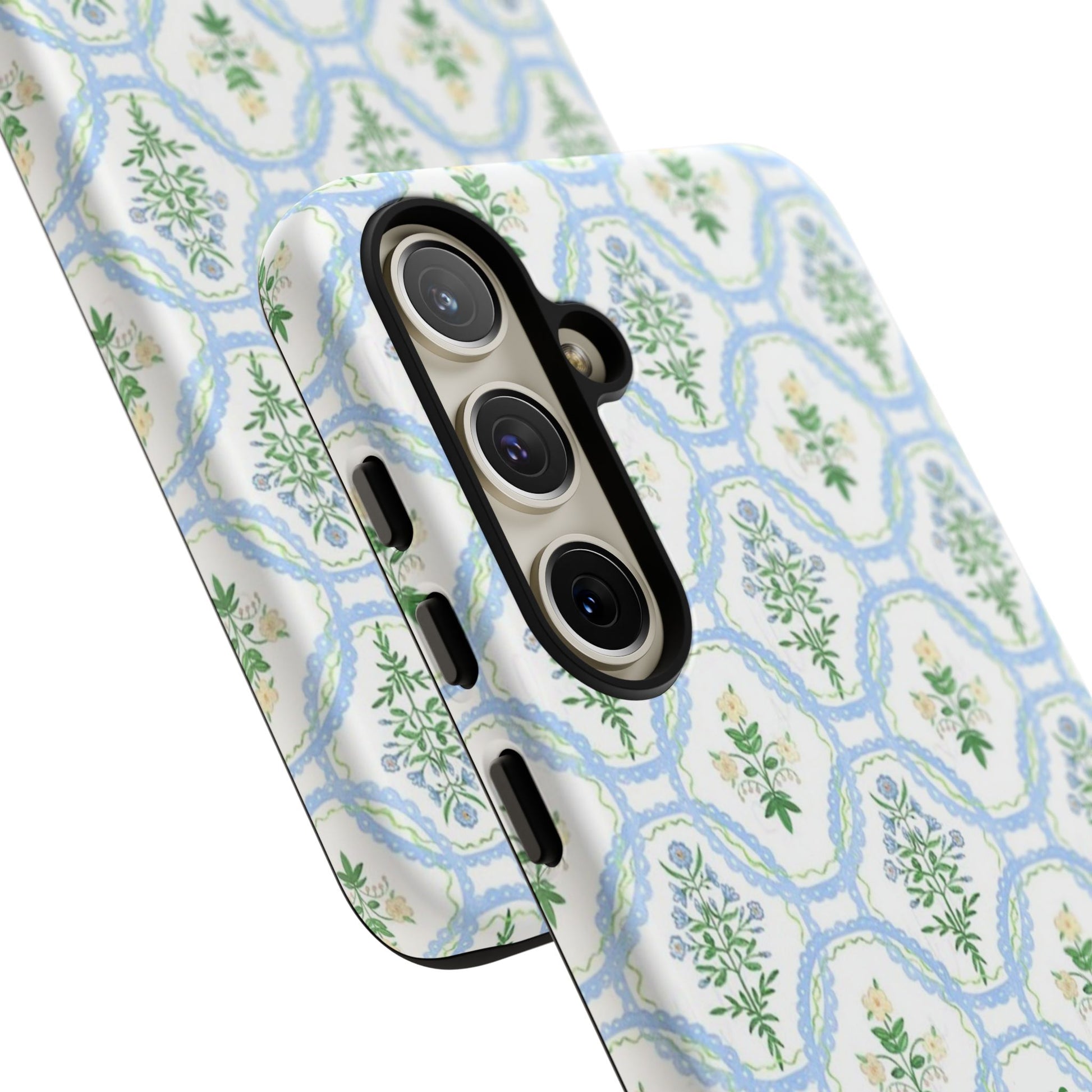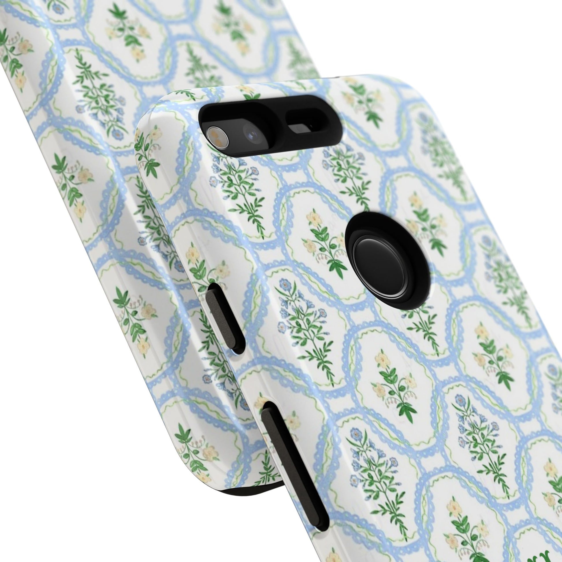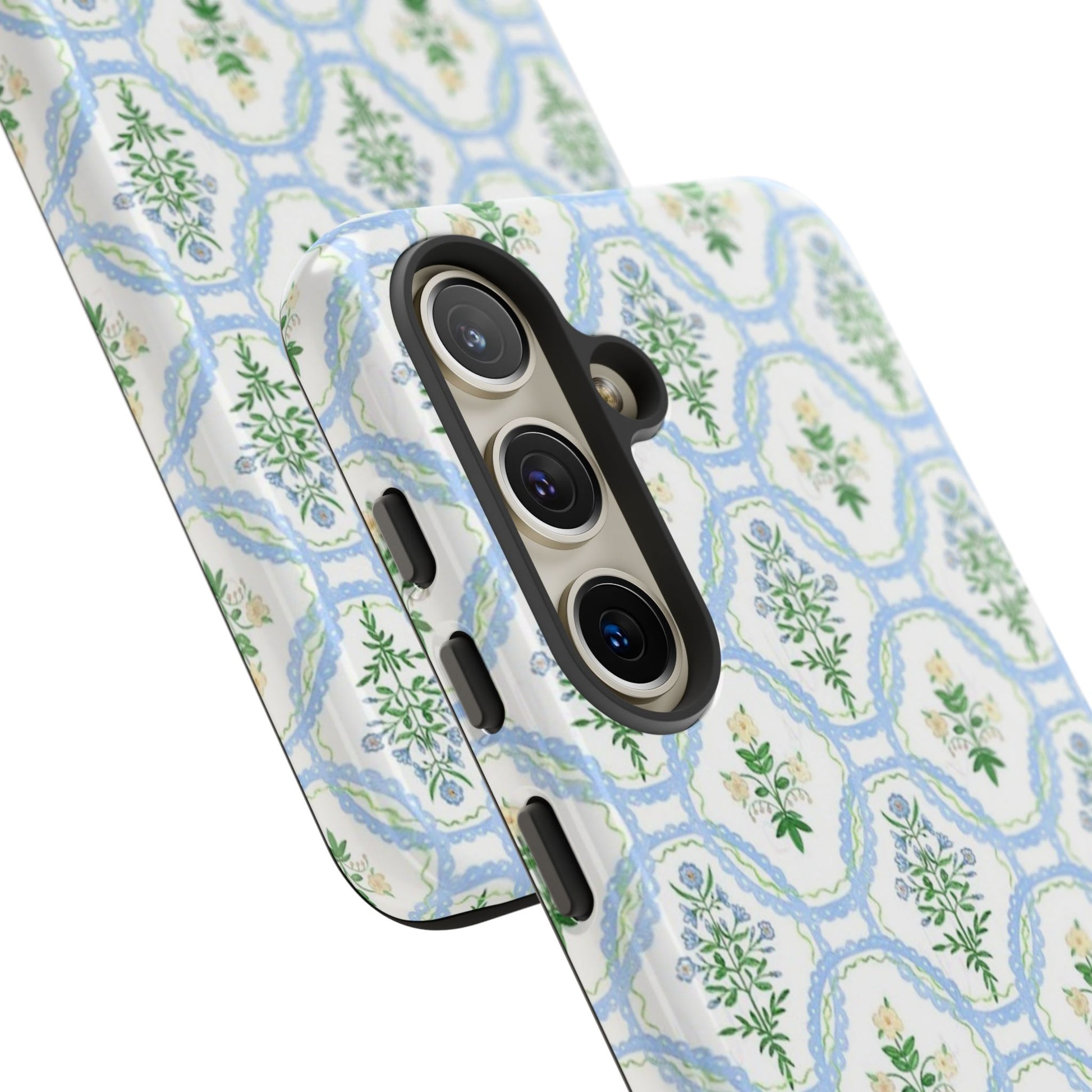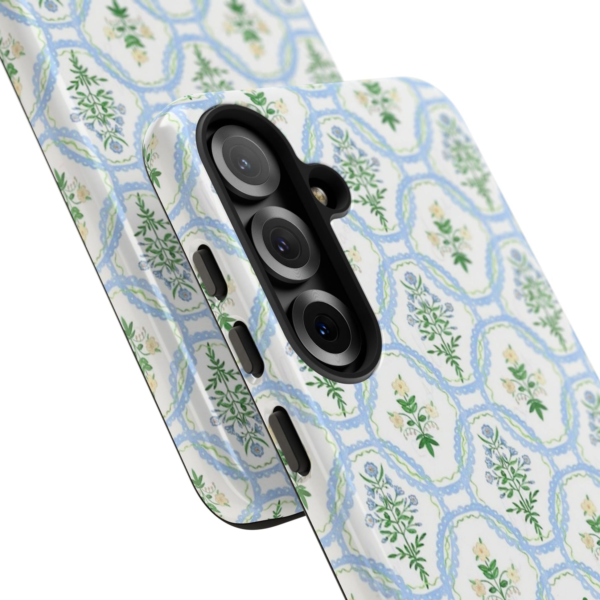 A slim, protective phone case that brings a soft, botanical elegance to your daily carry. The delicate repeating wreath pattern in muted greens and sky blues creates a calm, vintage-inspired look that layers easily with both casual and refined styles. The glossy/matte finish highlights the watercolor-like texture while the raised silicone liner cushions against drops. Lightweight yet sturdy, the case keeps your device looking composed through the little bumps of everyday life—whether slipped into a tote on the way to a brunch or set on the bedside table during a slow morning.