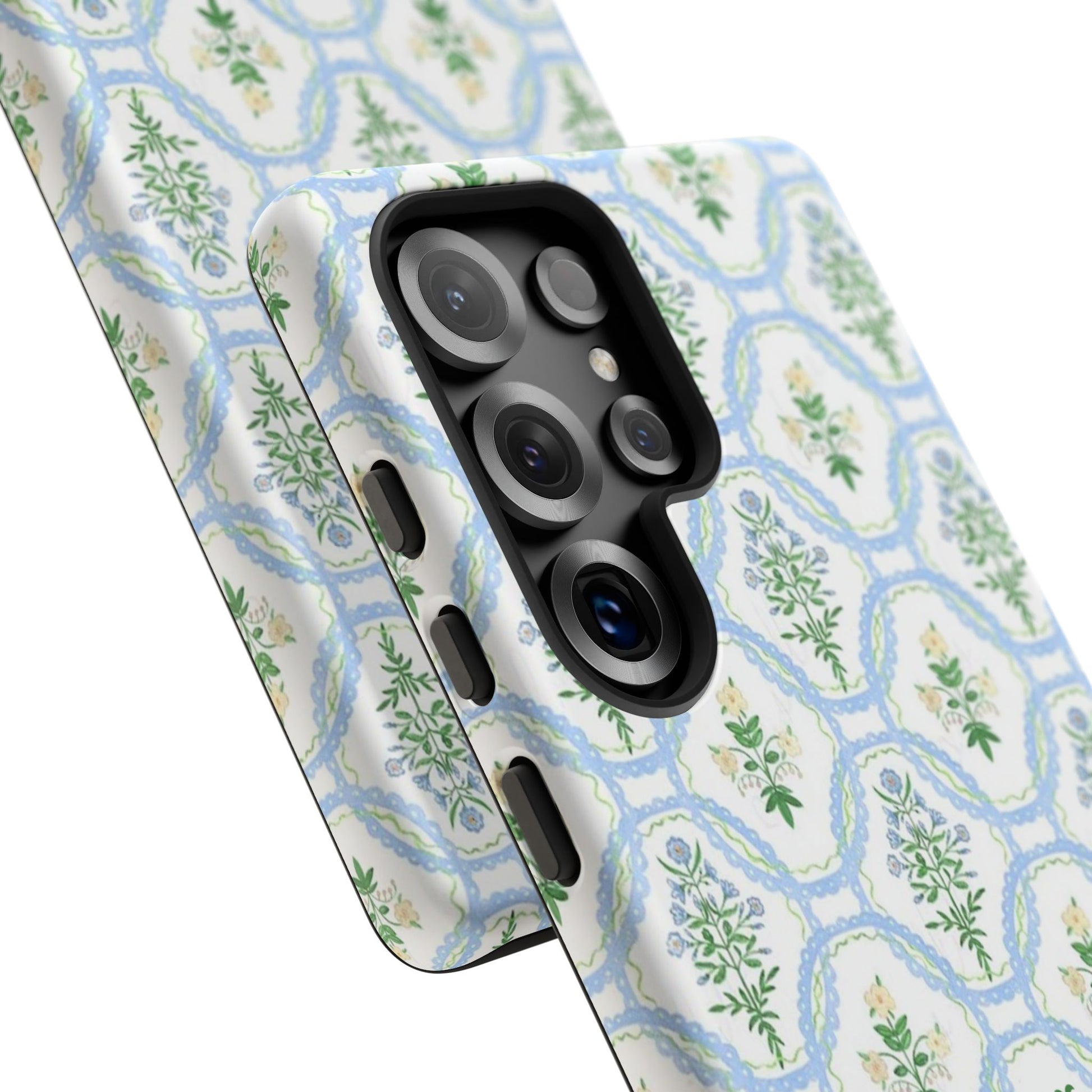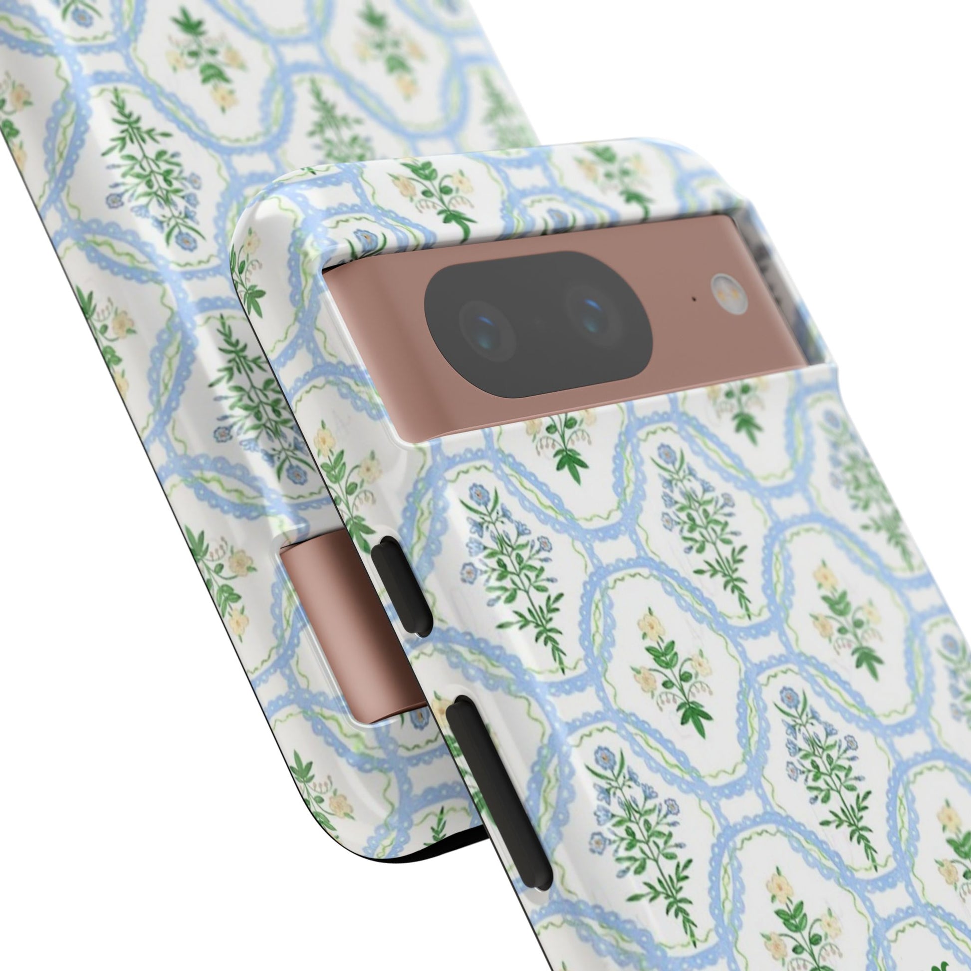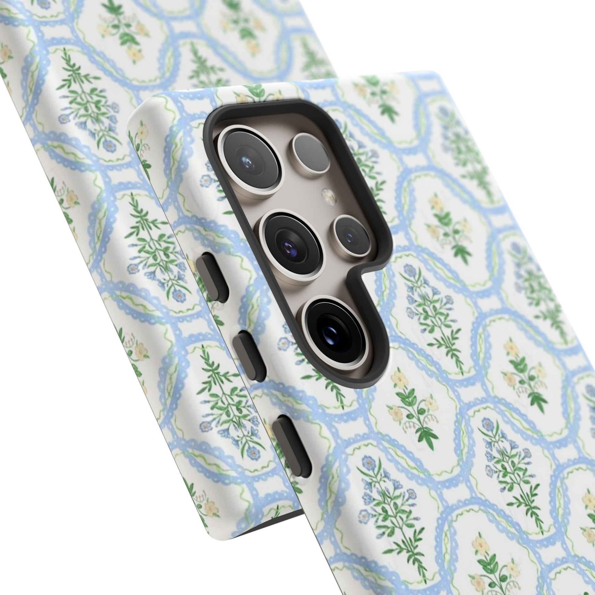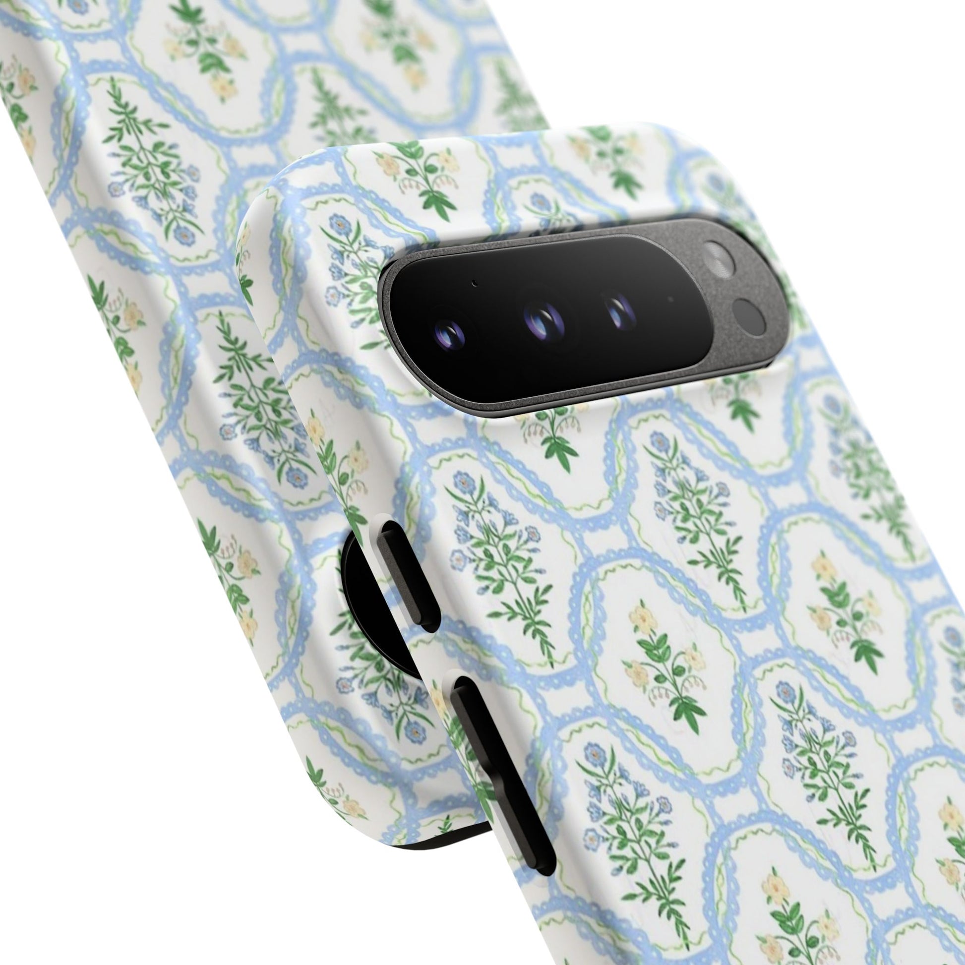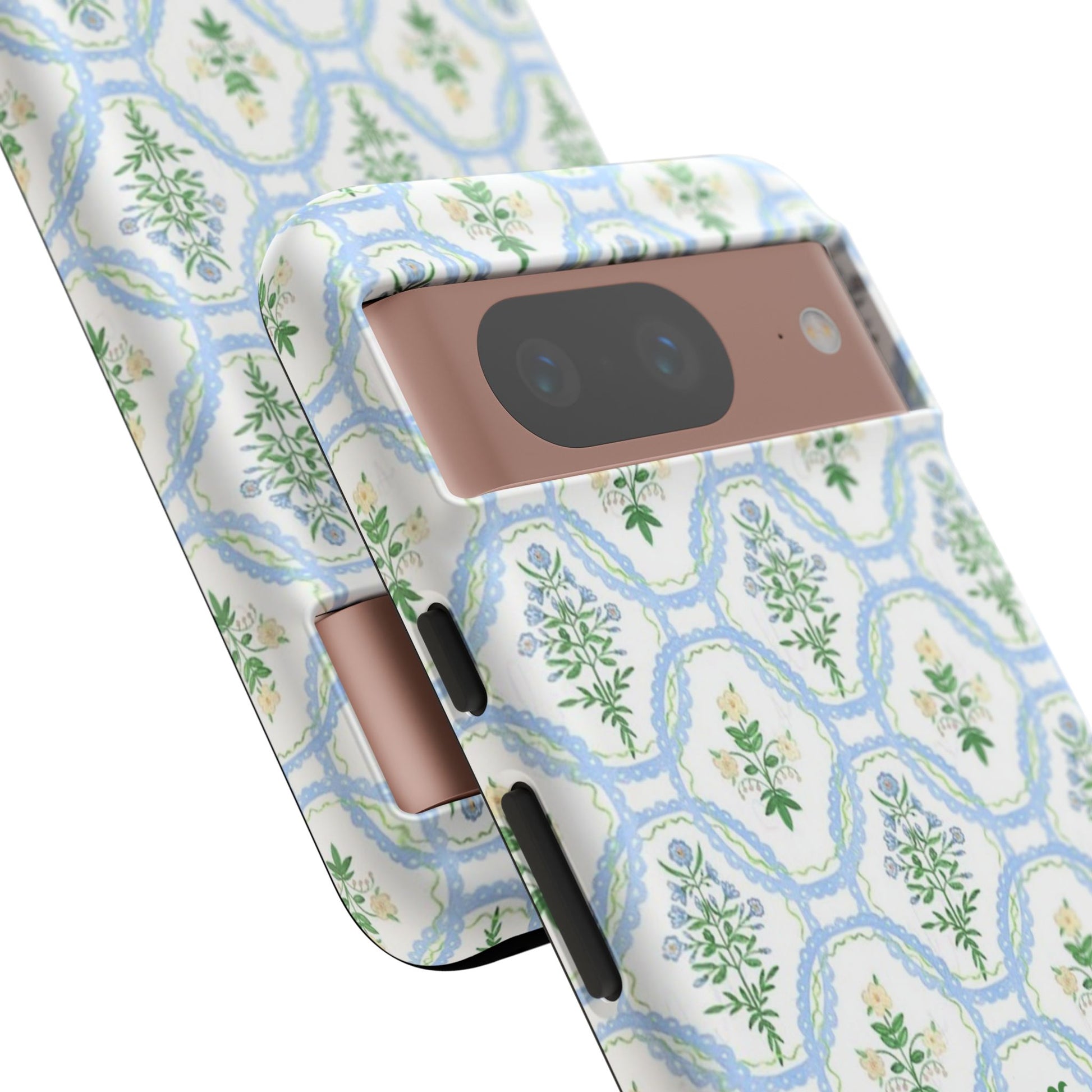A slim, protective phone case that brings a soft, botanical elegance to your daily carry. The delicate repeating wreath pattern in muted greens and sky blues creates a calm, vintage-inspired look that layers easily with both casual and refined styles. The glossy/matte finish highlights the watercolor-like texture while the raised silicone liner cushions against drops. Lightweight yet sturdy, the case keeps your device looking composed through the little bumps of everyday life—whether slipped into a tote on the way to a brunch or set on the bedside table during a slow morning.