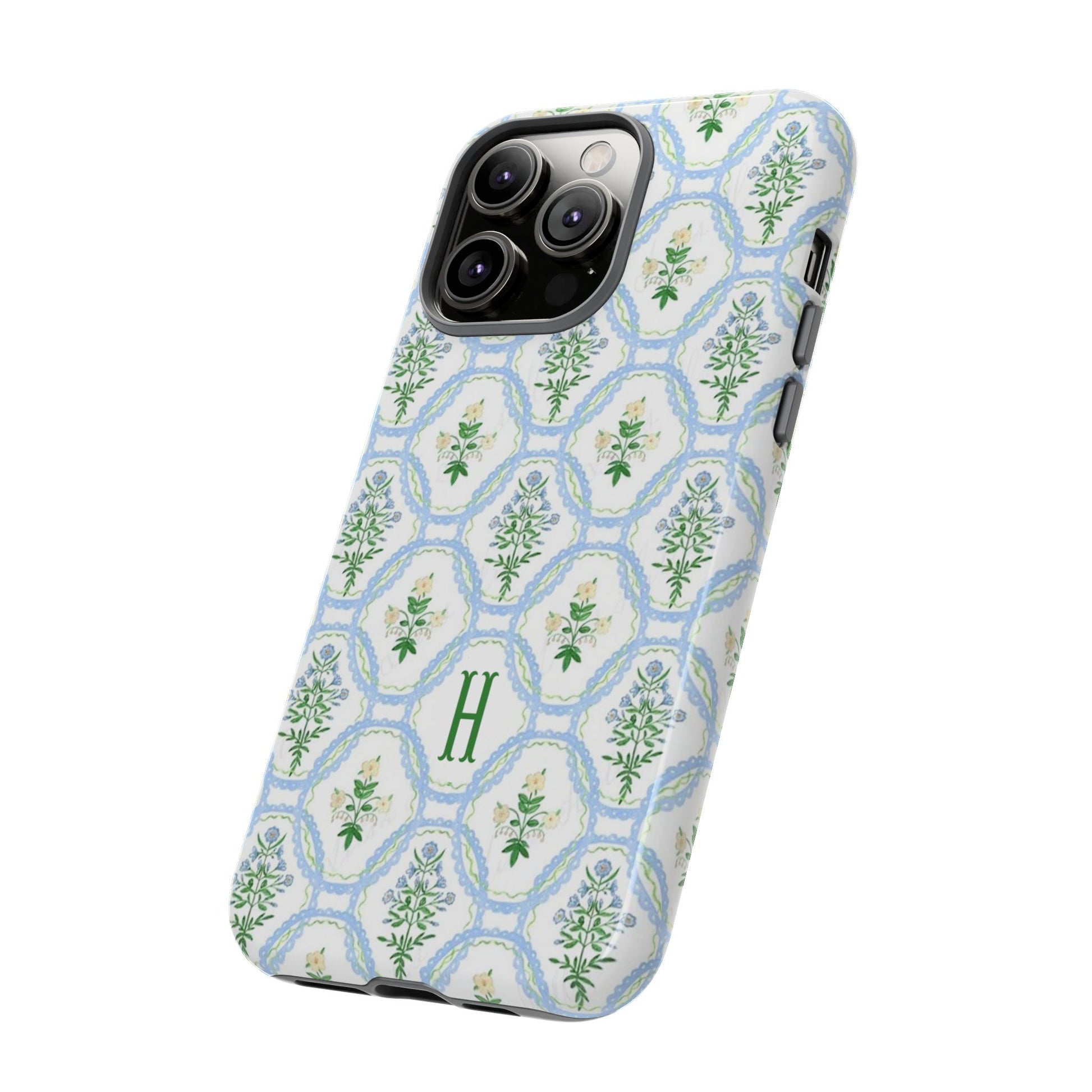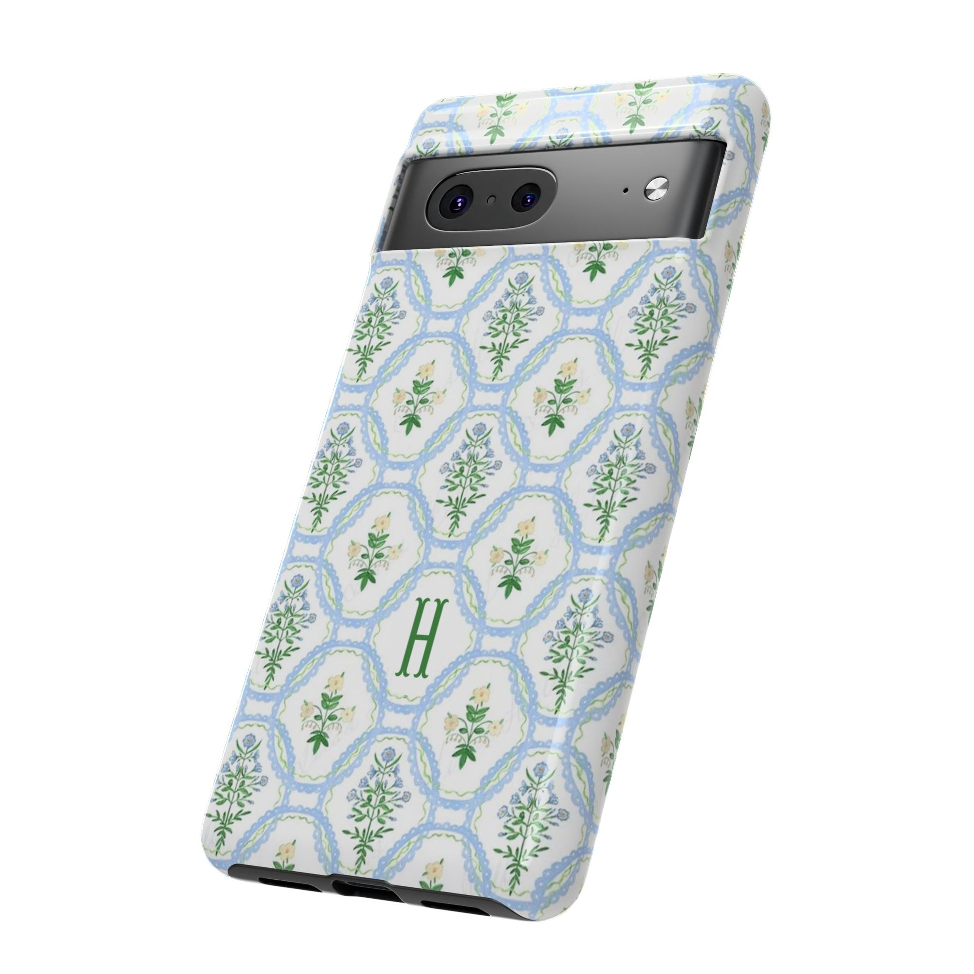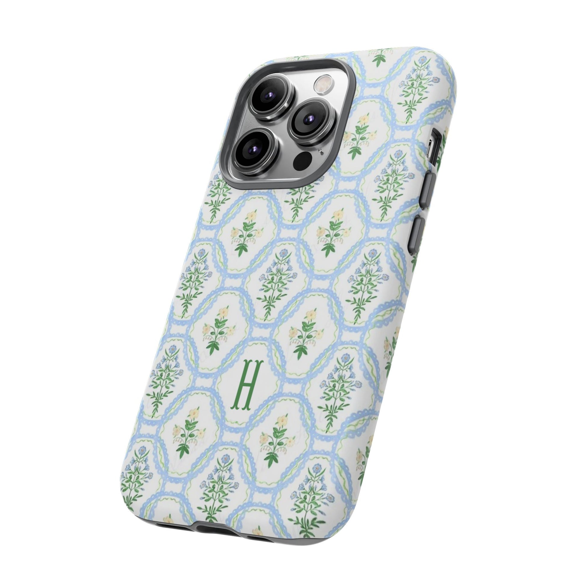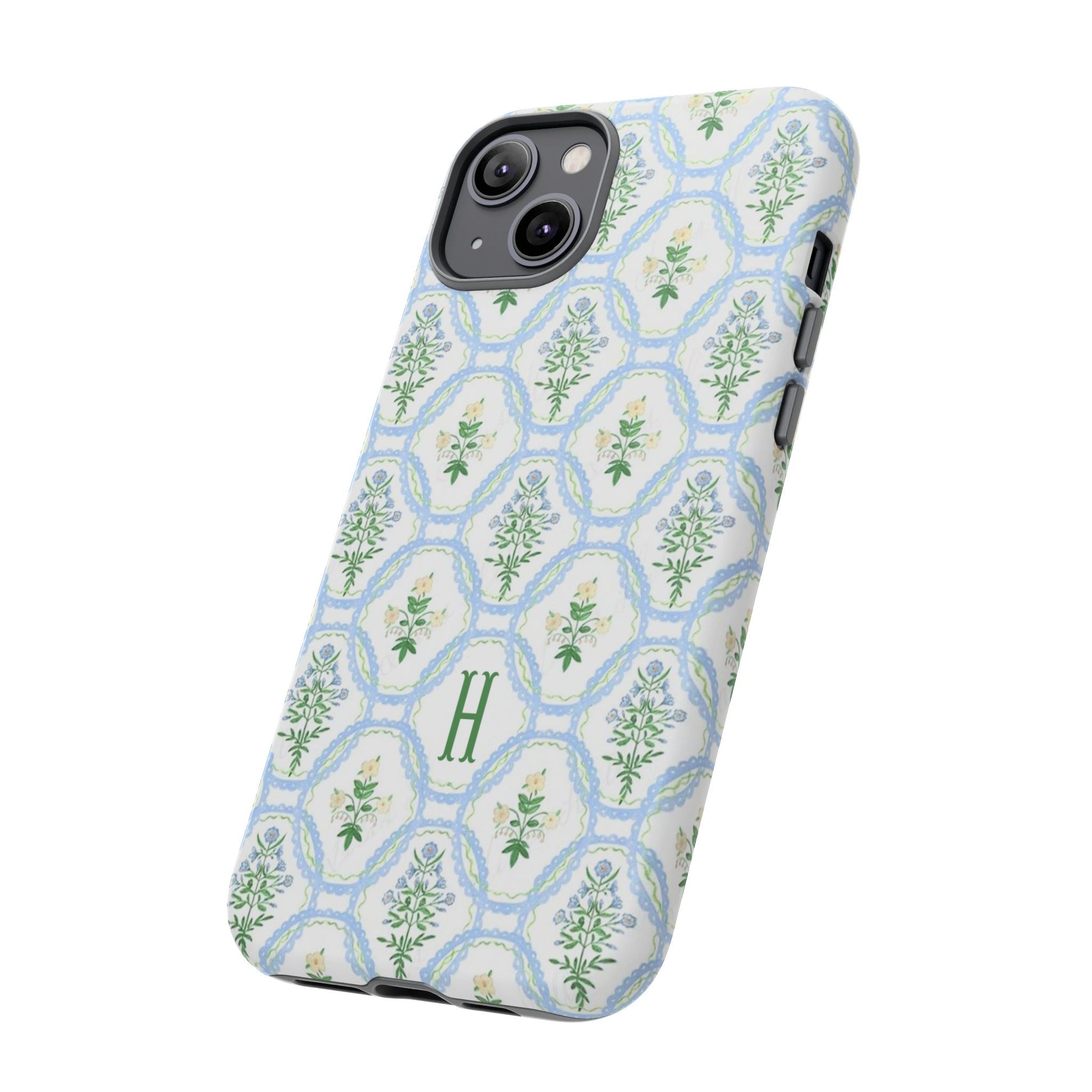 This monogram phone case is the perfect blend of sweet and polished—an airy blue scalloped lattice pattern with delicate floral motifs, finished with your custom initial. It’s a trendy iPhone case that still feels timeless, making it an easy everyday favorite.