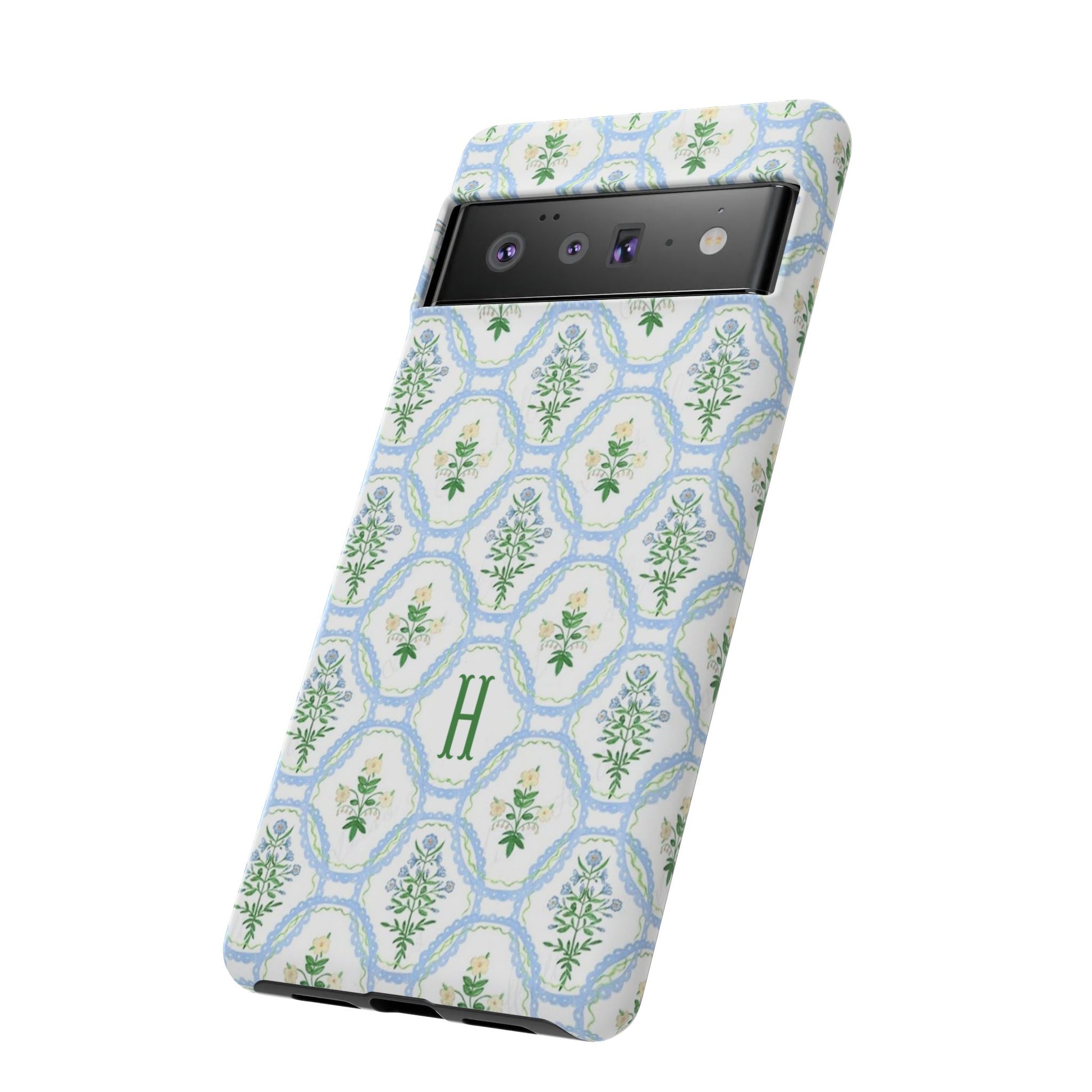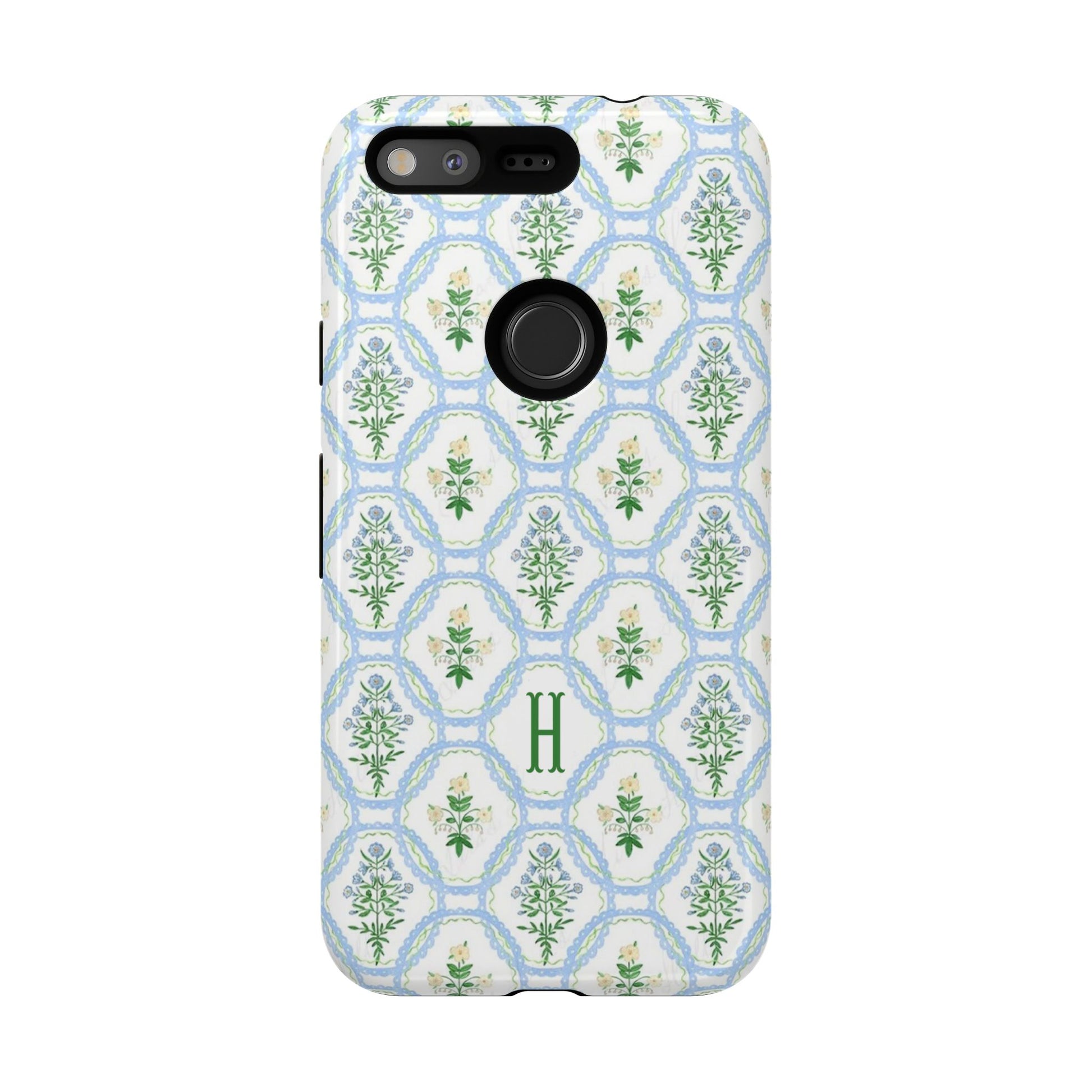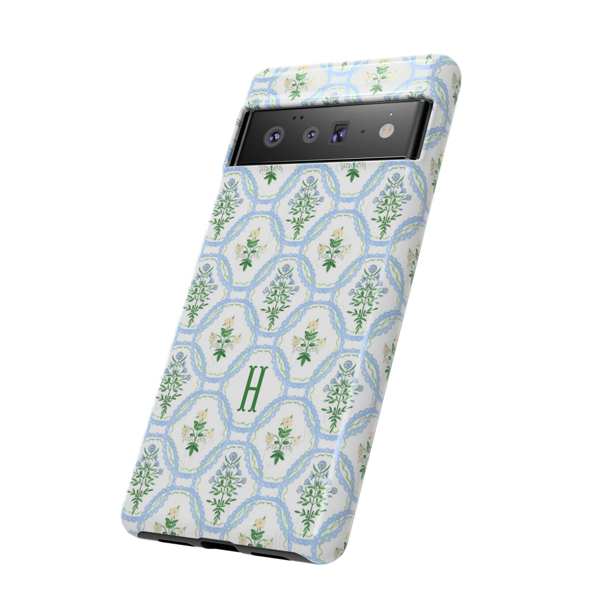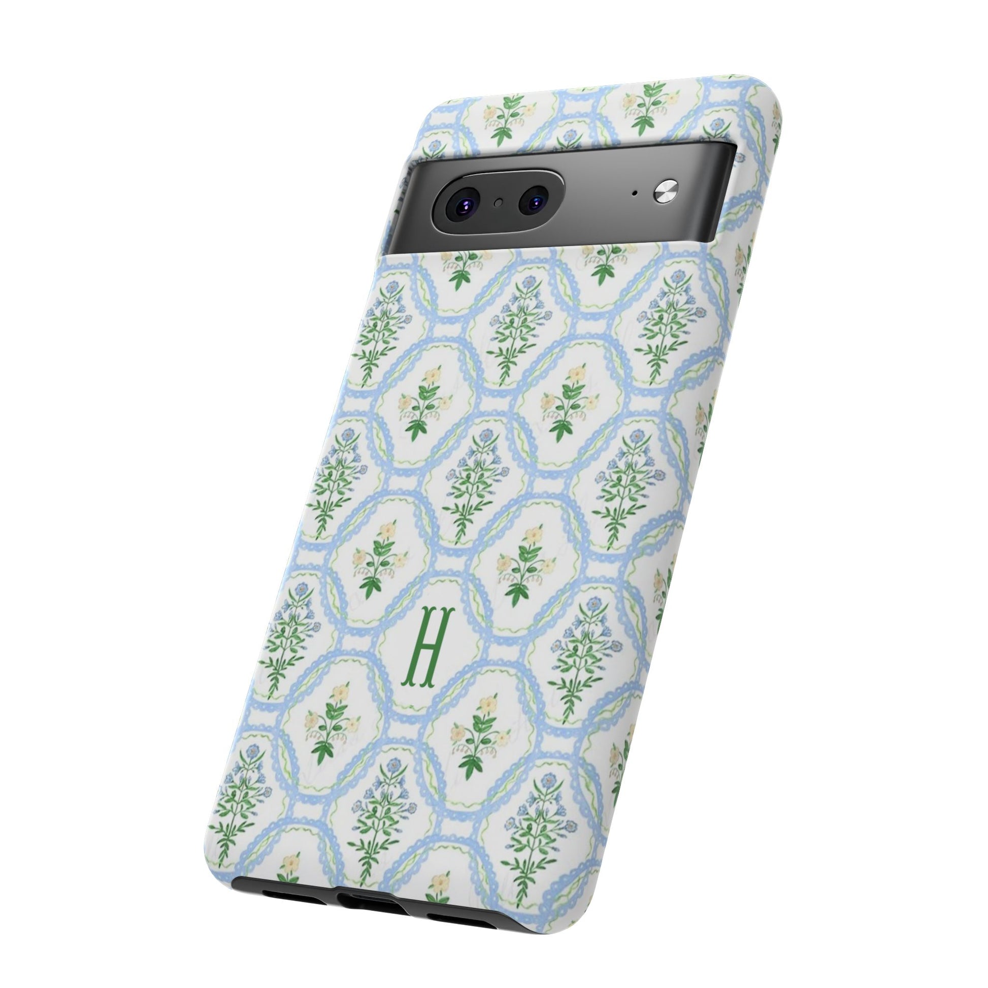 This monogram phone case is the perfect blend of sweet and polished—an airy blue scalloped lattice pattern with delicate floral motifs, finished with your custom initial. It’s a trendy iPhone case that still feels timeless, making it an easy everyday favorite.