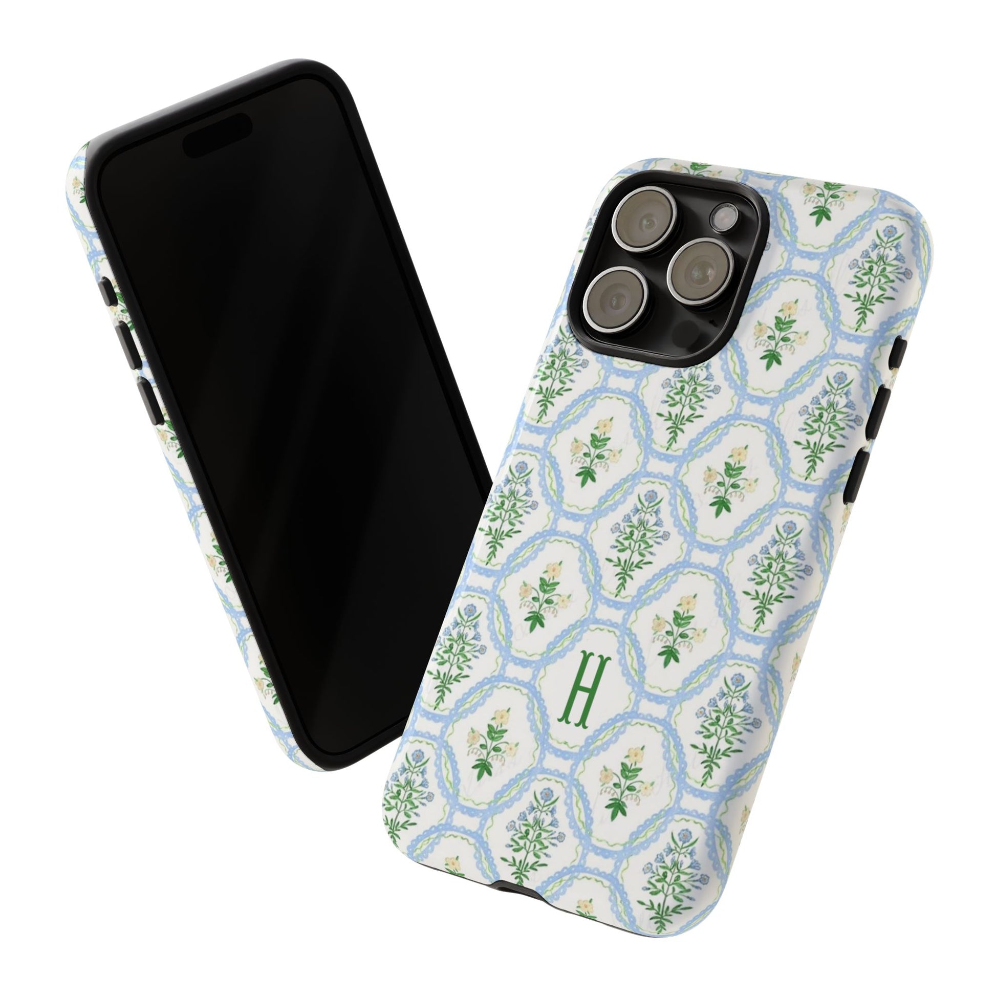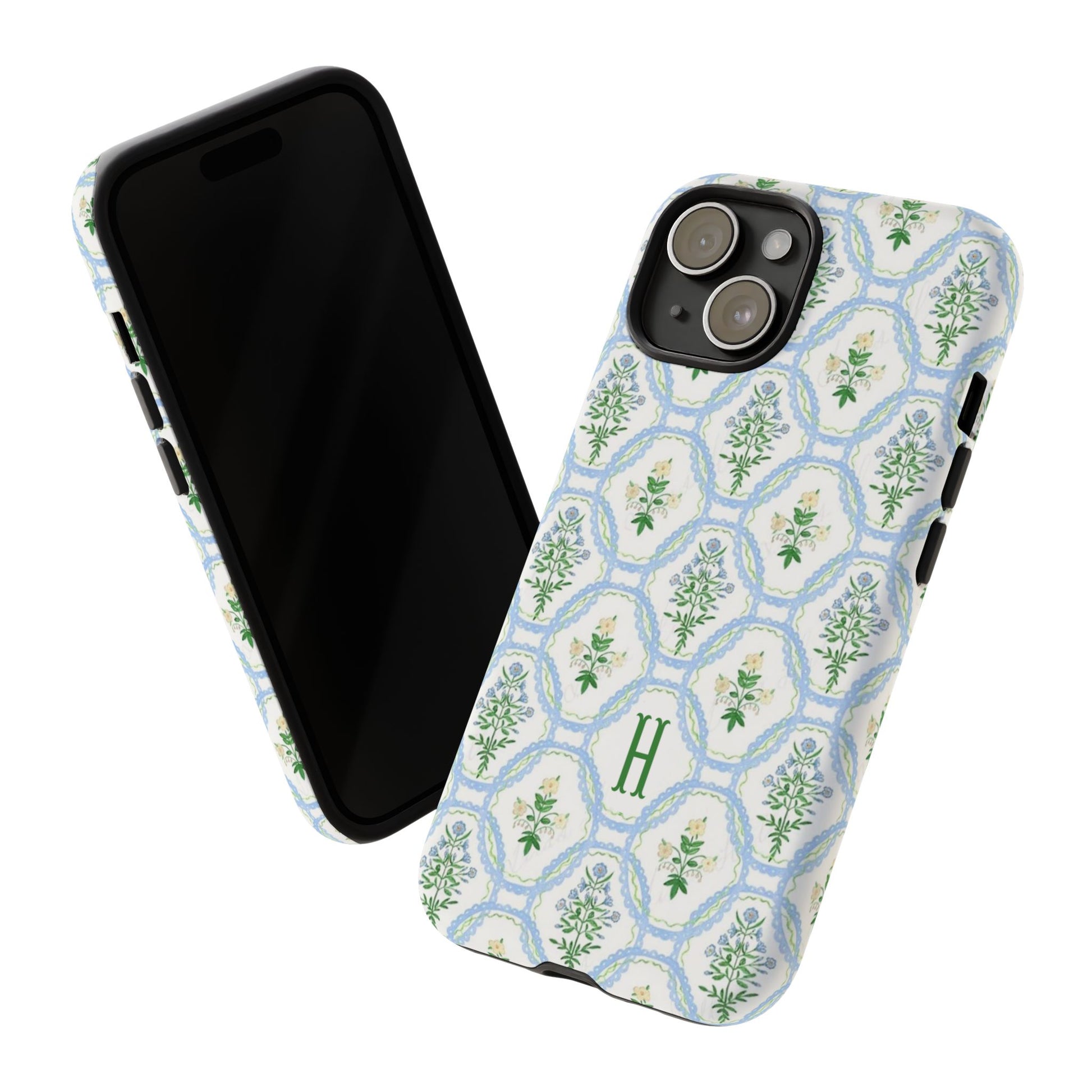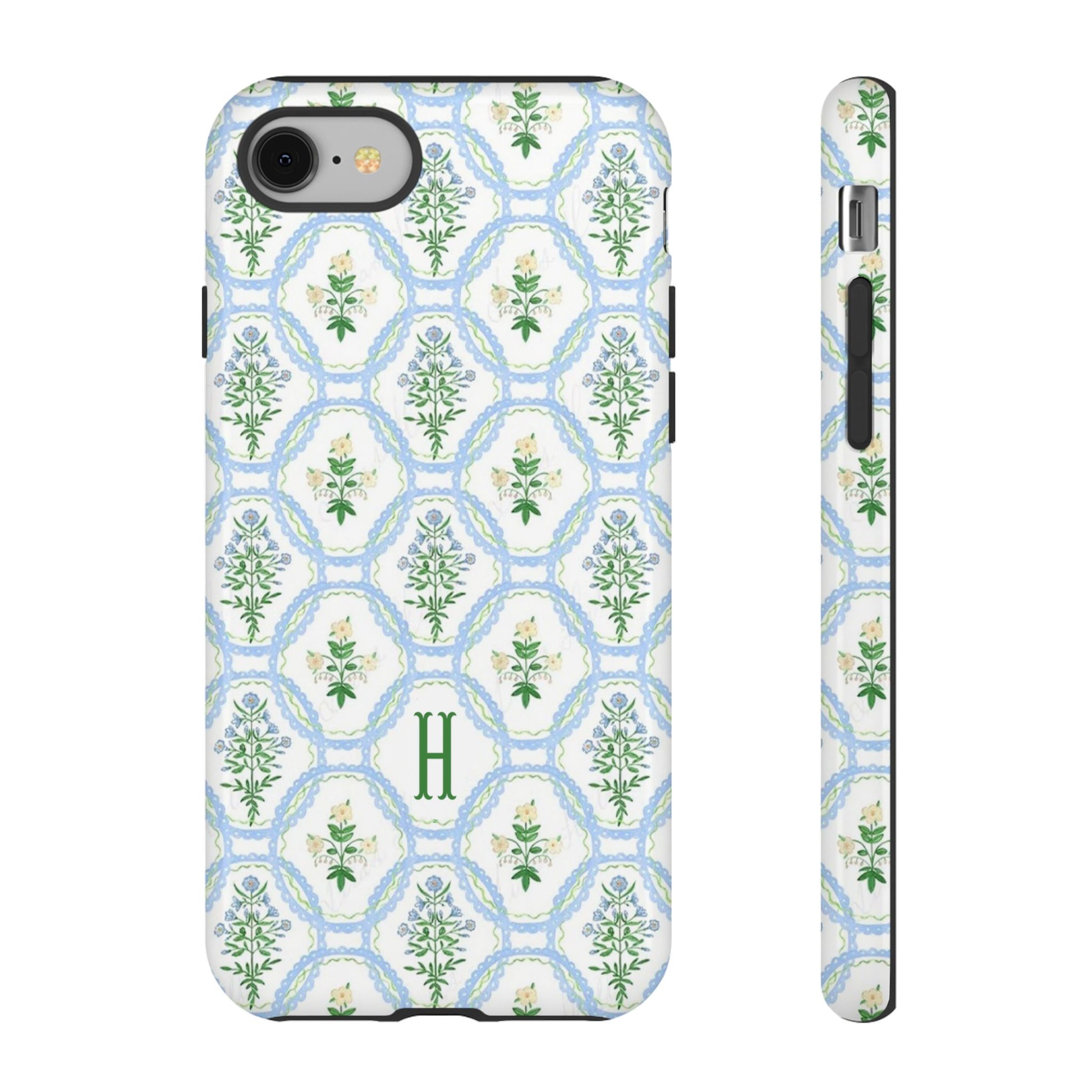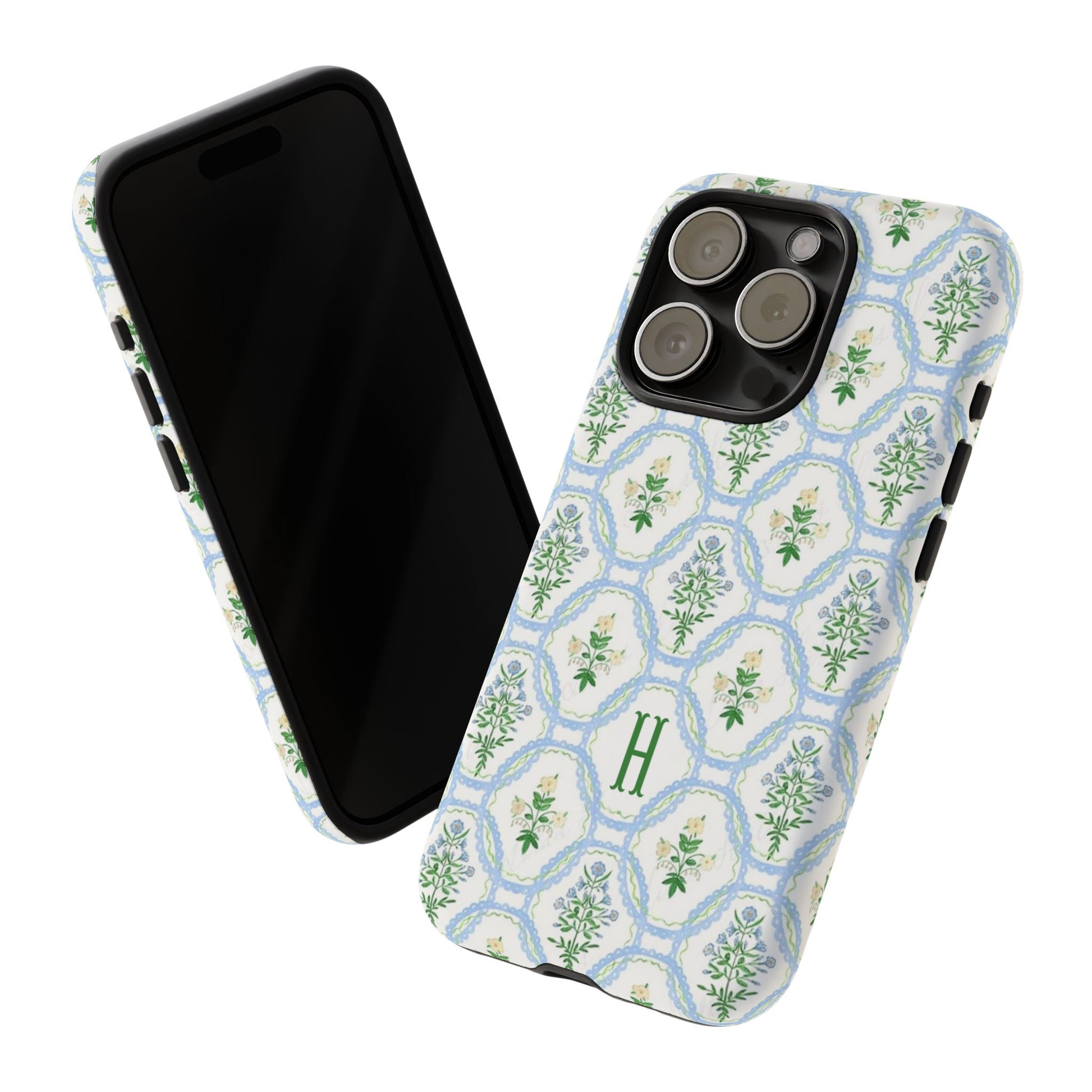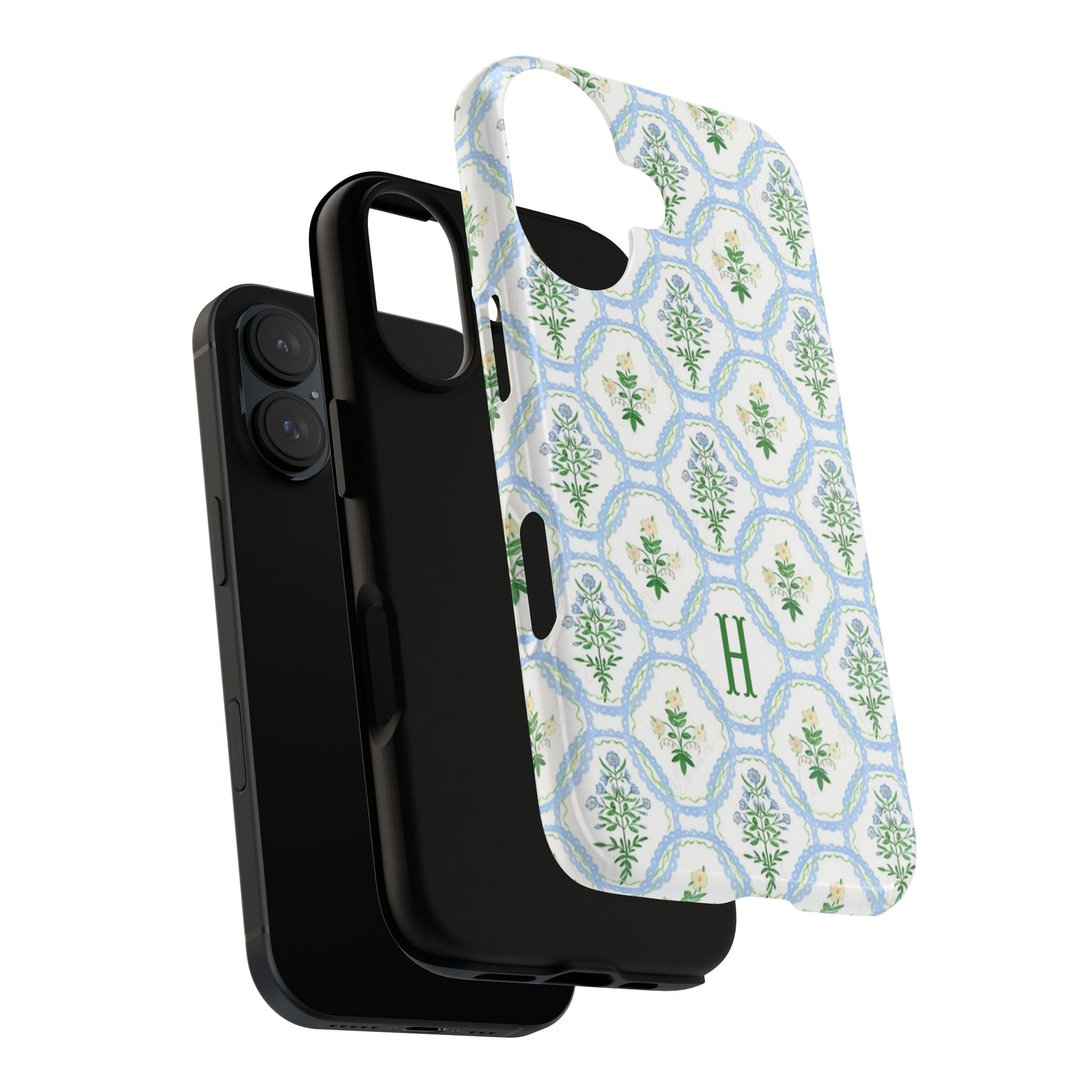 This monogram phone case is the perfect blend of sweet and polished—an airy blue scalloped lattice pattern with delicate floral motifs, finished with your custom initial. It’s a trendy iPhone case that still feels timeless, making it an easy everyday favorite.