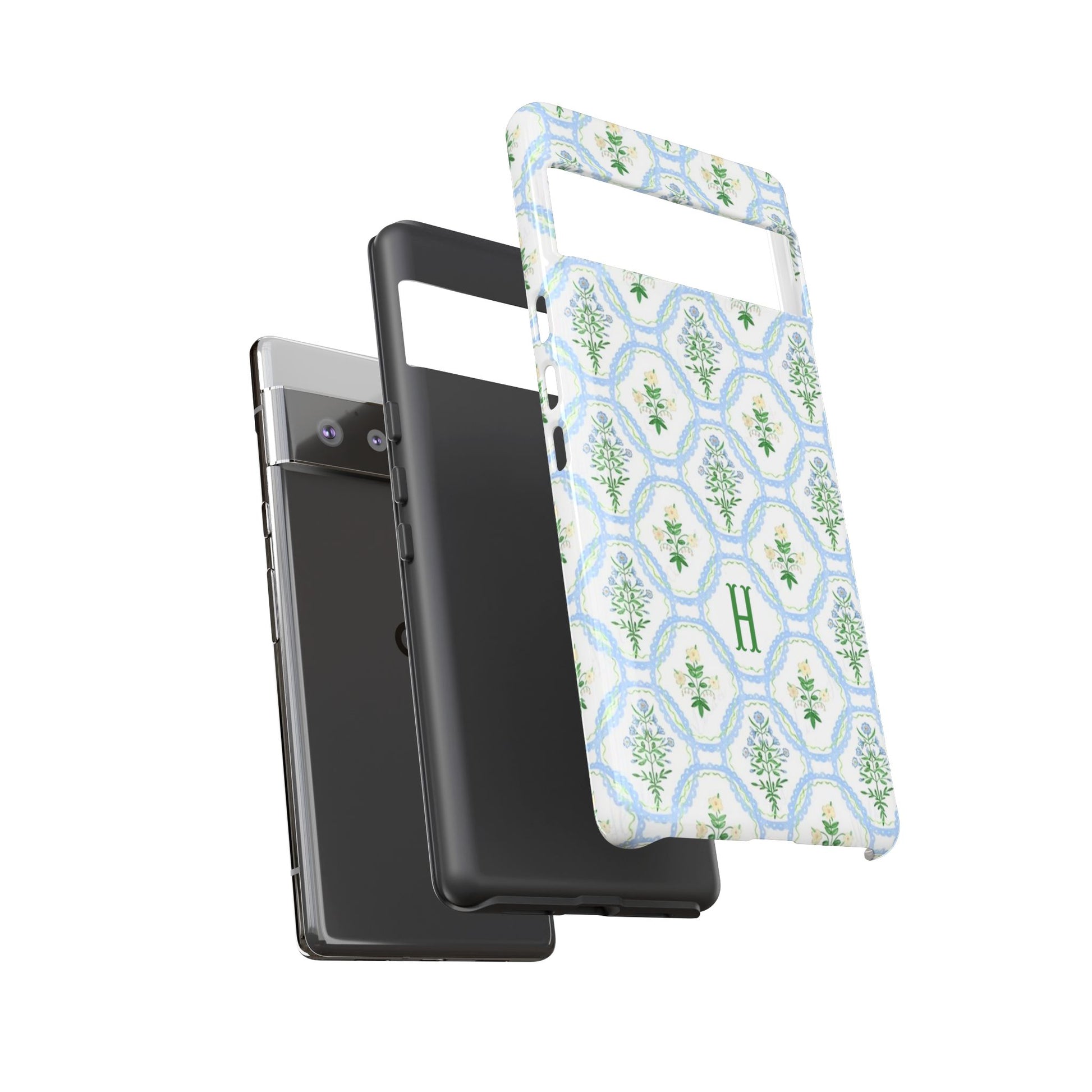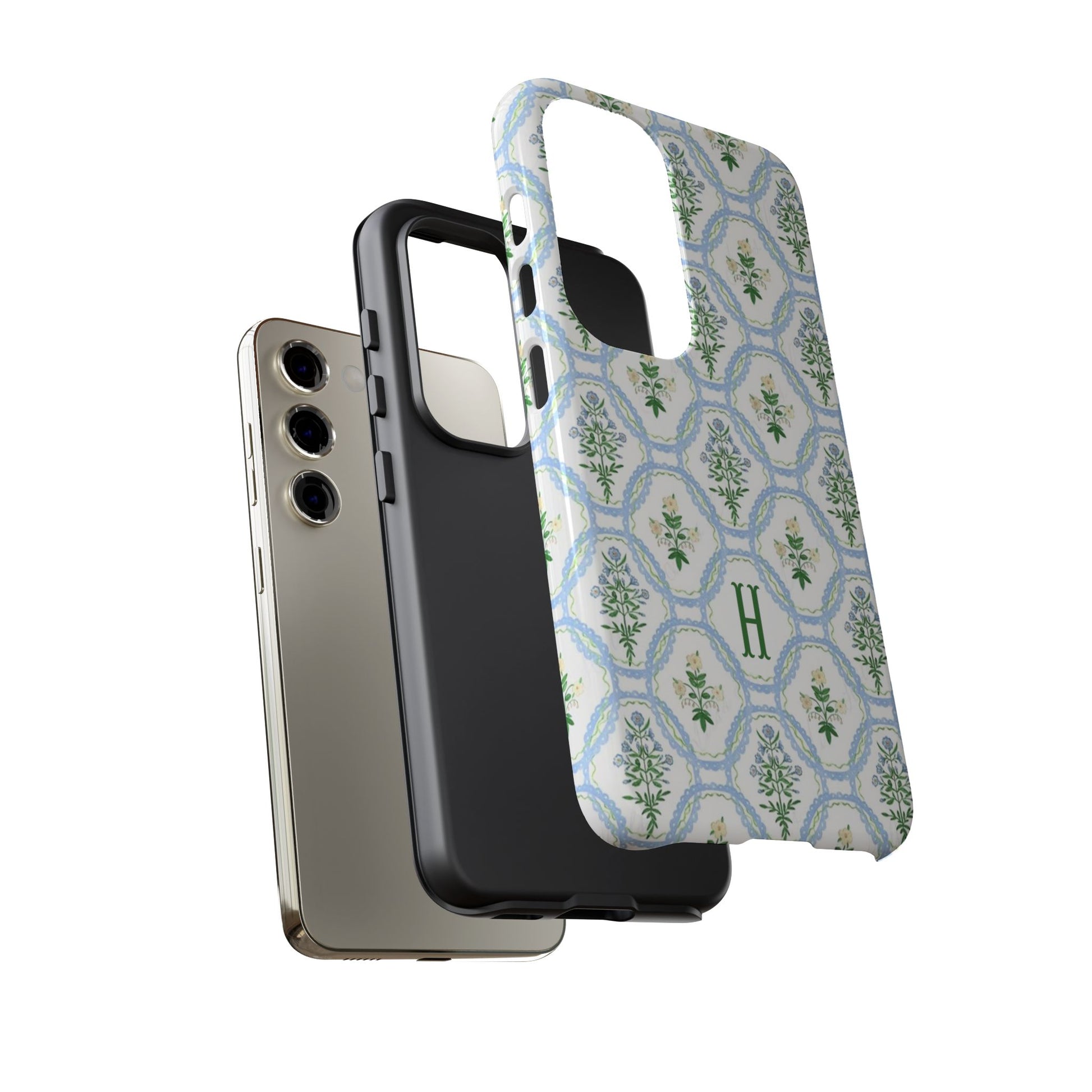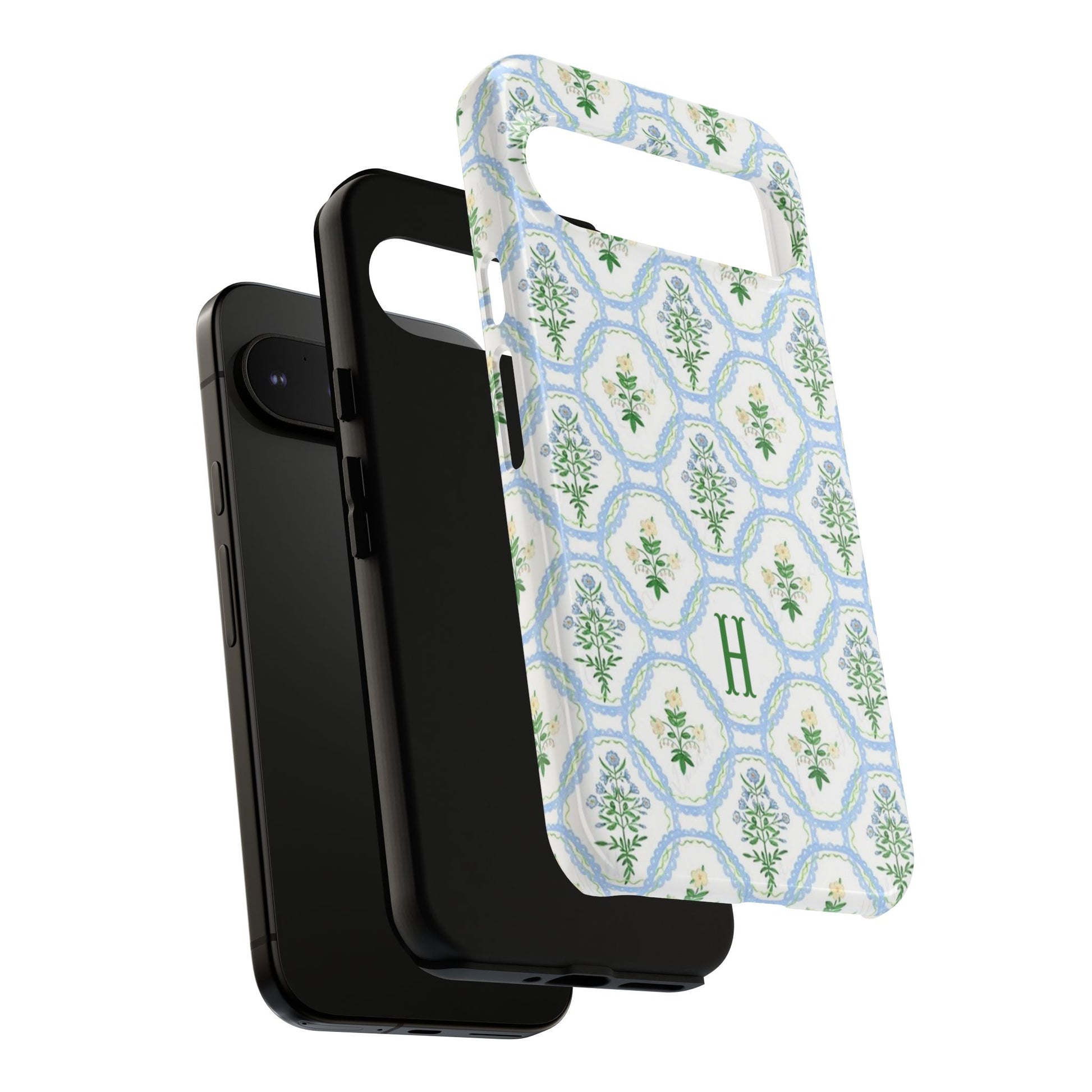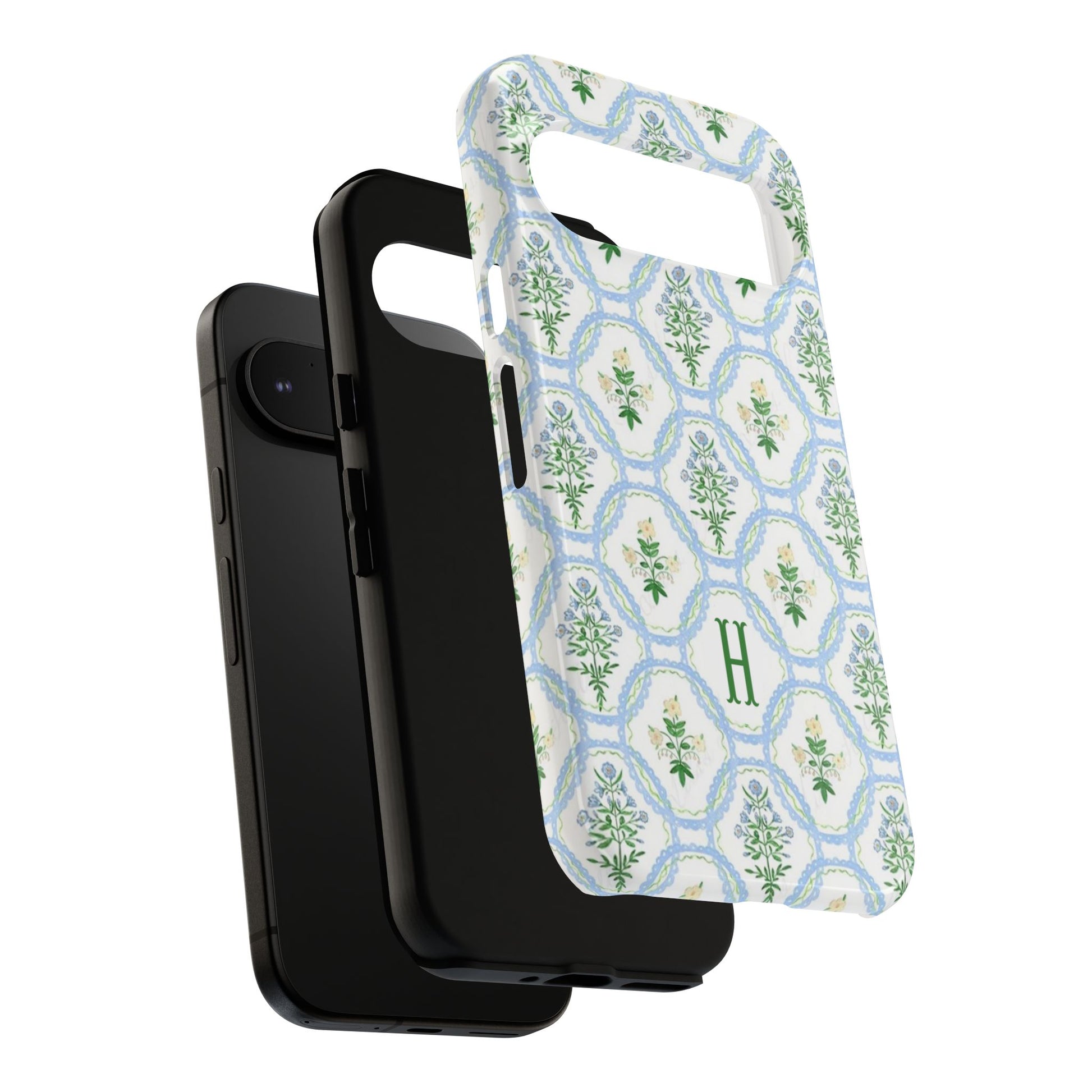 This monogram phone case is the perfect blend of sweet and polished—an airy blue scalloped lattice pattern with delicate floral motifs, finished with your custom initial. It’s a trendy iPhone case that still feels timeless, making it an easy everyday favorite.