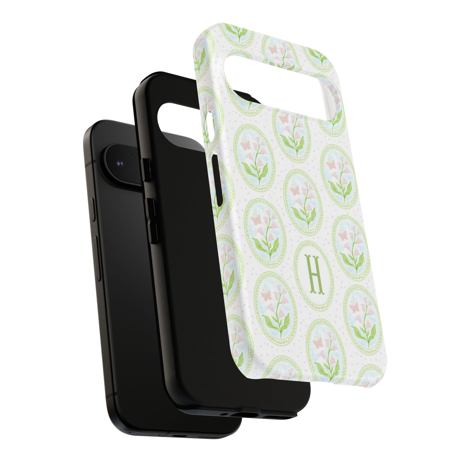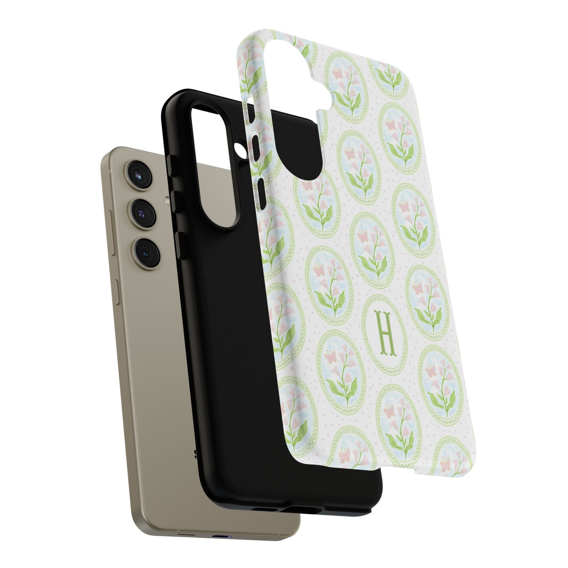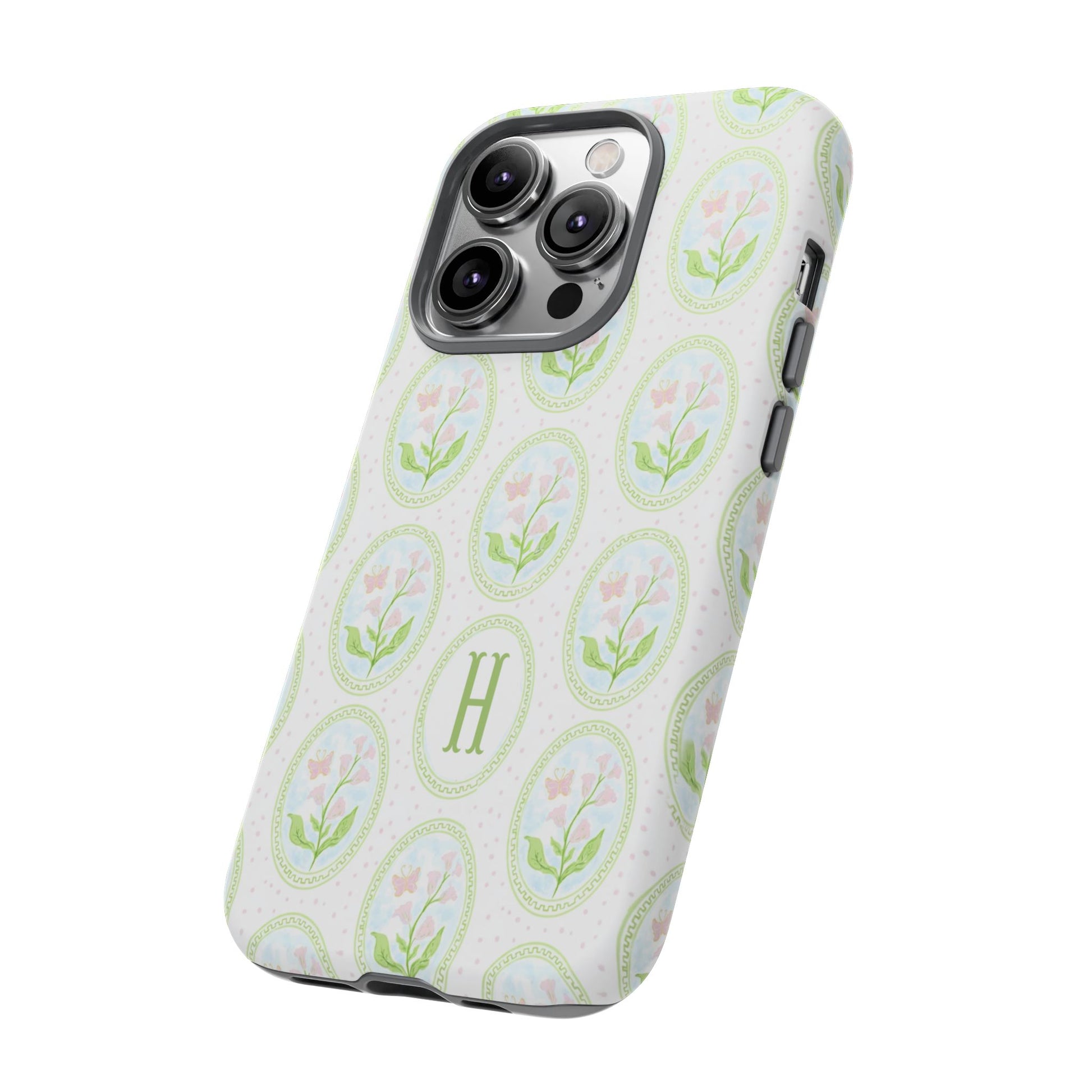 Soft, sweet, and classic—this Monogram phone case features delicate lily-of-the-valley style florals with pastel butterflies inside vintage-inspired oval frames, set on a blush polka dot background. It’s a Trendy iPhone case that feels romantic and fresh, without being over-the-top.