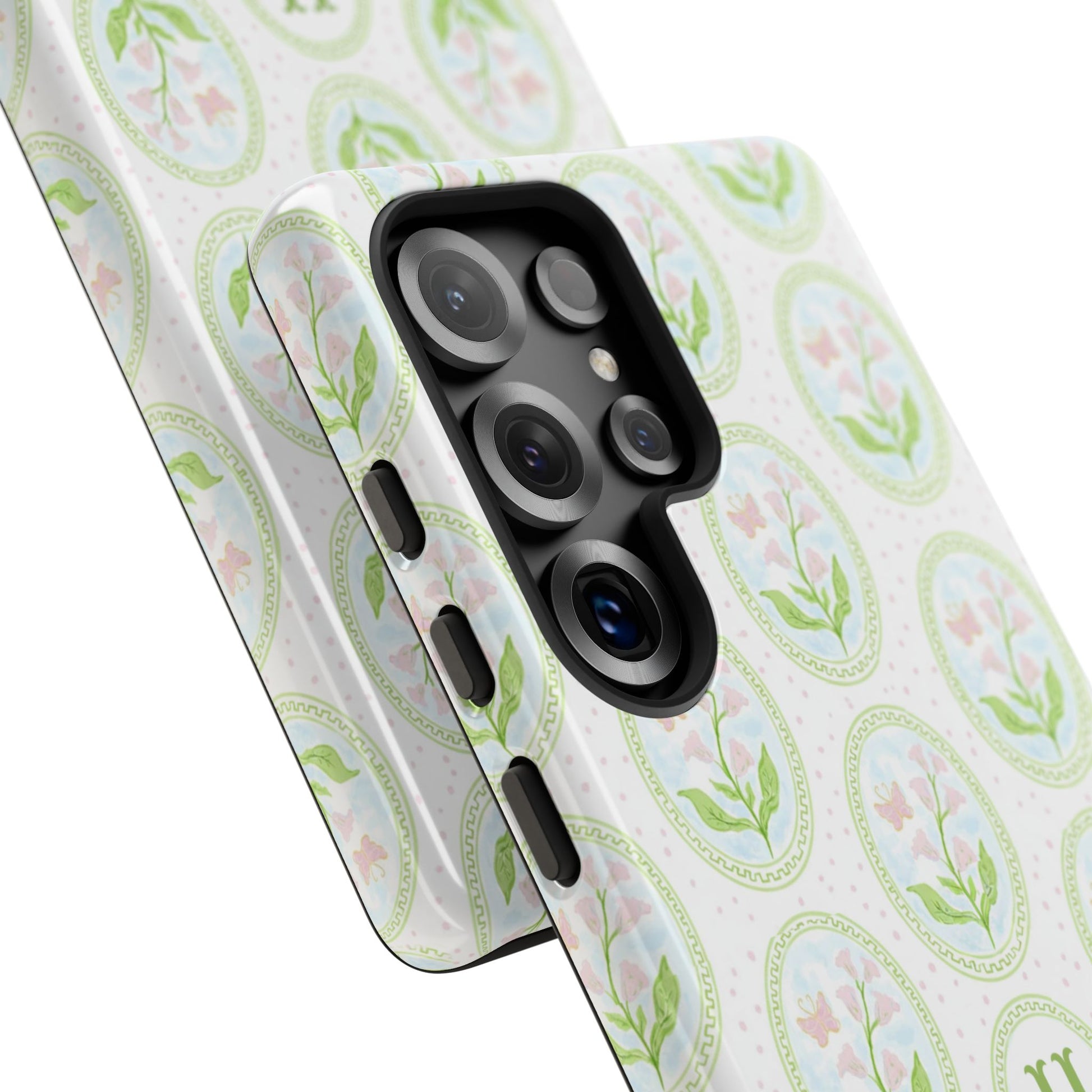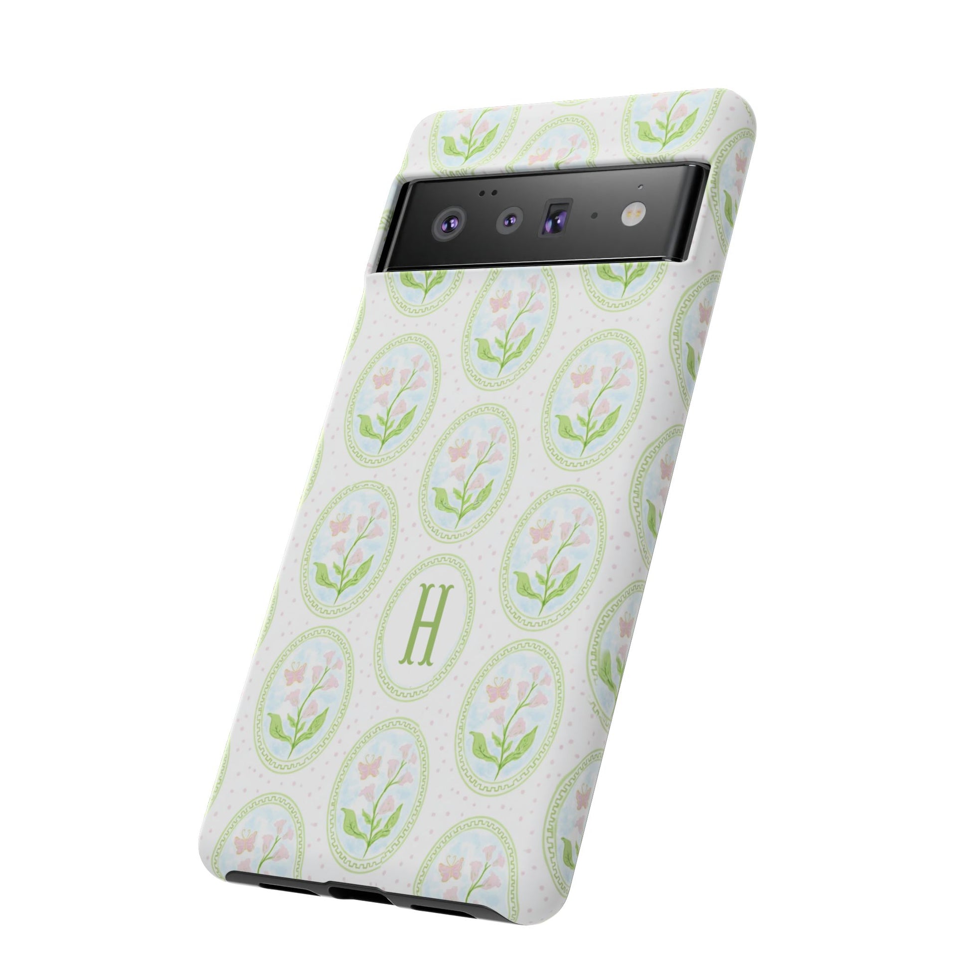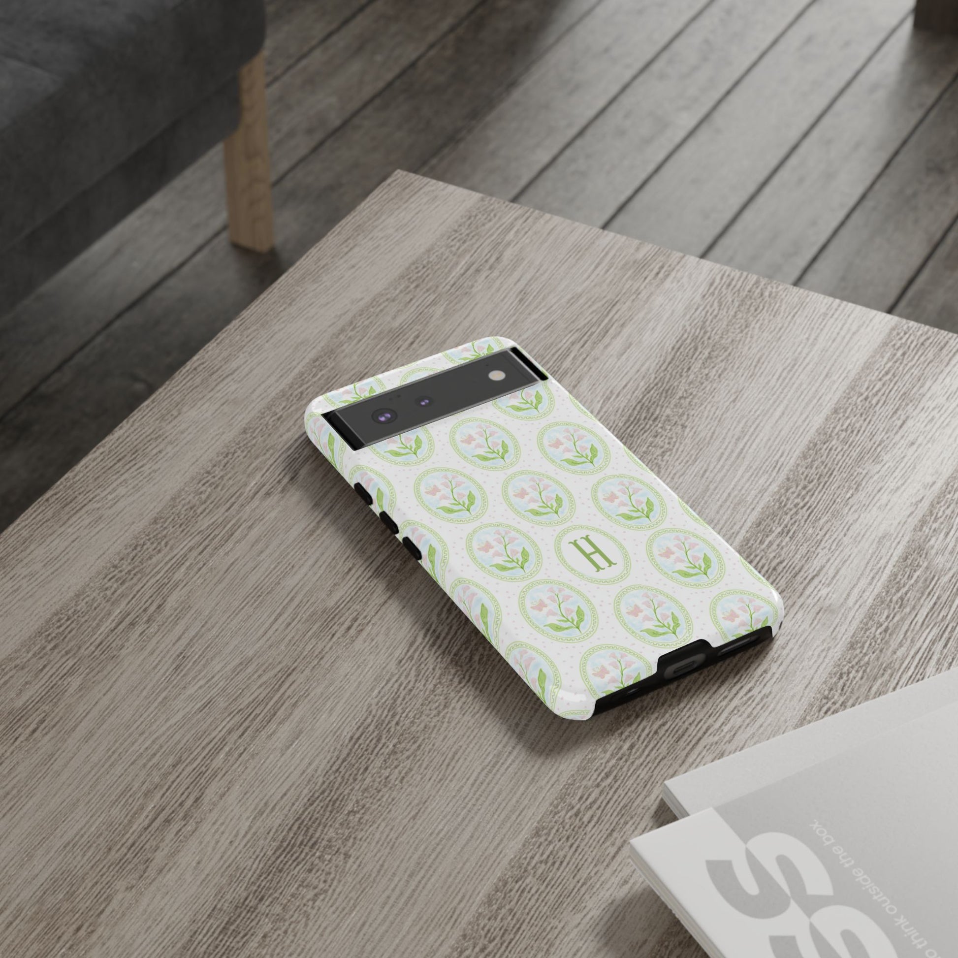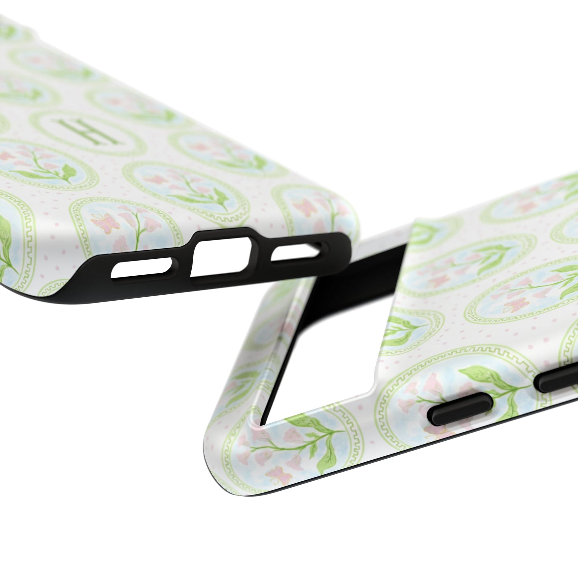 Soft, sweet, and classic—this Monogram phone case features delicate lily-of-the-valley style florals with pastel butterflies inside vintage-inspired oval frames, set on a blush polka dot background. It’s a Trendy iPhone case that feels romantic and fresh, without being over-the-top.
