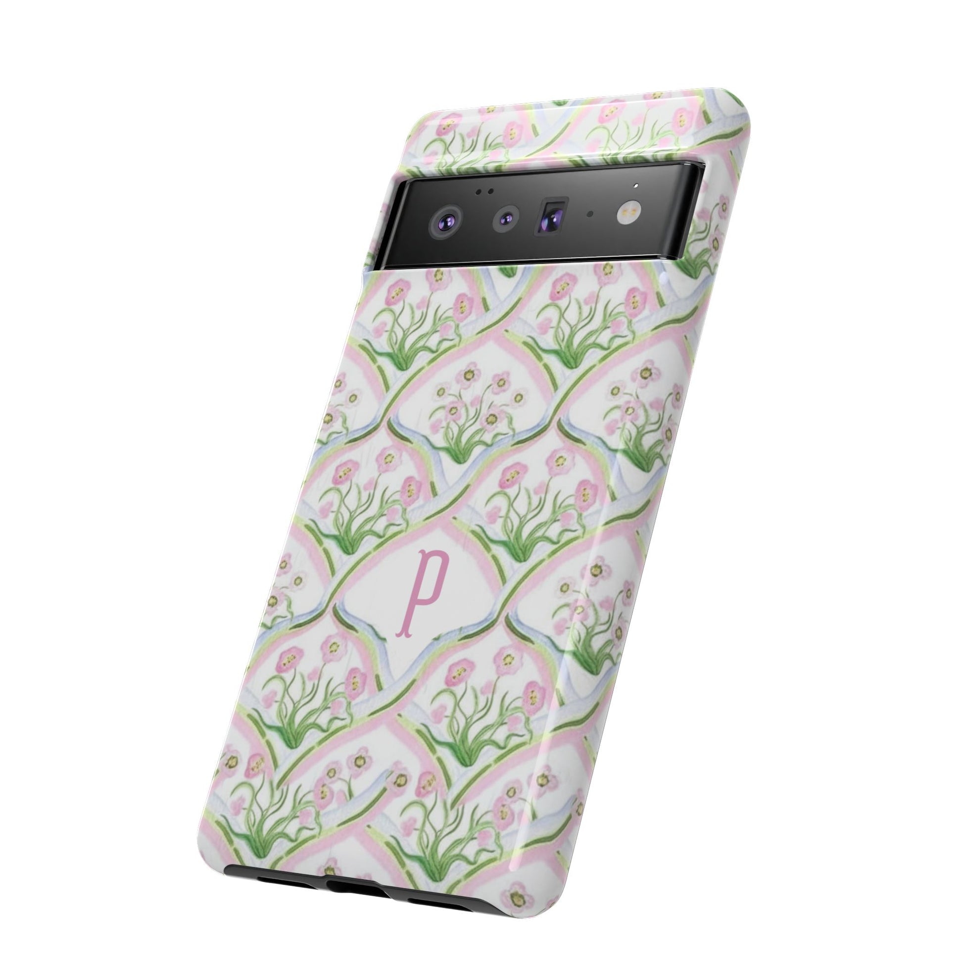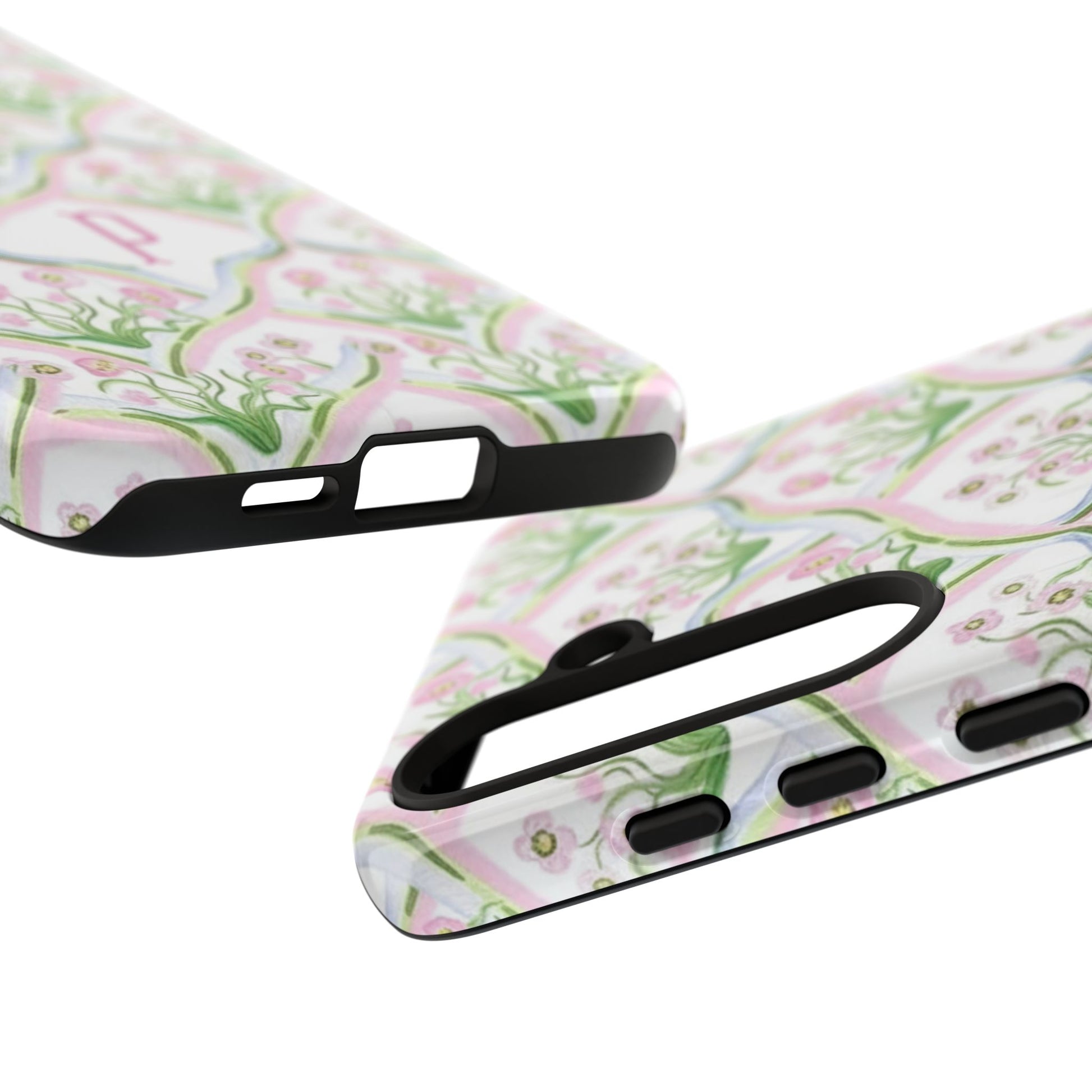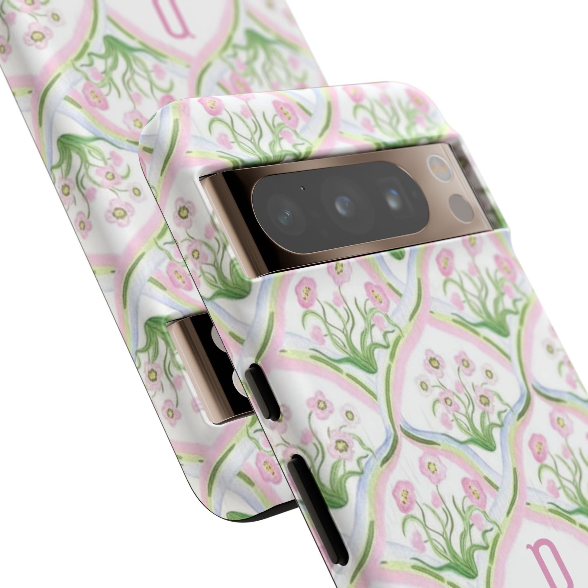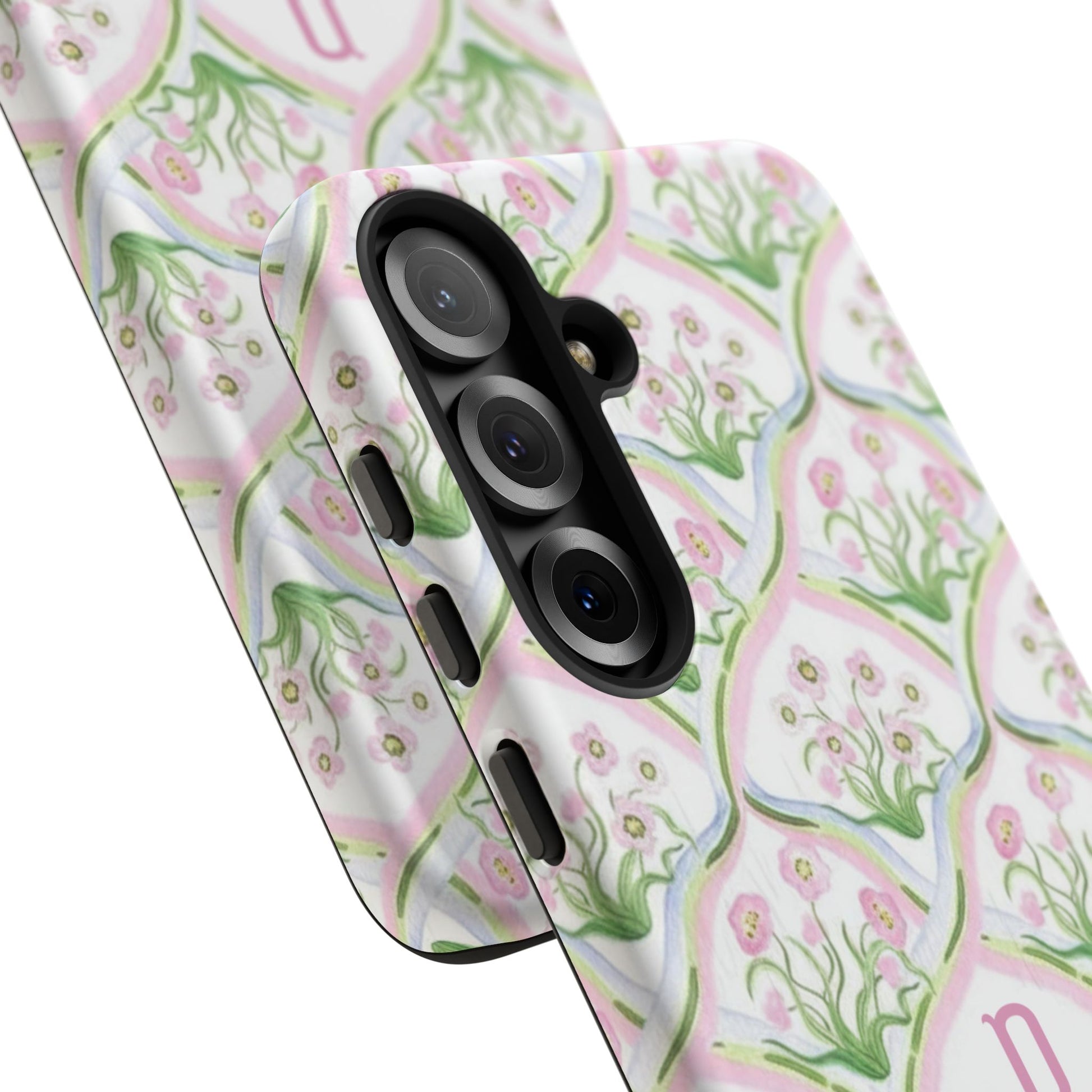 A slim, protective phone case that brings soft, vintage-inspired florals to your everyday carry. The repeating hand-painted motif in delicate pinks and greens wraps fully around the shell with a subtle monogram option at the center, giving the piece a personal, stationery-like charm. Dual-layer construction — a rigid polycarbonate exterior and a shock-absorbing TPU silicone liner — keeps your device safe from everyday knocks while maintaining a lightweight profile. The finish is available in glossy or matte, and the print is UV-protected to keep colors from fading outdoors. Clear port cutouts preserve full connectivity and the case supports wireless charging, so you can stay powered without removing the cover. Thoughtful durability and a gentle, feminine pattern make this case feel like a small, private luxury you reach for every day.