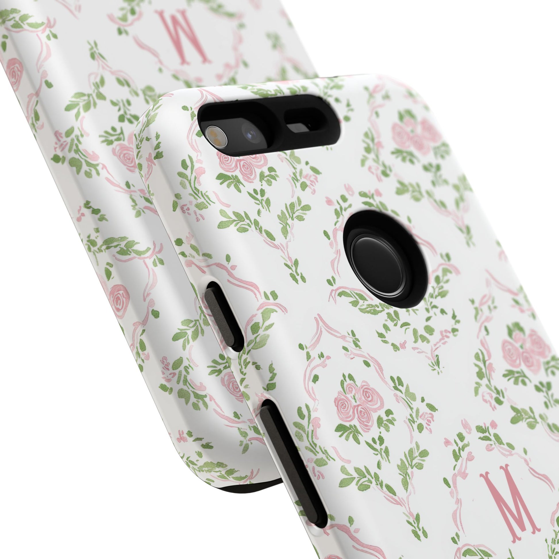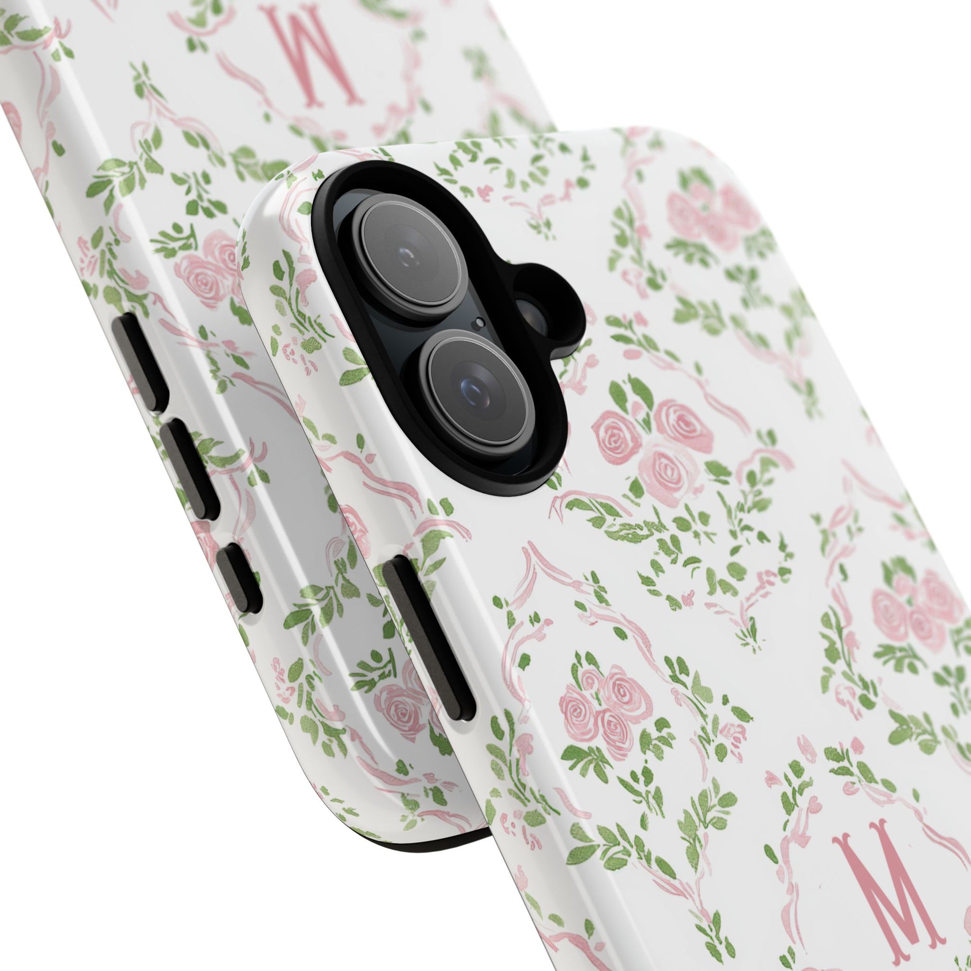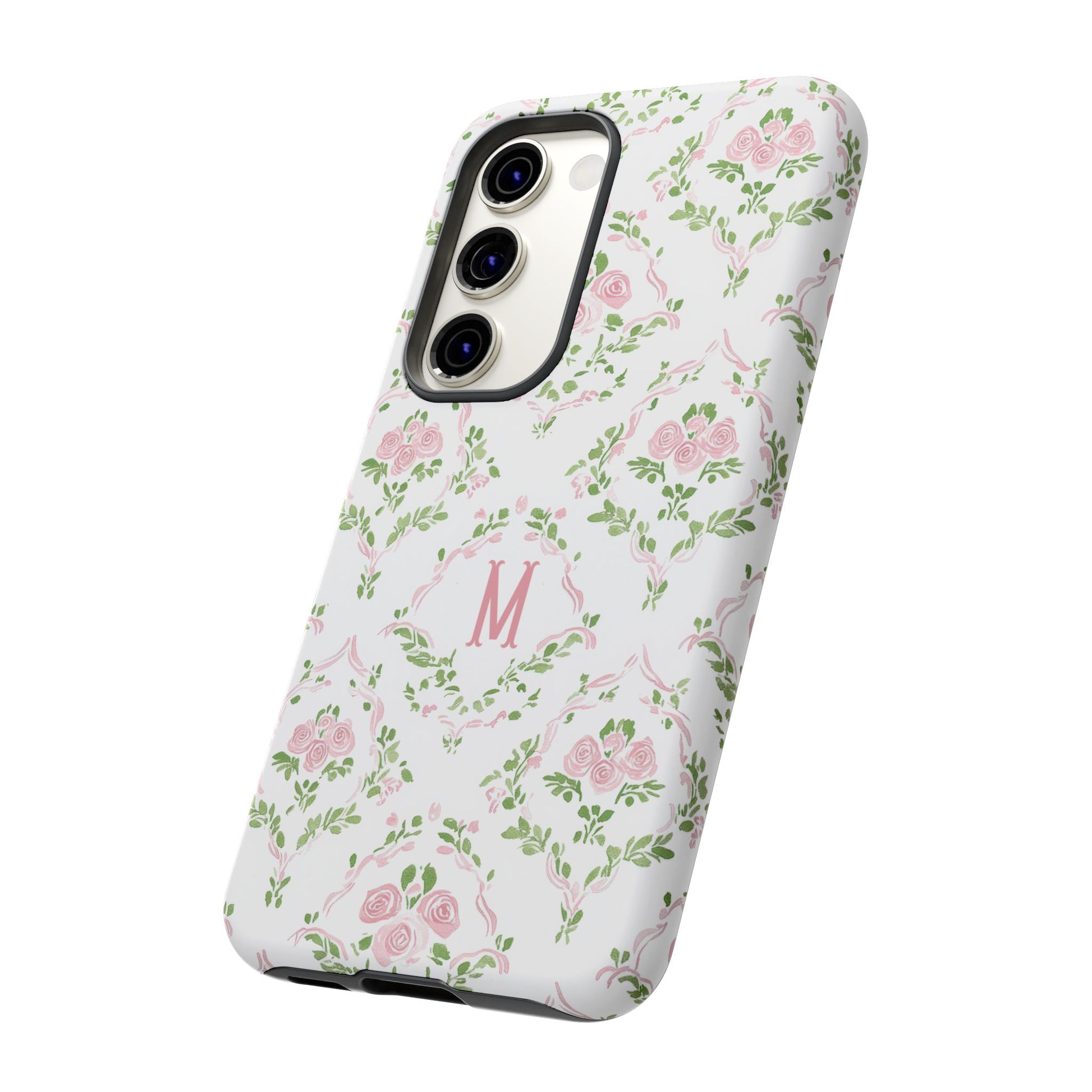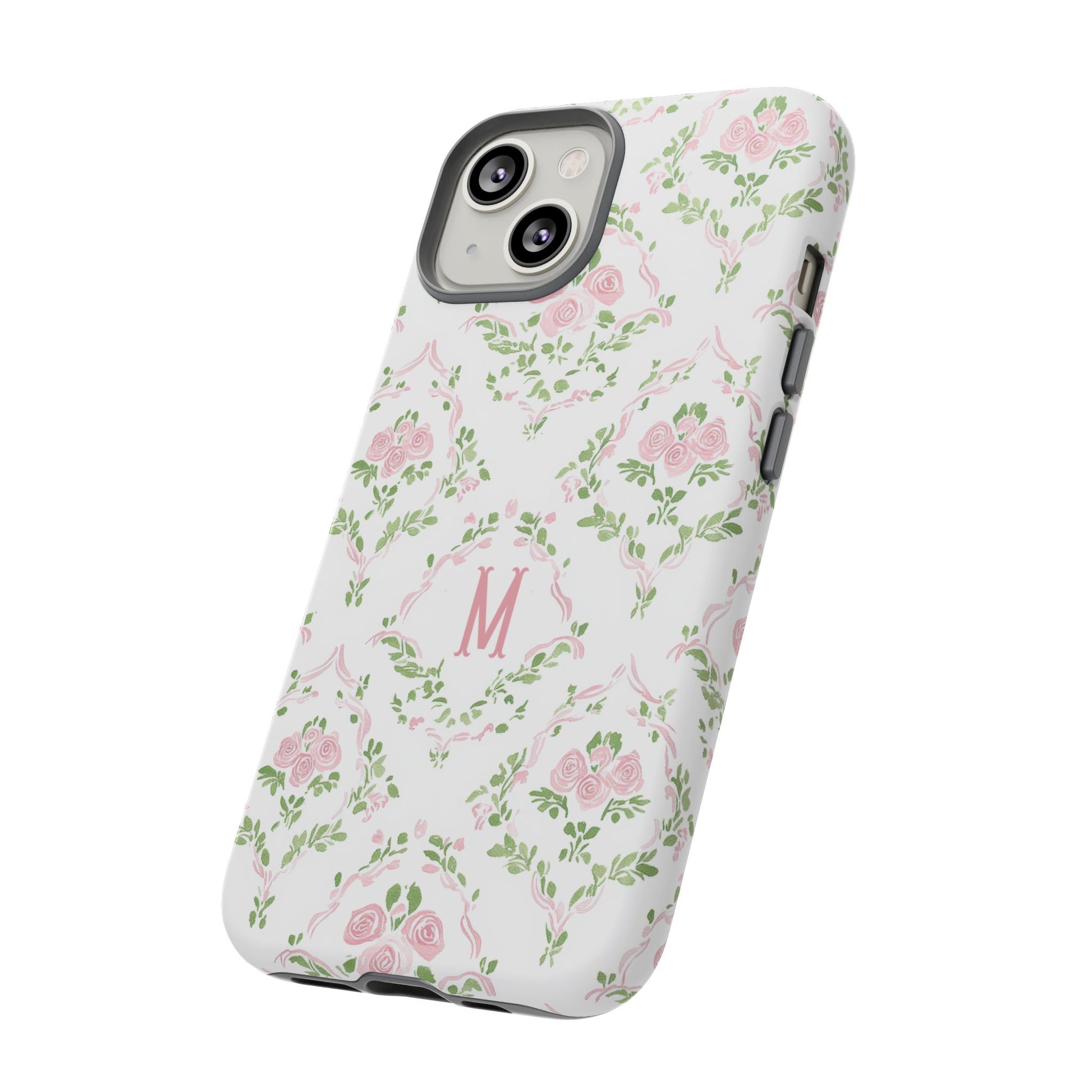 A slim, protective phone case inspired by vintage floral motifs. Soft pink roses and leafy garlands form a delicate repeating pattern on a clean white background, with a subtle monogram ‘M’ at the center for a personalized, heirloom feel. The dual-layer construction combines a rigid polycarbonate shell and a cushioned TPU silicone liner for confident drop protection, while the full-coverage 3D wrap keeps the art vibrant. Lightweight and tactile, it slips easily into a purse or pocket and keeps your phone looking gently romantic without bulk.