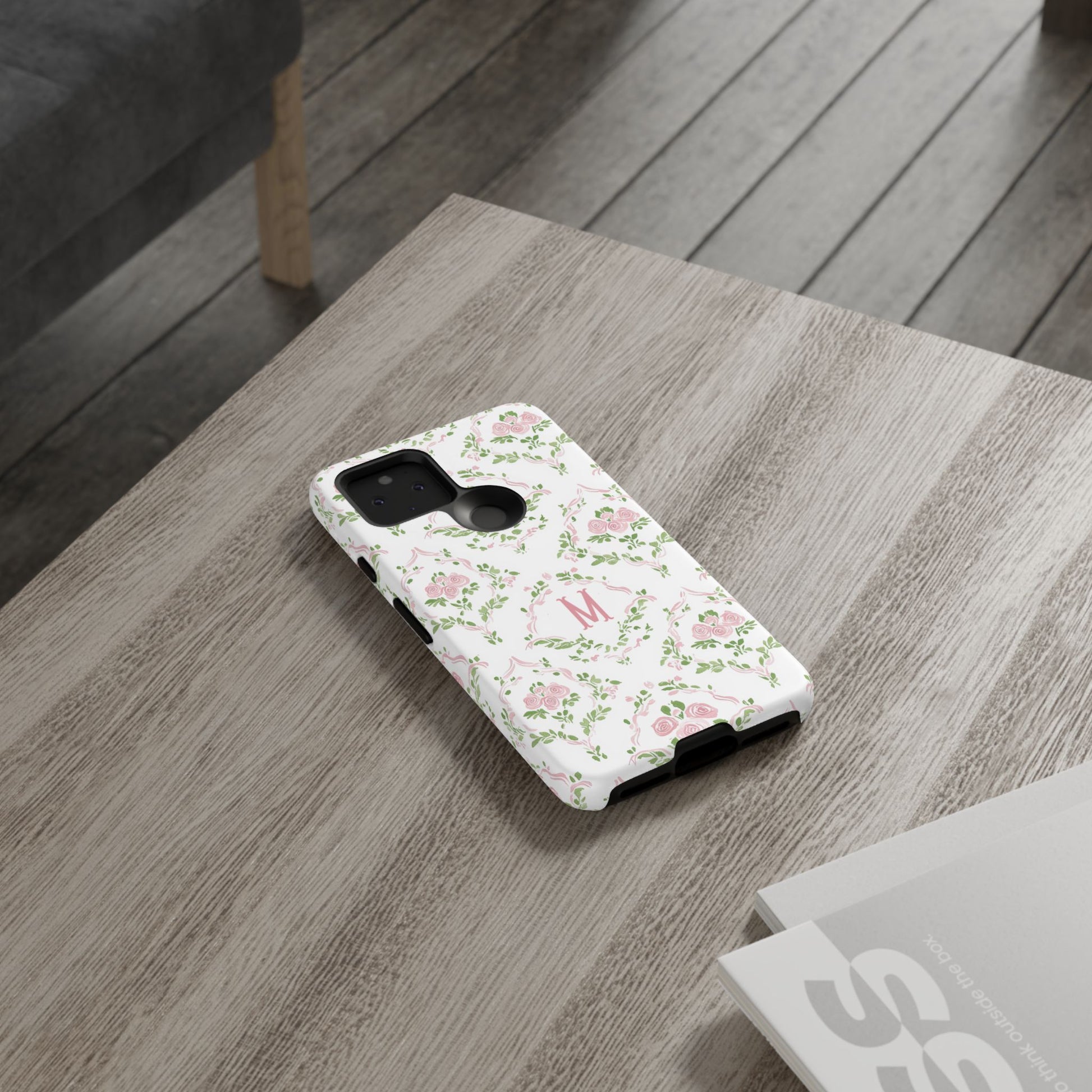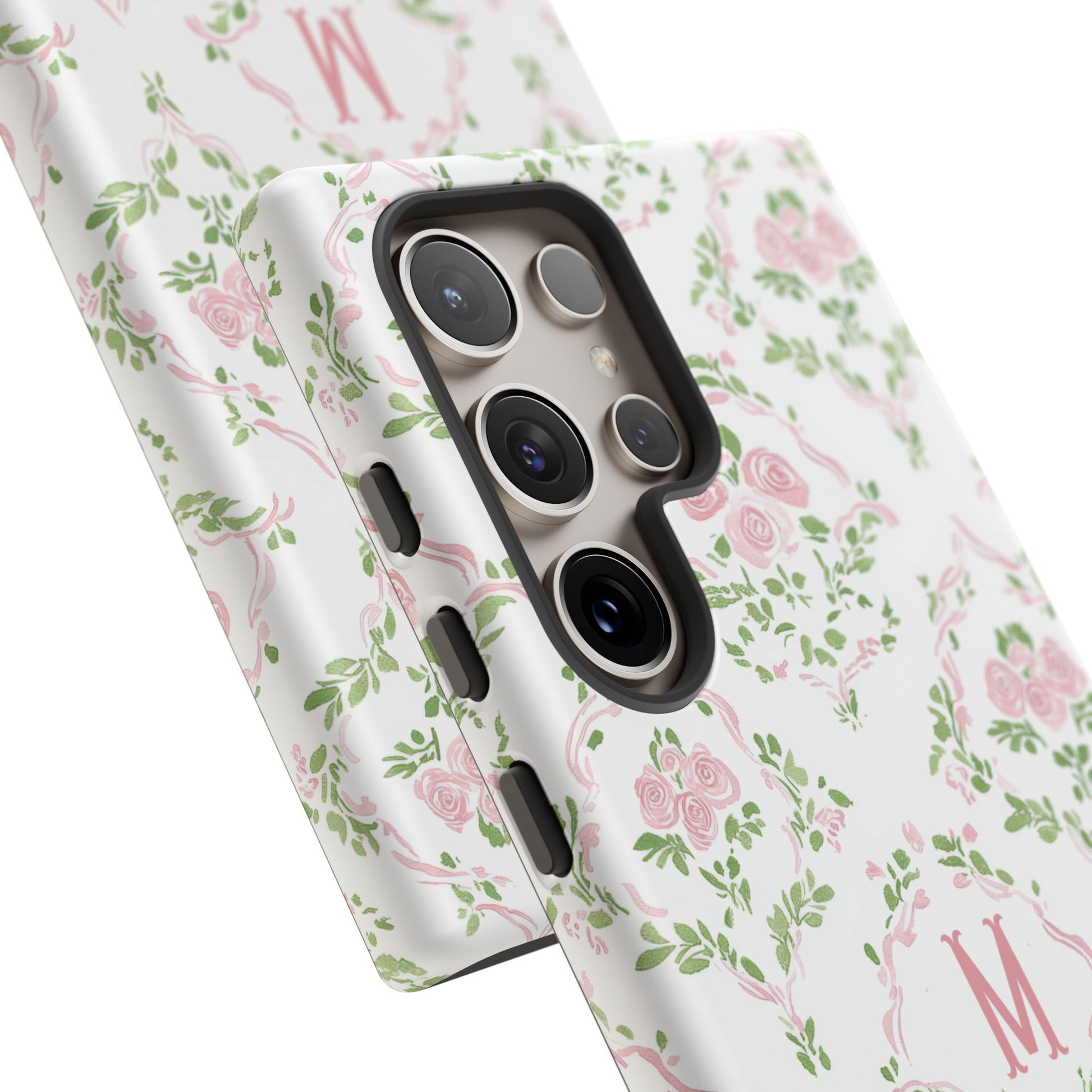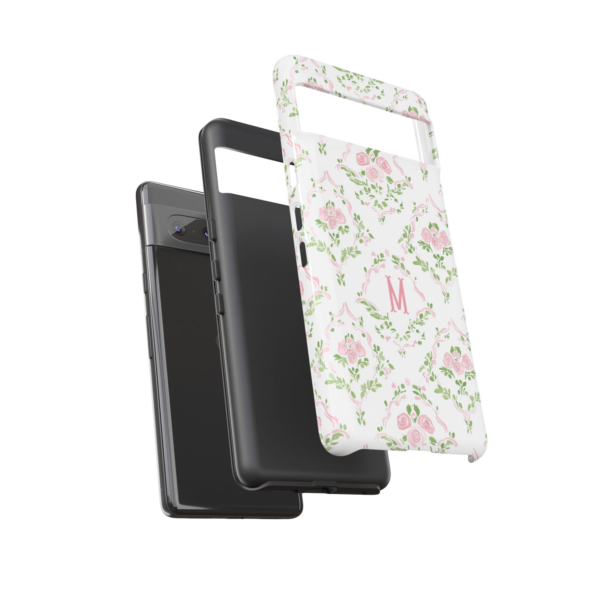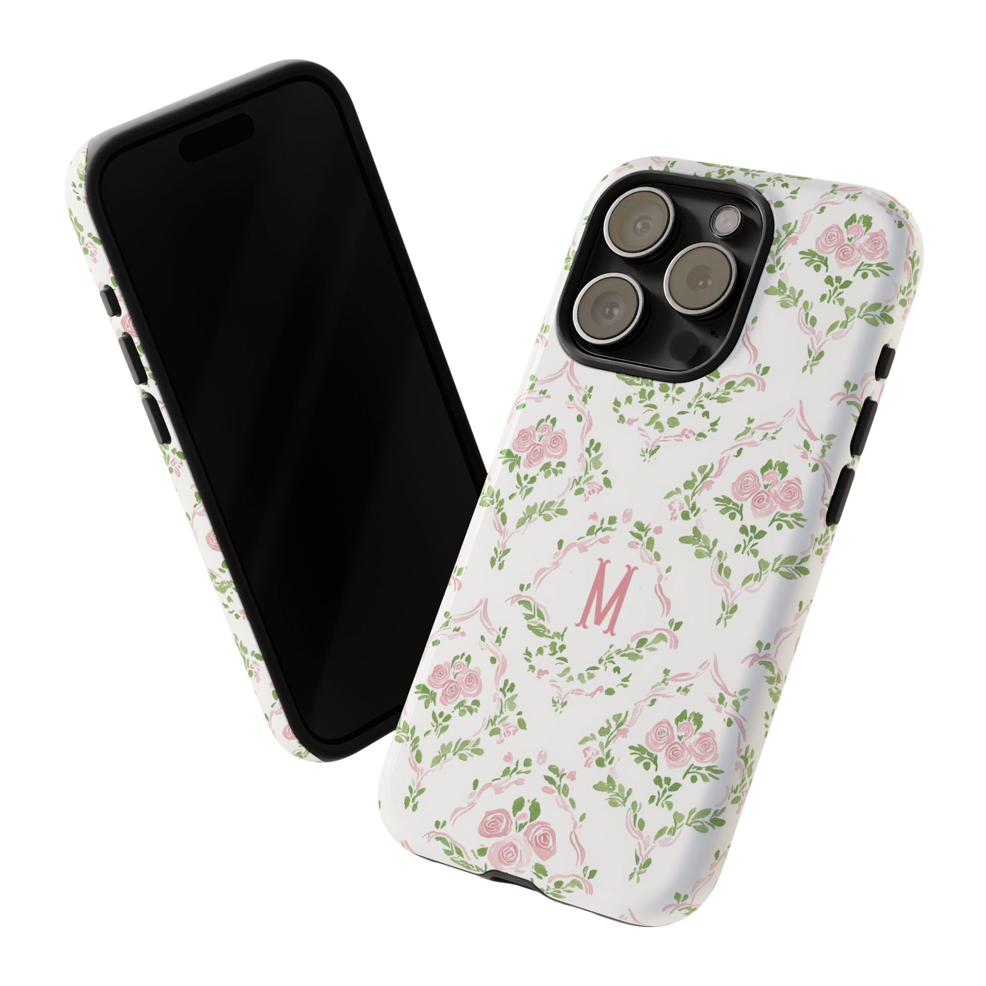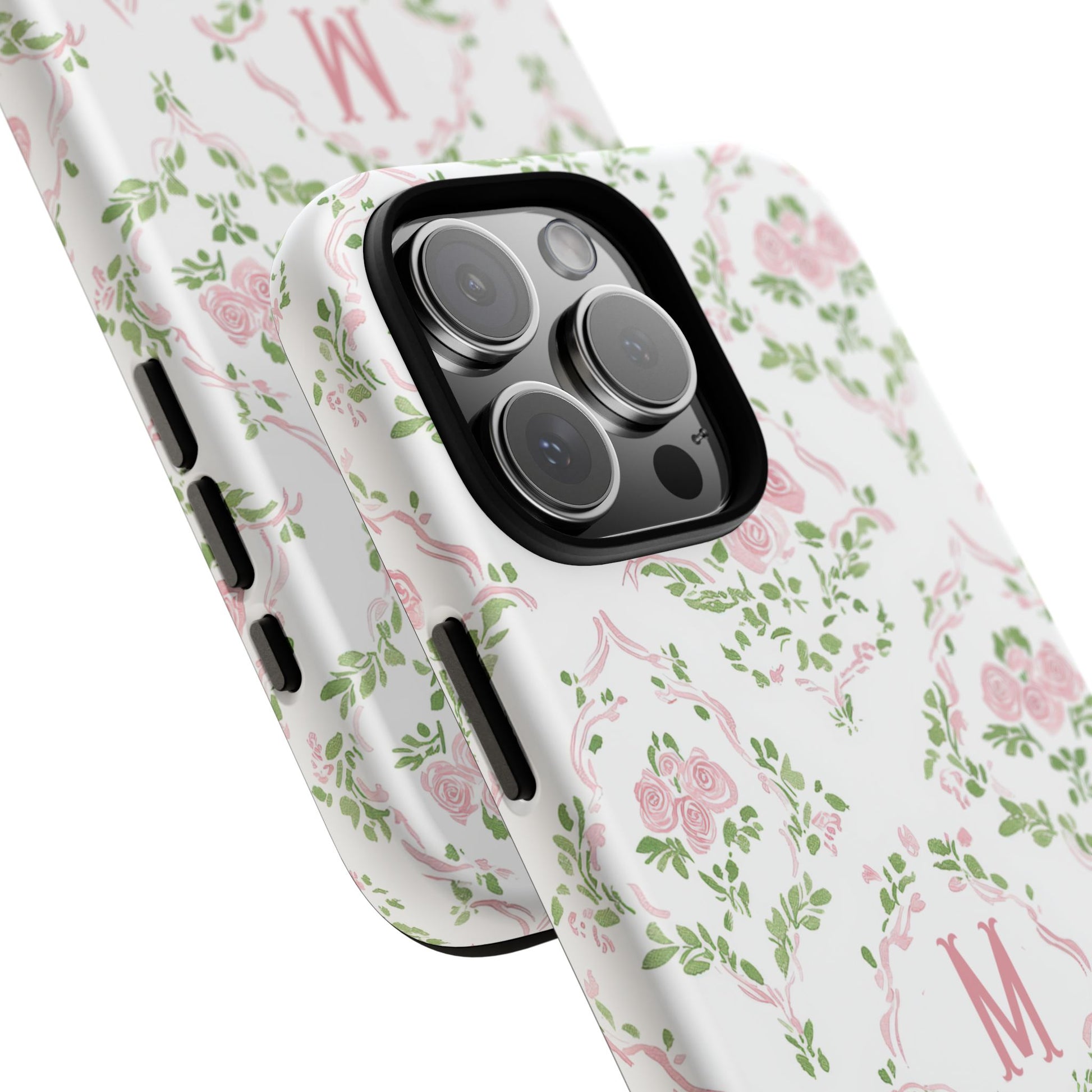 A slim, protective phone case inspired by vintage floral motifs. Soft pink roses and leafy garlands form a delicate repeating pattern on a clean white background, with a subtle monogram ‘M’ at the center for a personalized, heirloom feel. The dual-layer construction combines a rigid polycarbonate shell and a cushioned TPU silicone liner for confident drop protection, while the full-coverage 3D wrap keeps the art vibrant. Lightweight and tactile, it slips easily into a purse or pocket and keeps your phone looking gently romantic without bulk.