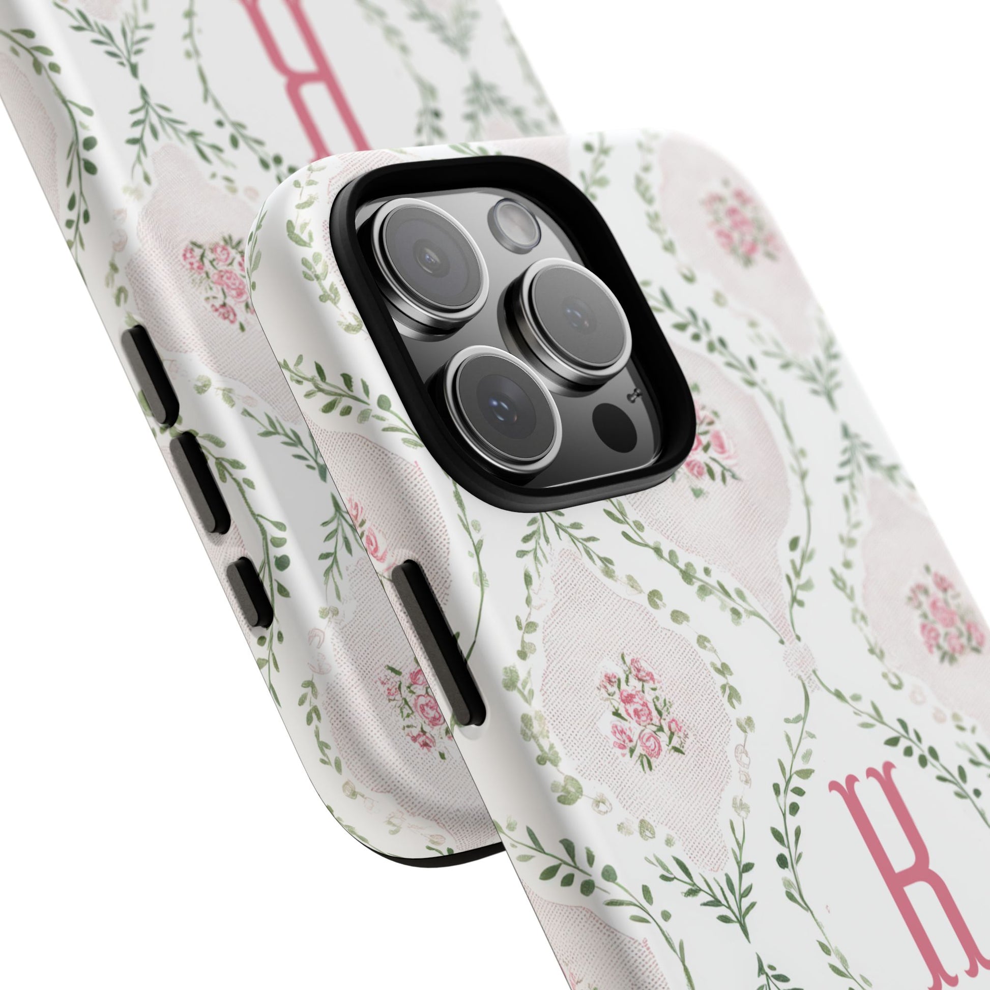 Soft vintage romance, but still clean and current—this Monogram phone case features delicate pink rose bouquets set inside a greenery lattice with a subtle linen-style blush texture, finished with your initial in the center. It’s a Trendy iPhone case for anyone who loves a grandmillennial/coquette look that feels timeless, not childish.