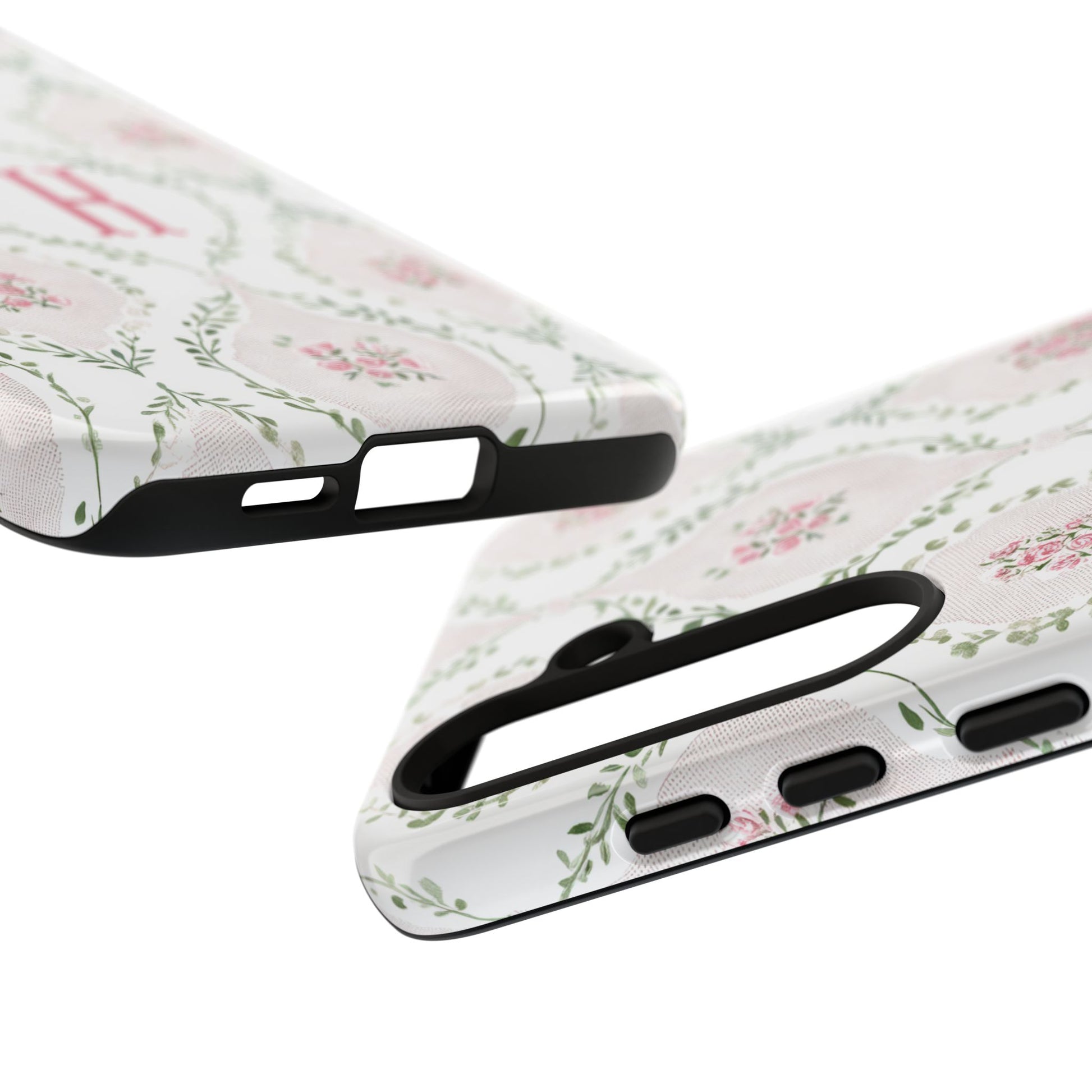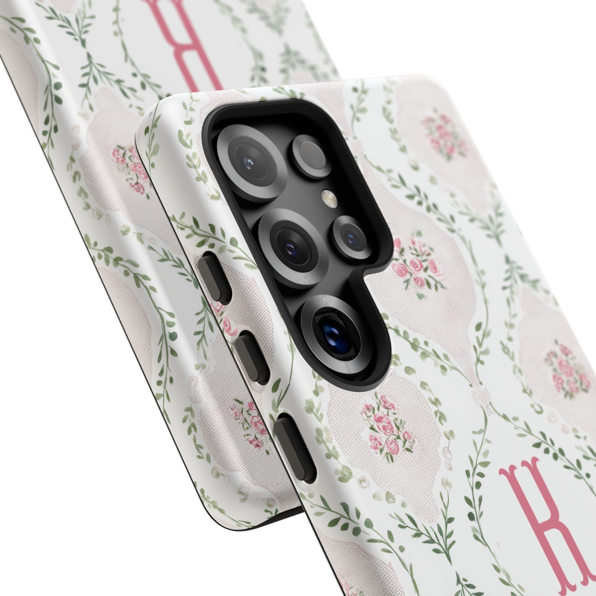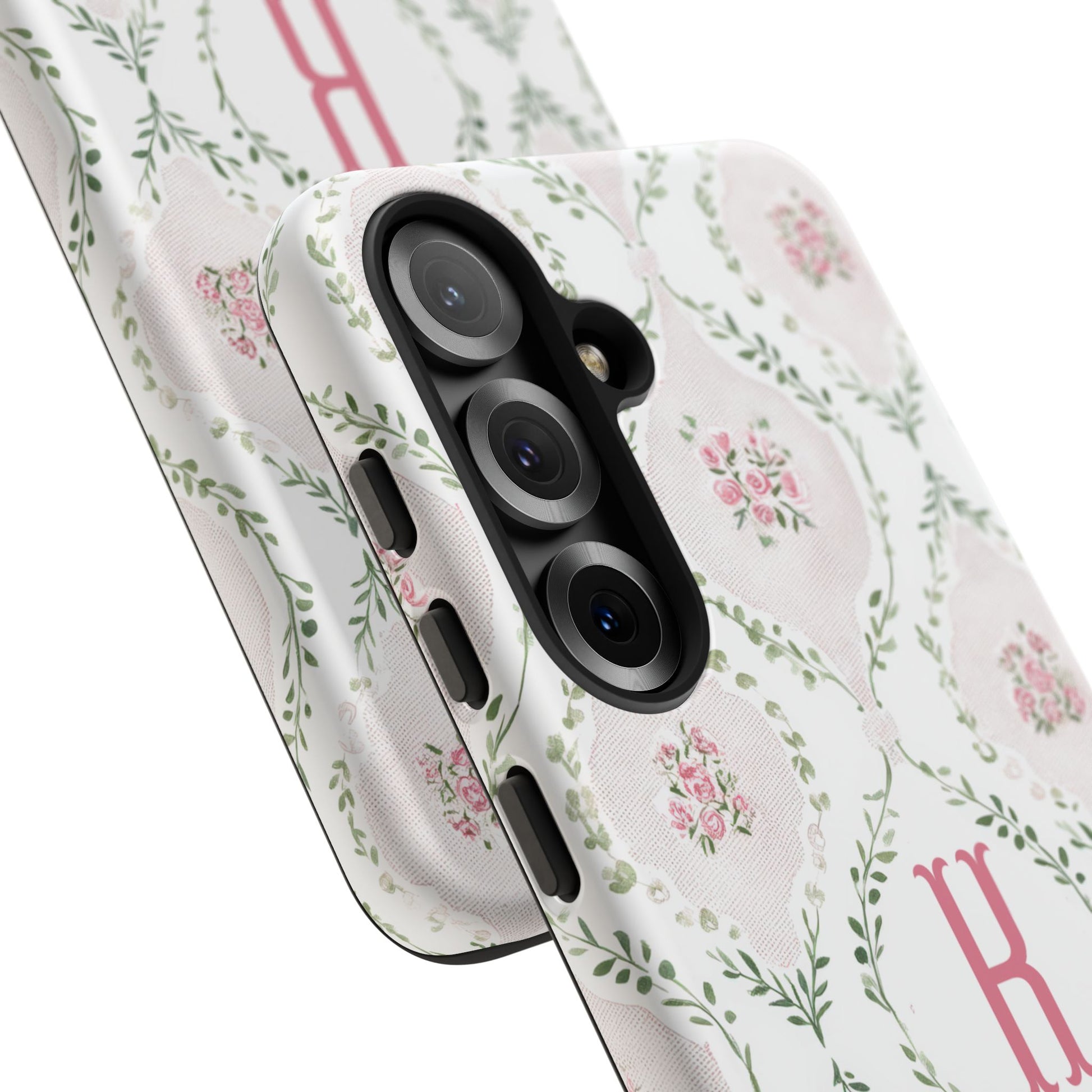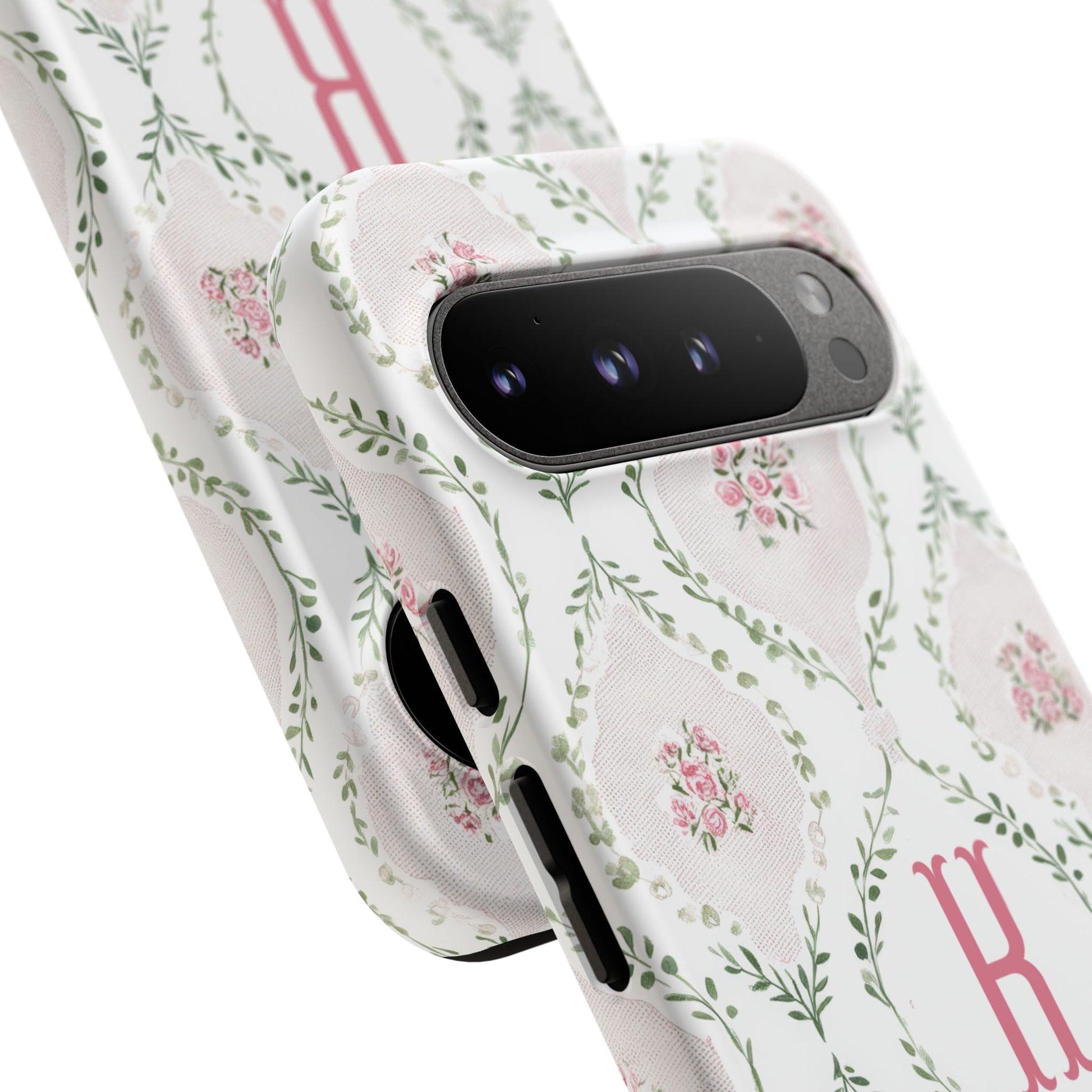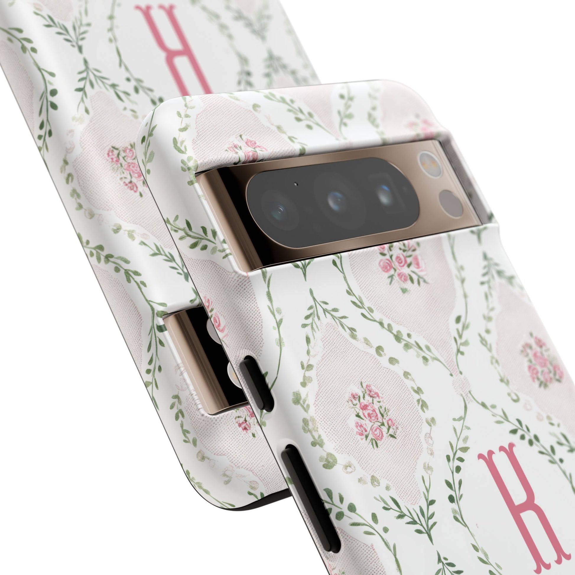 A slim, dual-layer protective phone case with a soft vintage floral pattern and a single-letter monogram. Subtle pink rosettes sit inside pale diamond frames, tied together by delicate green vines for a feminine, heirloom feel. The glossy or matte finish keeps the artwork vibrant while the TPU silicone liner cushions drops and the polycarbonate shell resists impacts. Lightweight and pocket-friendly, this case keeps your phone looking like a keepsake while shielding it from daily wear.
