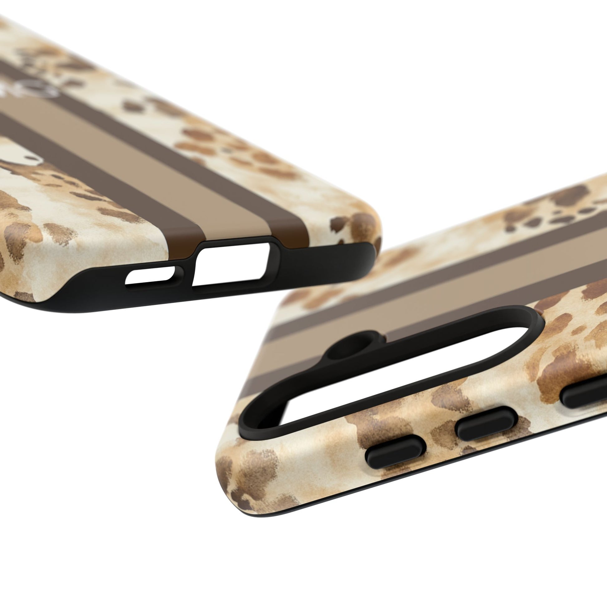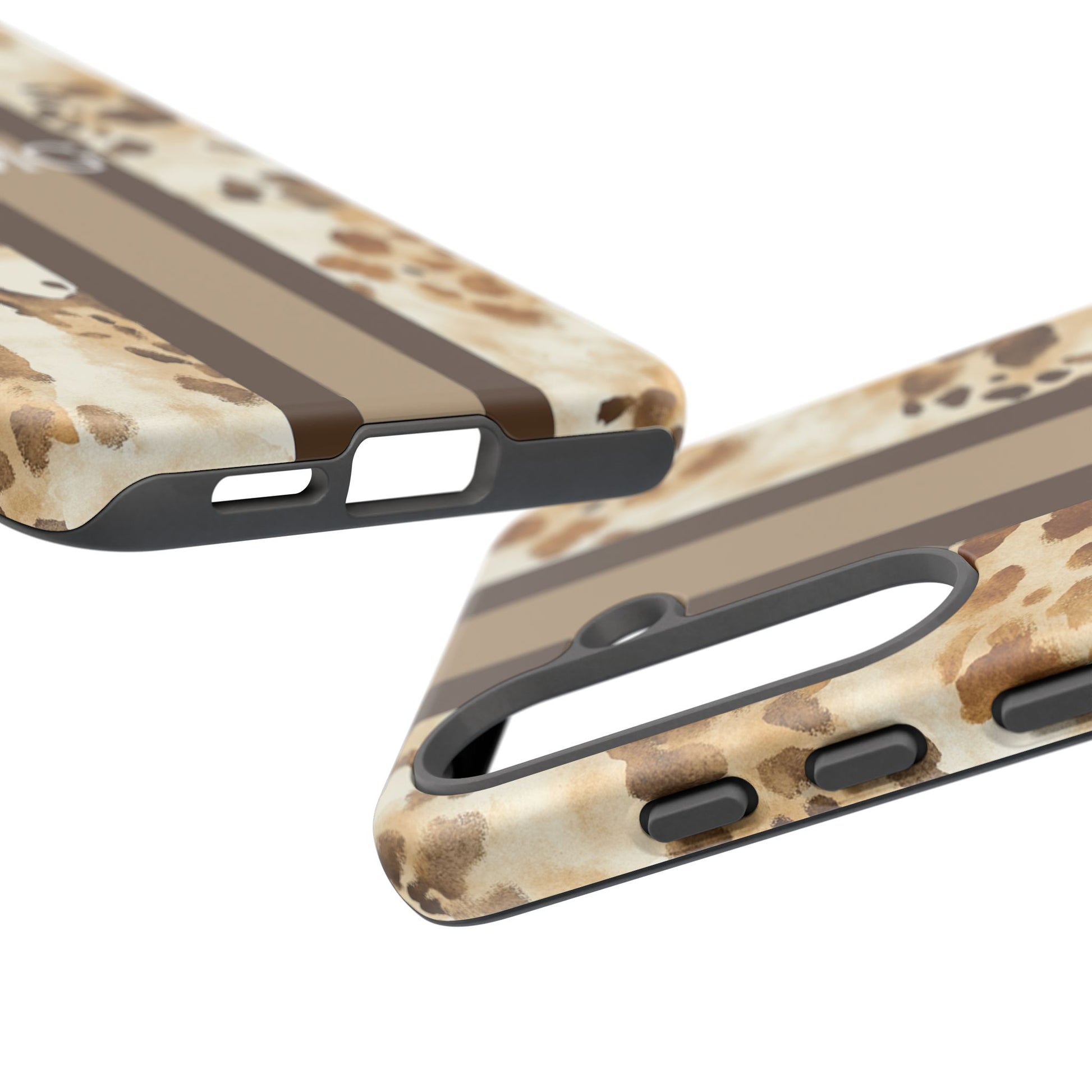 A stylish, protective phone case that blends rugged utility with a warm, artisan aesthetic. The design features soft watercolor paw prints scattered across a cream background, anchored by two rich chocolate-brown racing stripes and a small monogram space at the center. Built as a dual-layer shell with a hard polycarbonate exterior and a TPU silicone liner, this case absorbs shocks while keeping a slim profile. UV-resistant inks preserve the print outdoors, and clear access to ports keeps everyday use seamless. This case brings a cozy, lived-in look to your daily carry while guarding your device against drops and wear.