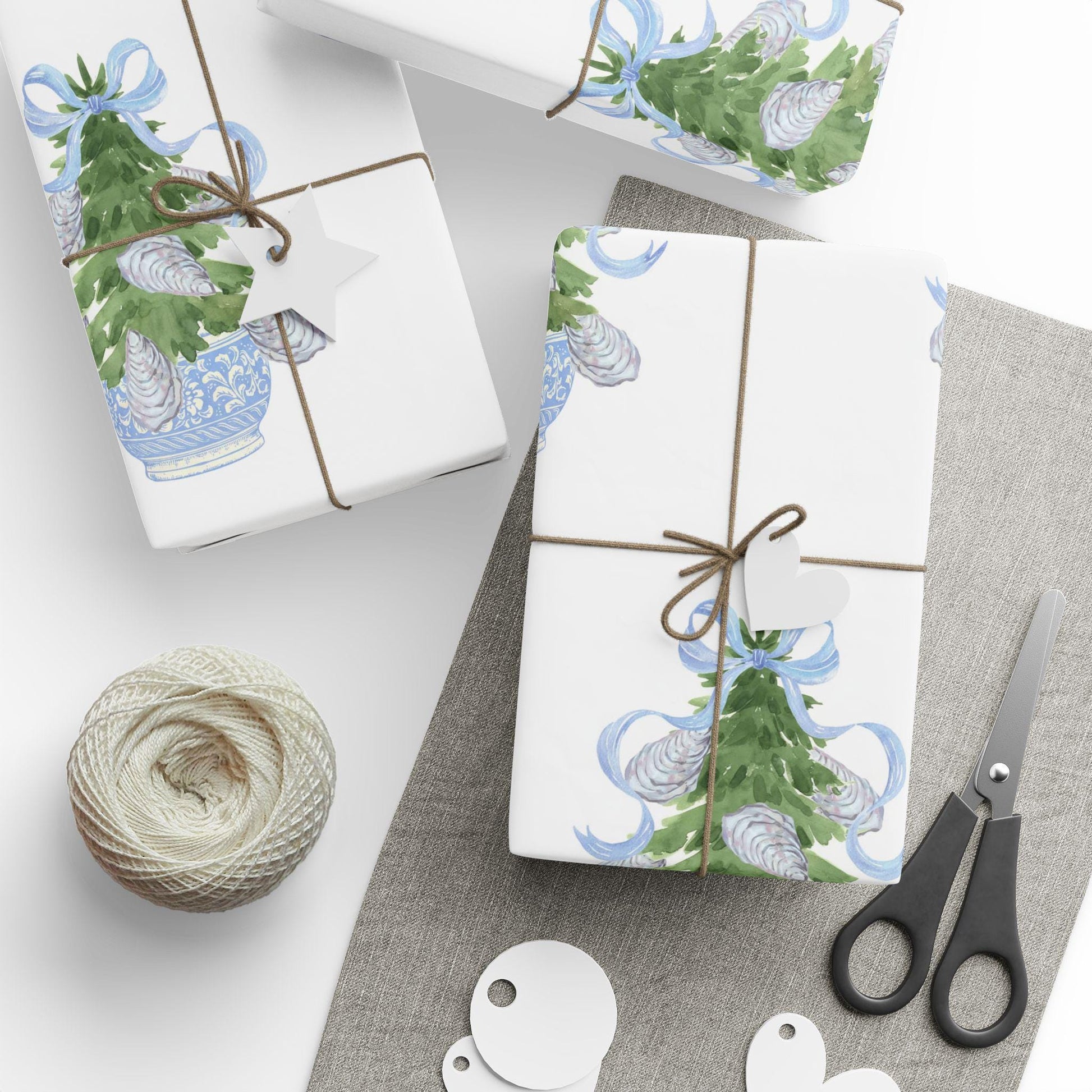 Bring coastal charm and timeless elegance to your holiday gifts with our Chinoiserie Oyster Shell Christmas Wrapping Paper. Featuring a hand-painted watercolor Christmas topiary adorned with oyster shells and tied with a soft blue ribbon, this design beautifully blends southern sophistication with classic chinoiserie style.