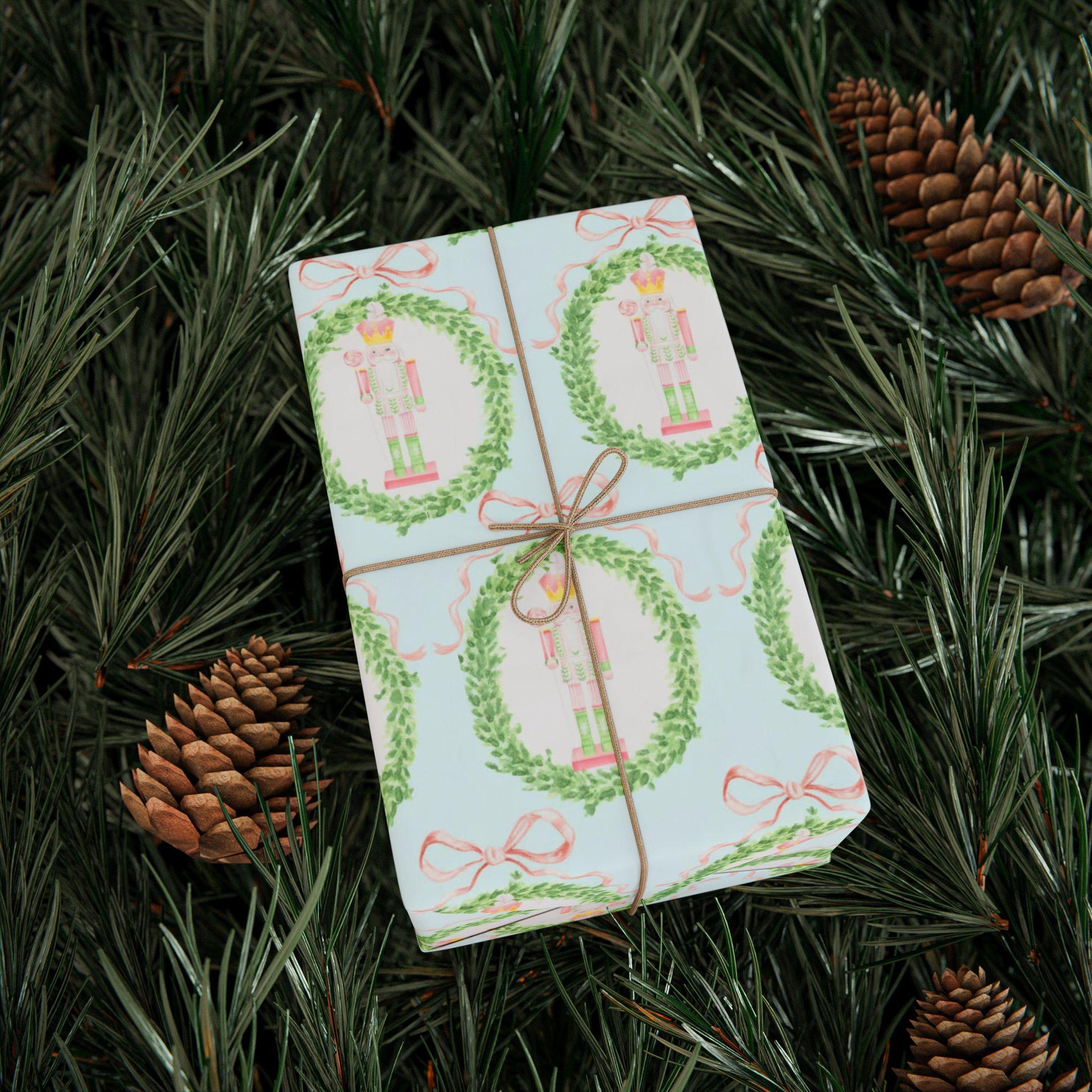 Bring Sugar-Plum charm to every present. This premium wrapping paper features hand-painted nutcrackers framed inside lush boxwood wreaths with soft pink bows on a light-aqua background—sweet, classic, and gift-ready for the whole holiday season.