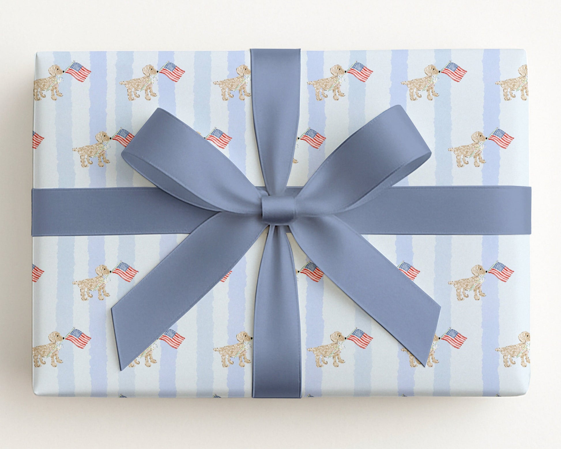 Celebrate in red, white, and doodle! πΎ This adorable patriotic gift wrap features a repeating pattern of cute doodle dogs proudly carrying American flags, set against soft watercolor blue stripes.
