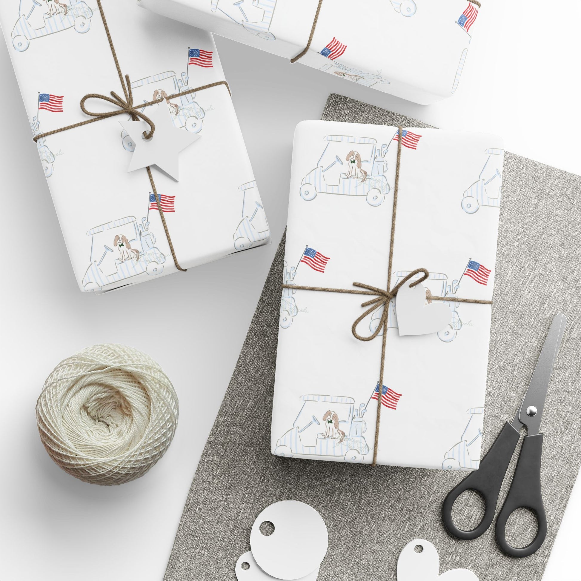 This playful and preppy wrapping paper design is perfect for dog lovers, golf enthusiasts, and anyone hosting or attending a Fourth of July celebration, beach party, or summer BBQ.