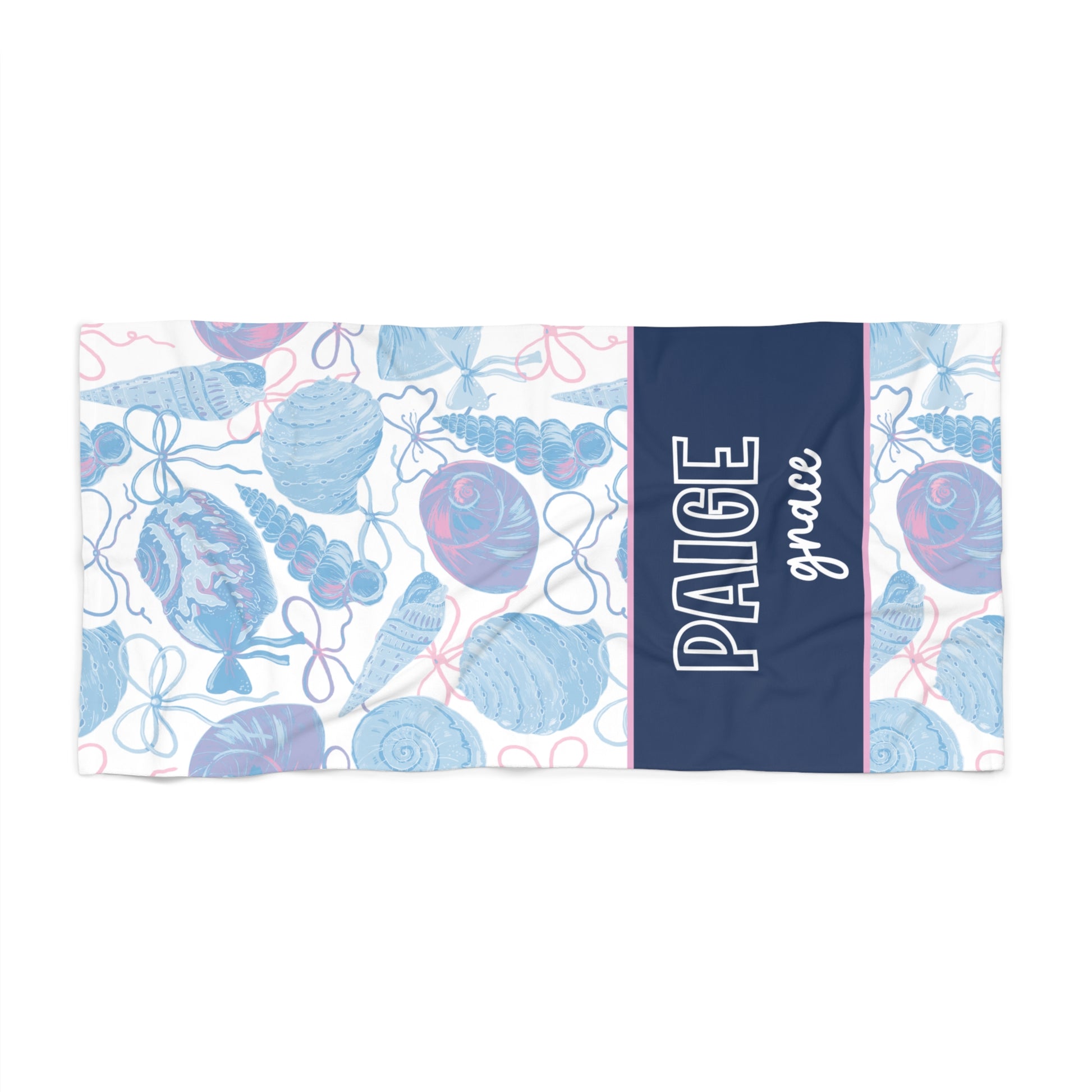Bring major preppy beach vibes to pool days with this Personalized Beach Towel Seashell featuring soft blue & pink seashells with bow details and a bold navy name band. It’s cute, coastal, and practical—because a big name makes it easy to spot (and harder to “accidentally” walk off).