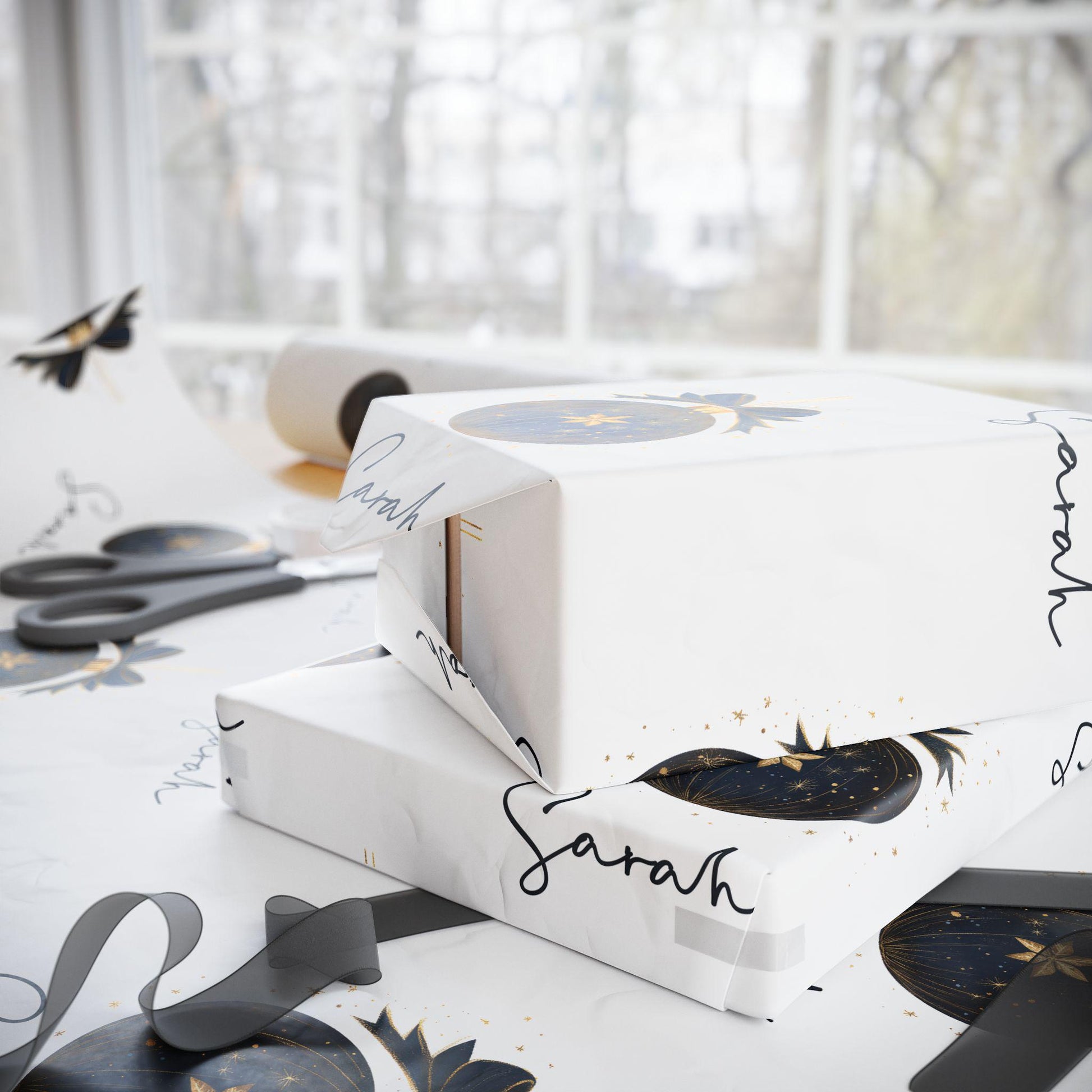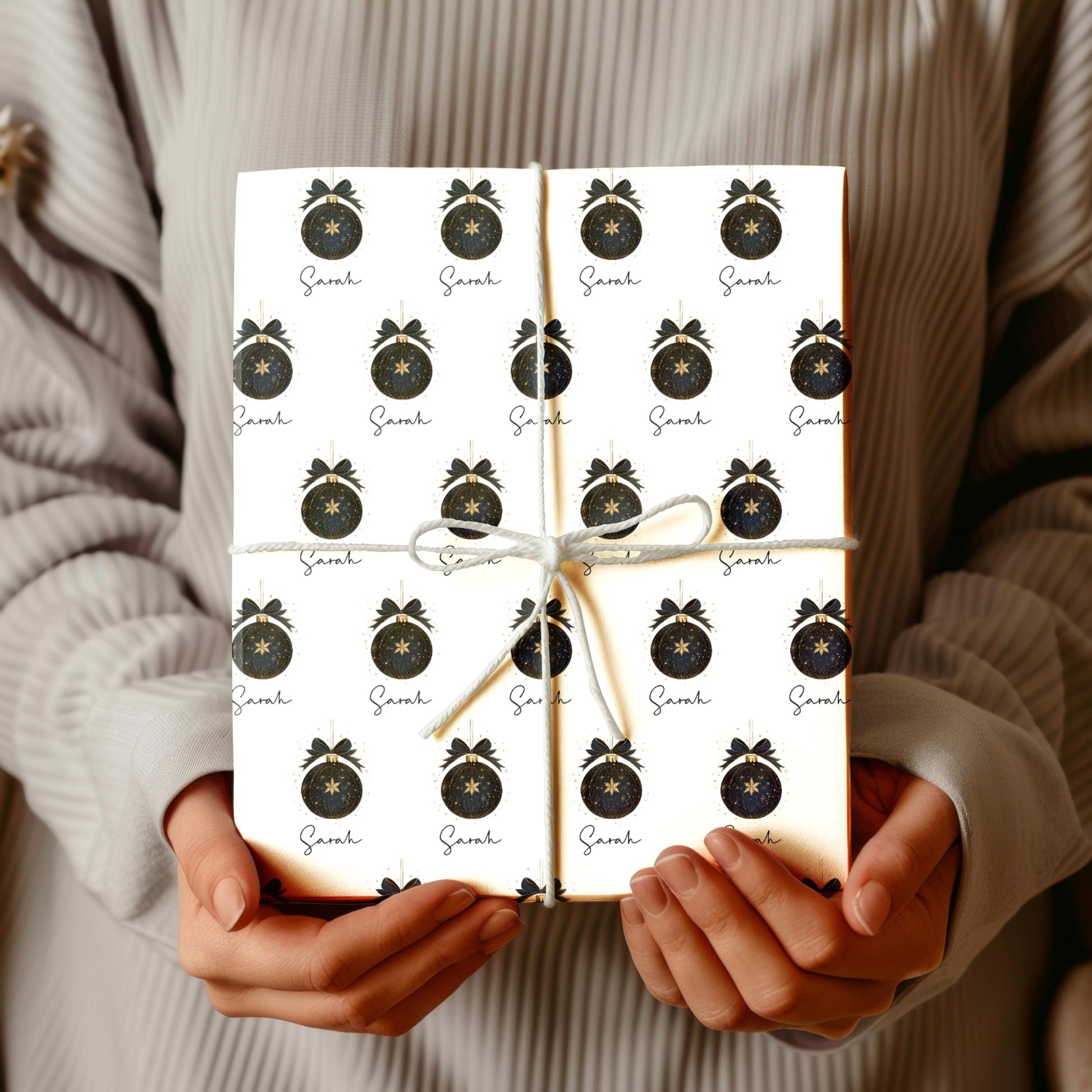 Make your holiday gifts shine with this personalized black and gold Christmas wrapping paper, featuring a shimmering ornament design with your custom name elegantly printed below.