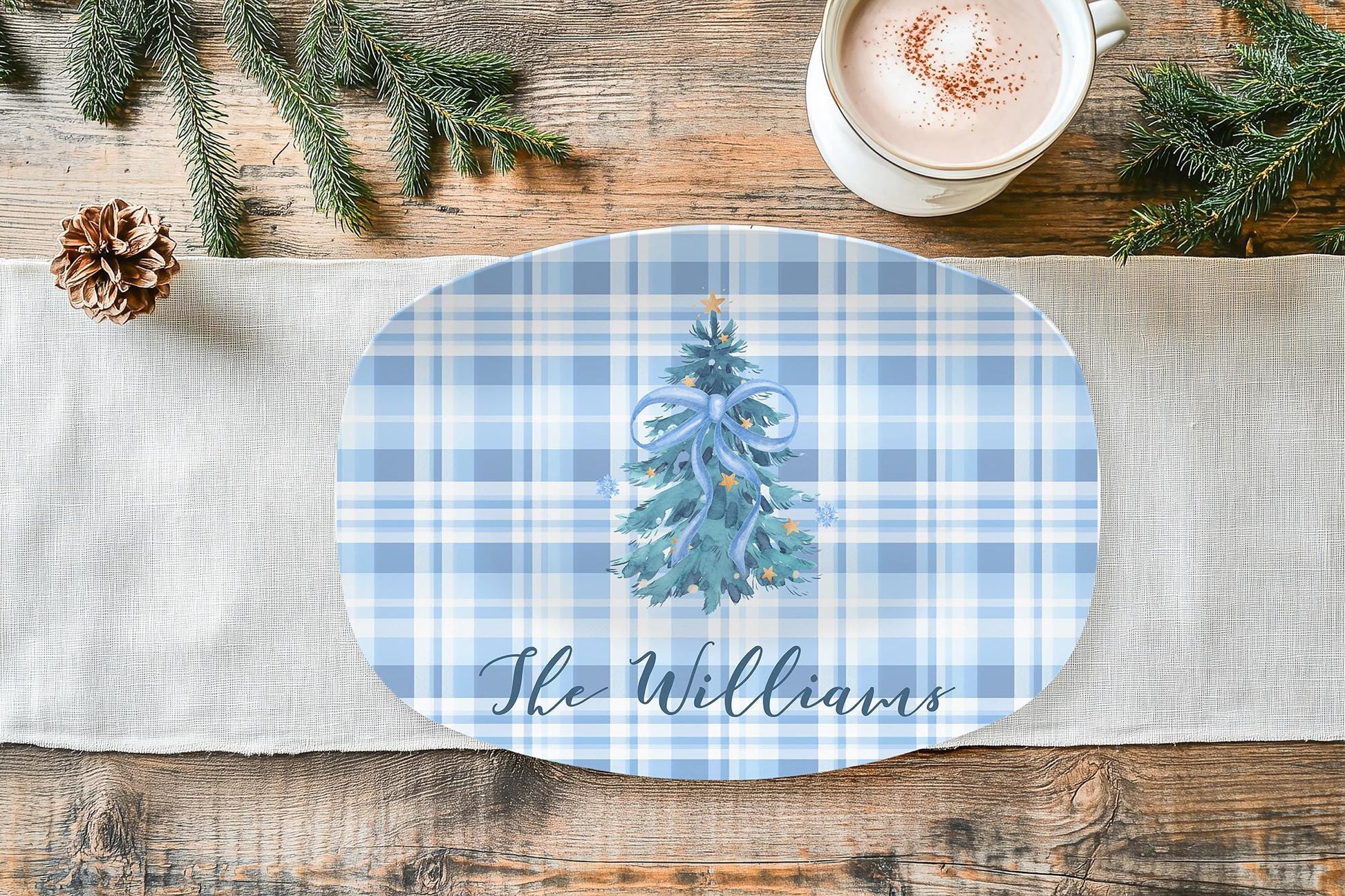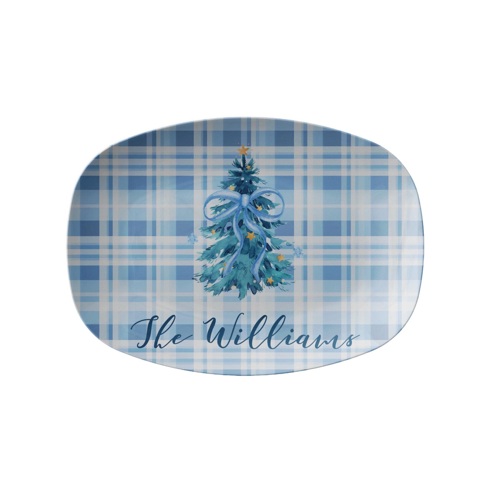 Celebrate the holidays in timeless style with this personalized blue Christmas tree platter, featuring a watercolor evergreen topped with a blue ribbon bow and set against a soft plaid background. Personalized with your family name, it’s a piece that blends classic Christmas charm with refined Southern elegance.