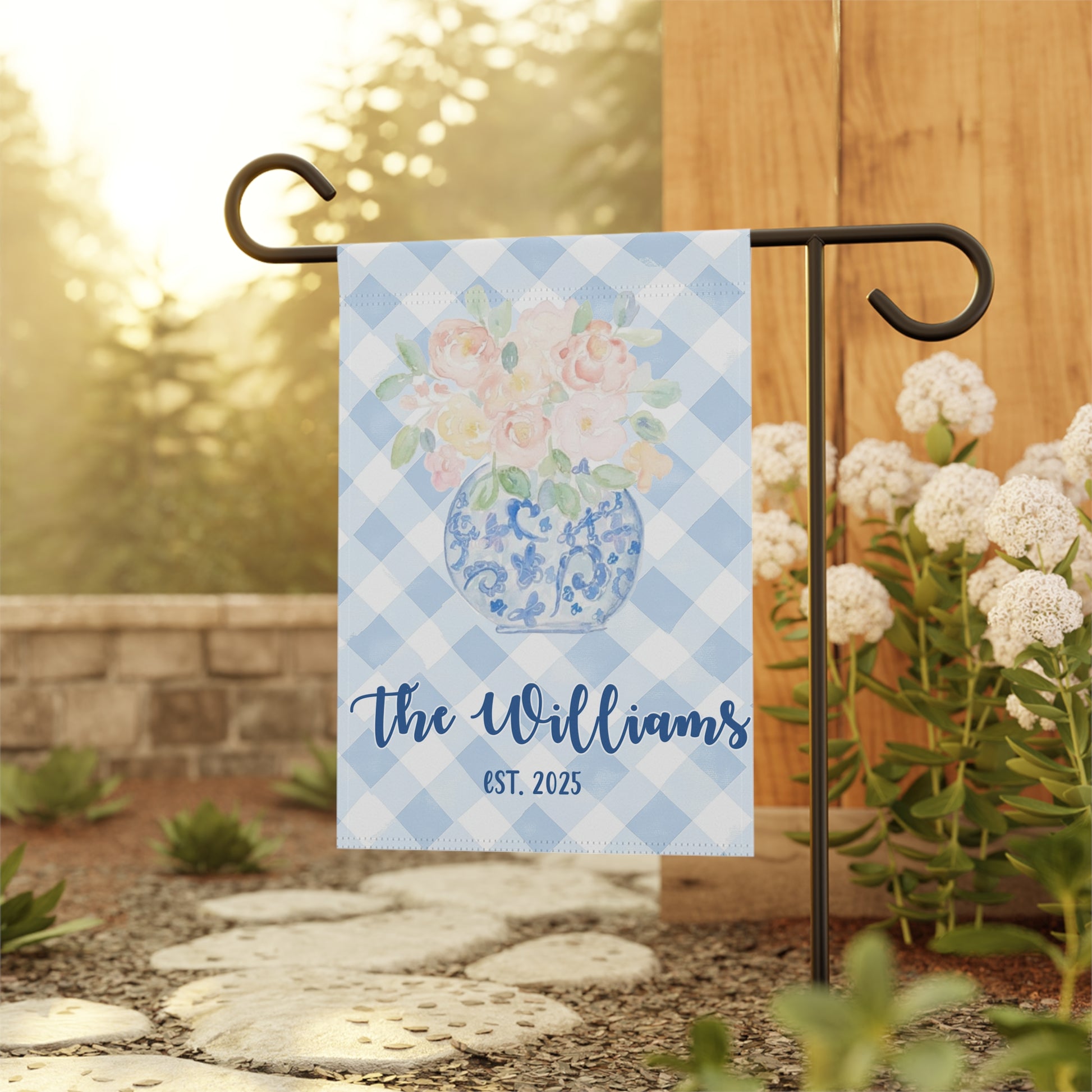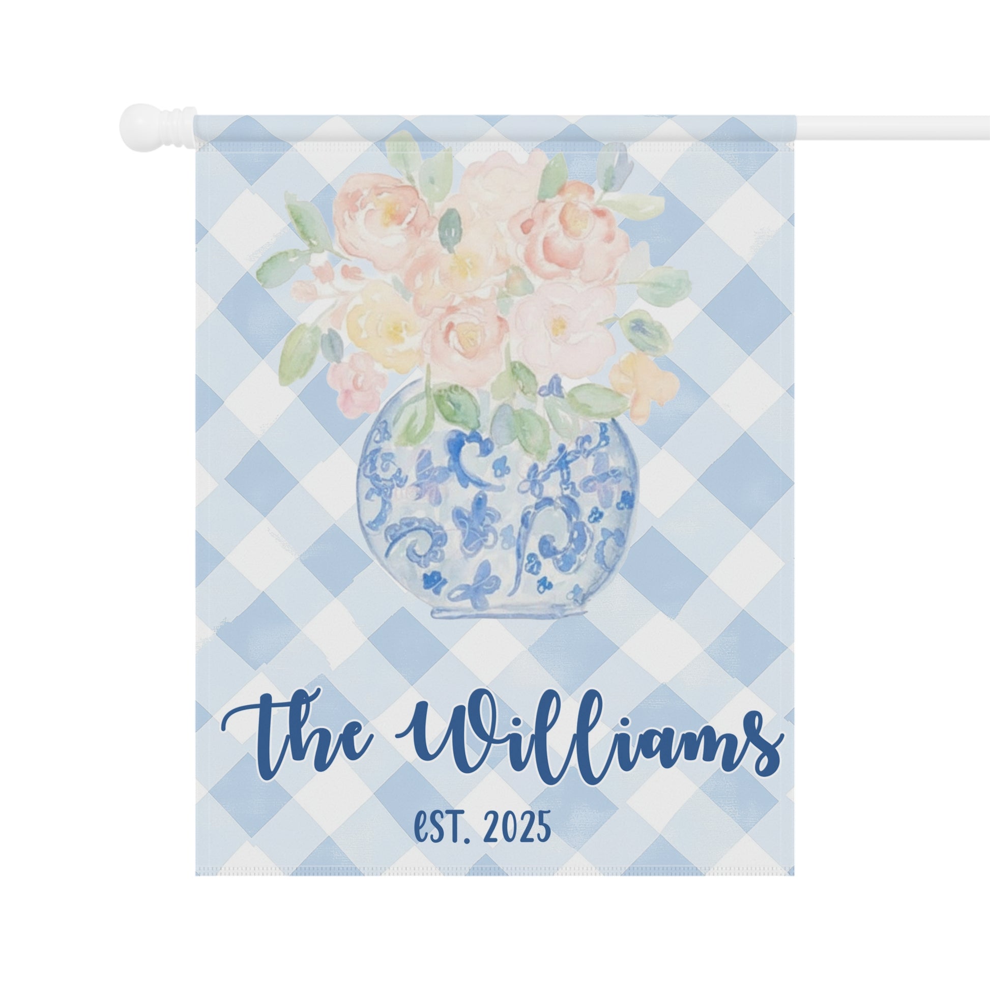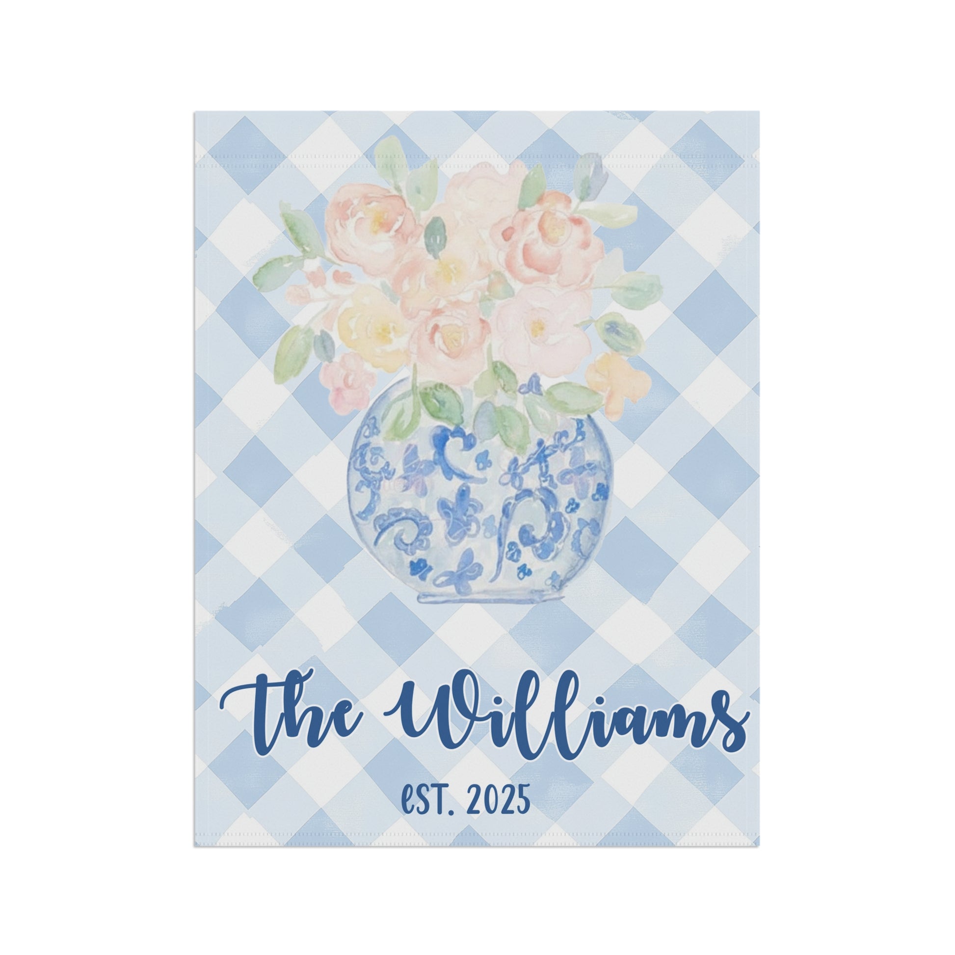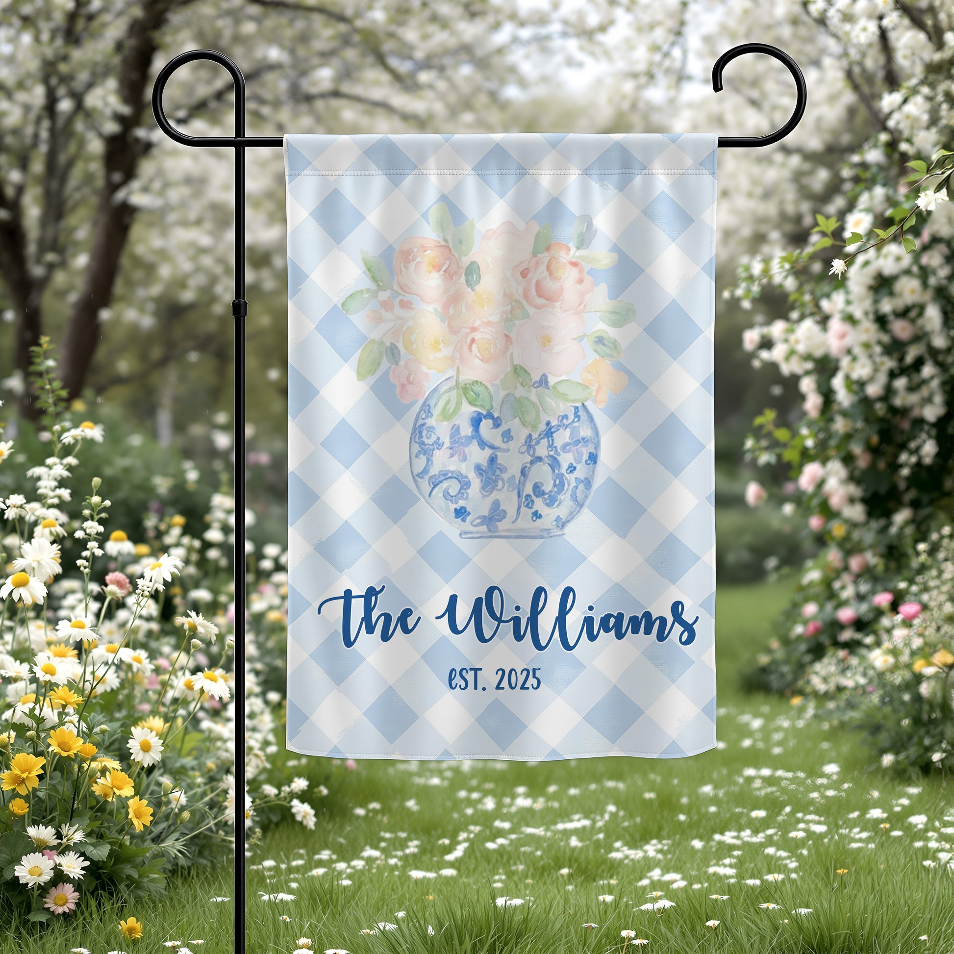 Soft, country-chic garden banner that brings a gentle, welcoming touch to porches and flower beds. A blue gingham backdrop sets the stage for a hand-painted porcelain vase filled with blush roses, while flowing script below names the household and notes the established year. The two-sided print keeps the design readable from either walk-by, and the top sleeve slips onto standard garden flag poles for an easy, no-fuss display. Subtle black lining adds durability and helps colors pop, making this banner a calm, homey accent that greets visitors and seasons with quiet charm.