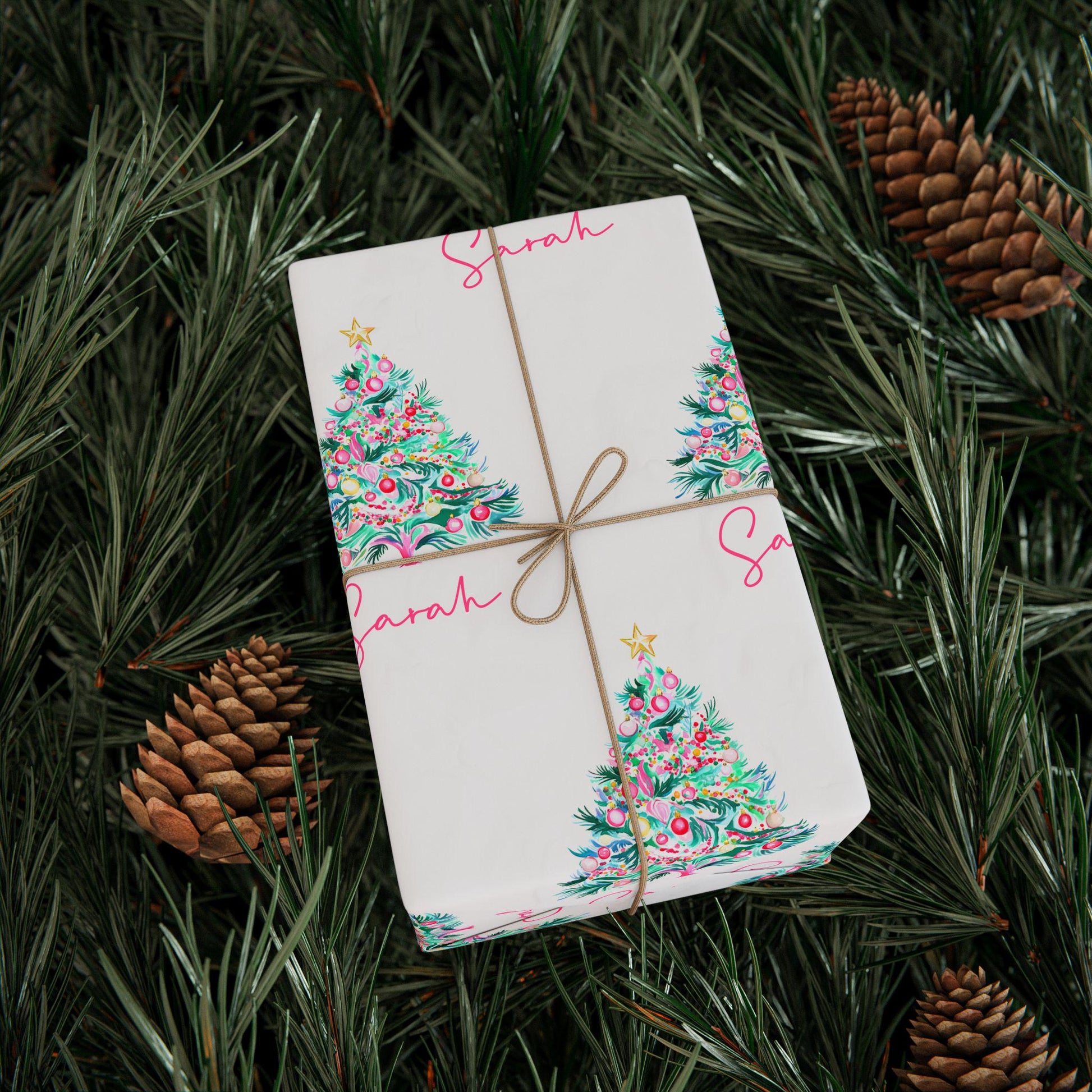 Add your custom name or phrase for a gift wrap that feels as special as whatâs inside! Perfect for lovers of preppy, coastal, and colorful Christmas decor, this design makes every package pop with personality.