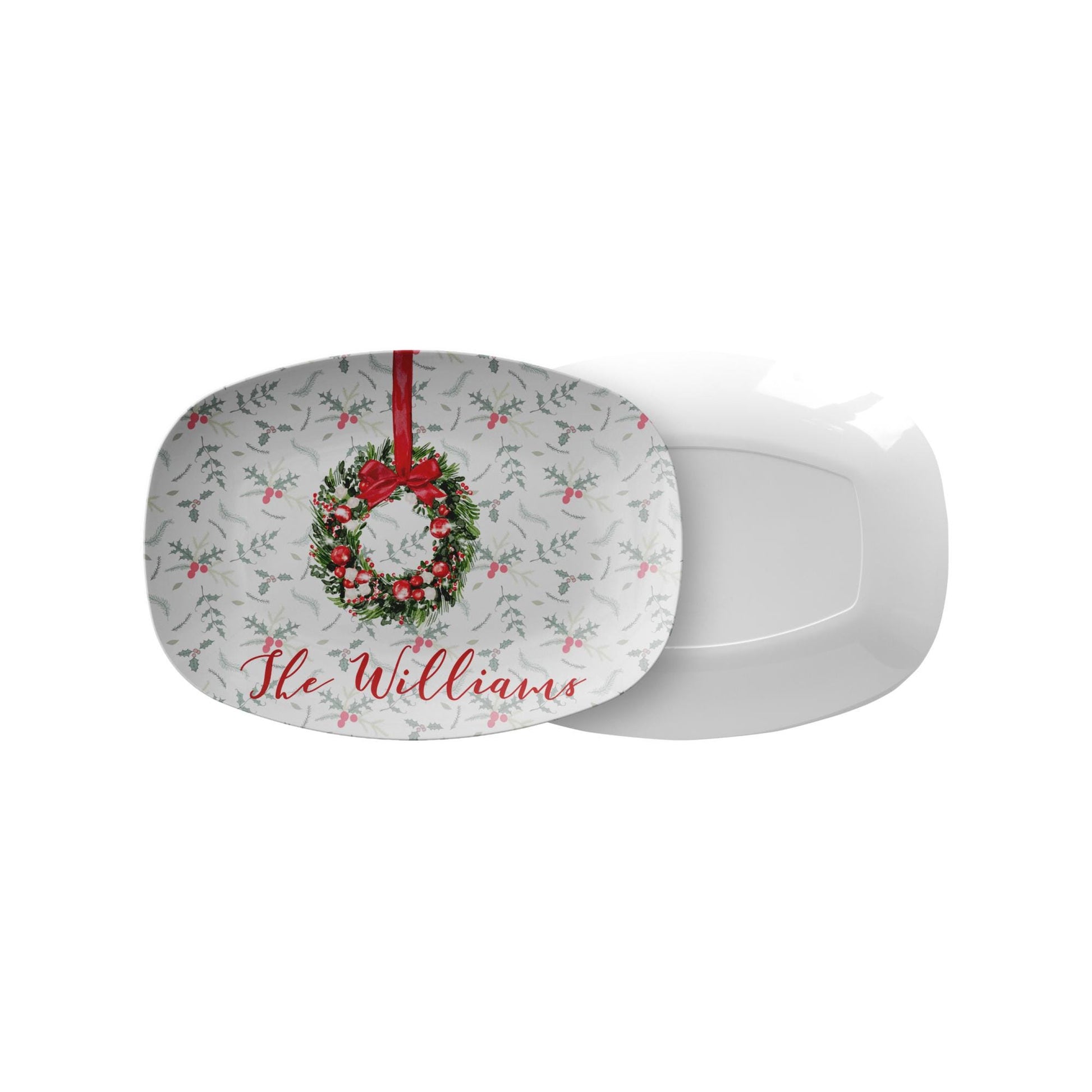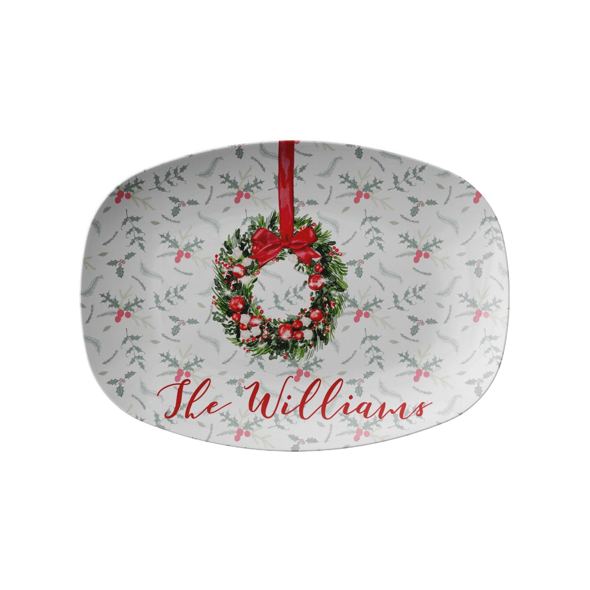 Bring timeless Christmas charm to your home with this personalized Christmas wreath platter, featuring a hand-painted watercolor wreath adorned with holly berries, ornaments, and a classic red bow. Personalized with your family name, it’s the perfect way to add a thoughtful and festive touch to your holiday table or kitchen décor.