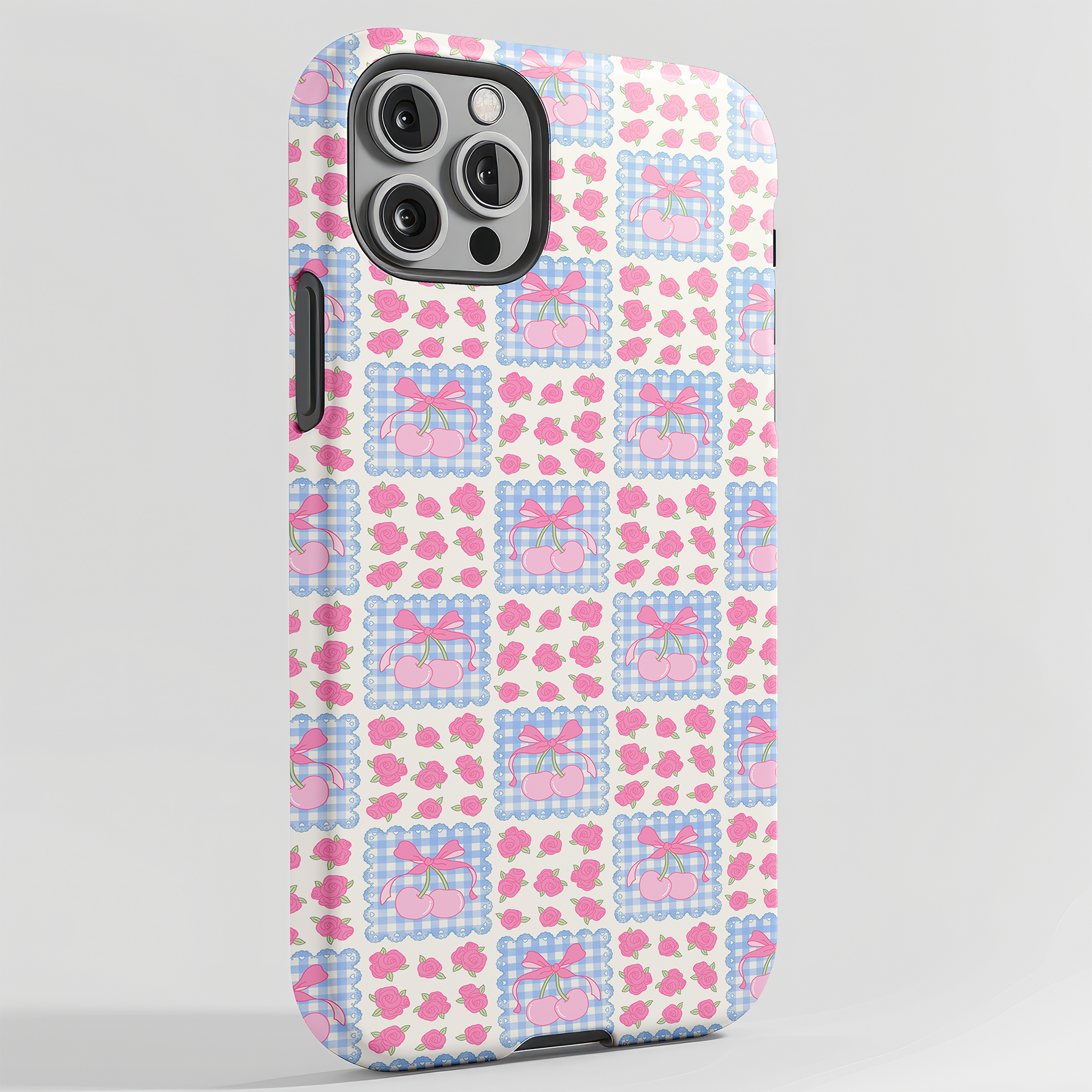 Sweet, vintage, and ultra-feminine—this personalized coquette phone case features a grandmillennial quilt-style patchwork with pink bow cherries on blue gingham, paired with pink rose floral blocks on a clean white background. Add your custom initials/monogram for a classic, preppy finish. Perfect for anyone who loves coquette, cottagecore, grandmillennial, and preppy style.