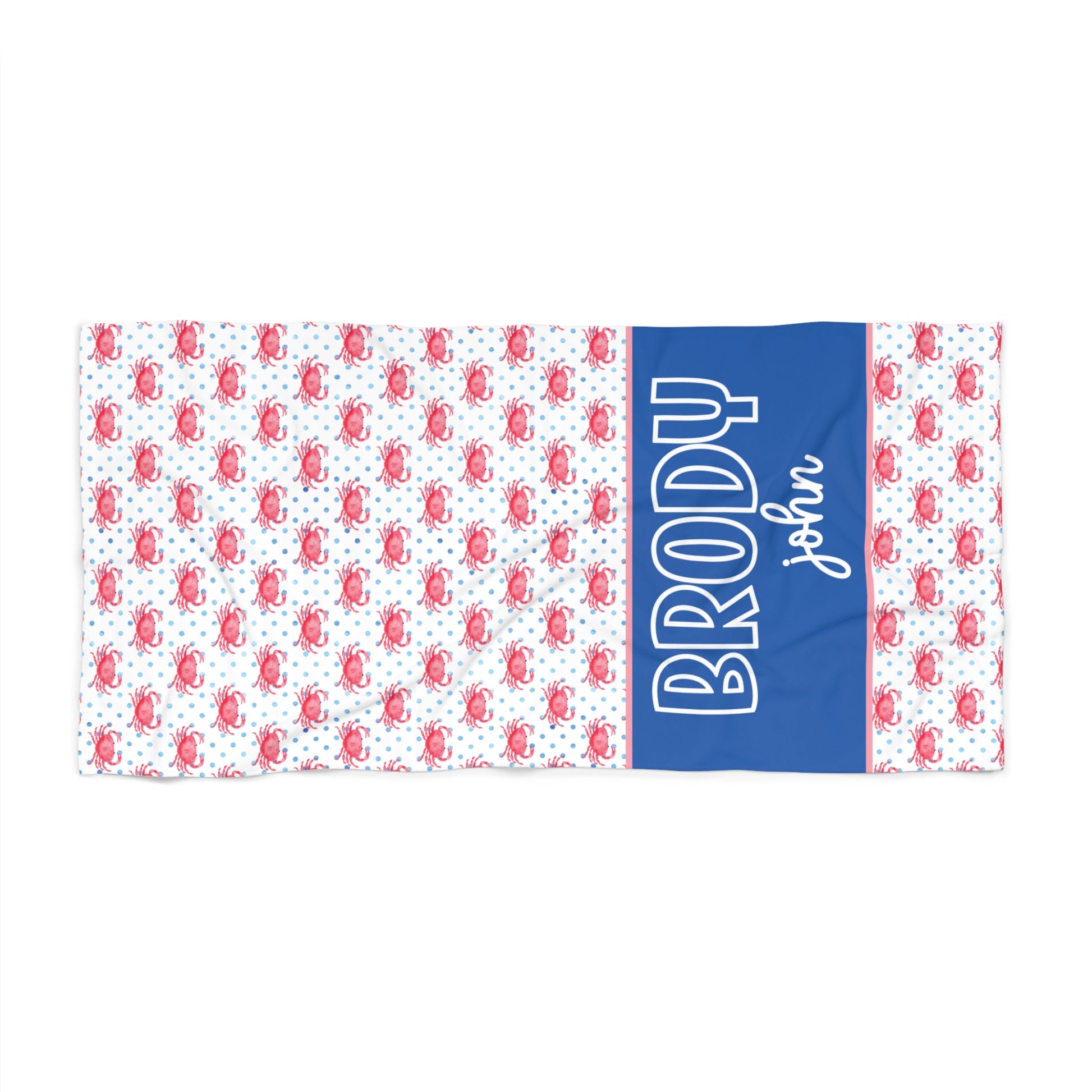 This Personalized Crab & Polka Dot Beach Towel is a summer essential that’s easy to spot and impossible to mix up. With a fun red crab pattern paired with playful blue dots and a bold navy name band, it’s perfect for pool days, beach trips, lake weekends, and summer camp.Why it’s a favoriteCustomized with your name (first name + optional second line)Cute coastal crab print with blue polka dots—preppy nautical vibeBold name band helps kids (and parents) find their towel fastGreat for siblings—order multiple with different namesPerfect forBeach vacations, pool parties, lake house weekendsSummer camp / day camp / sleepaway campSwim team, swim lessons, spring breakBirthdays, end-of-school gifts, beach trip surprises