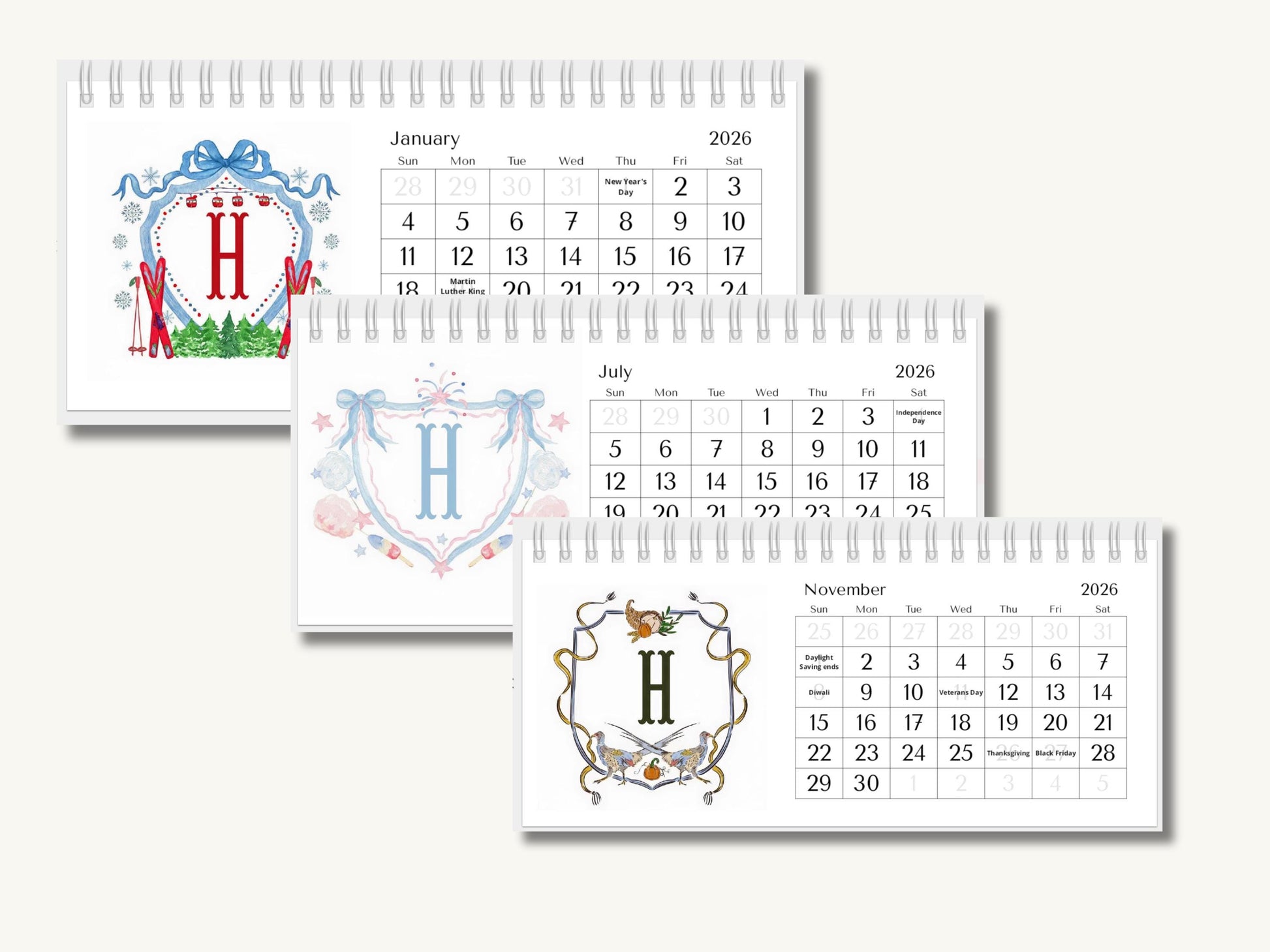 Each month includes a custom monogram surrounded by seasonal illustrations