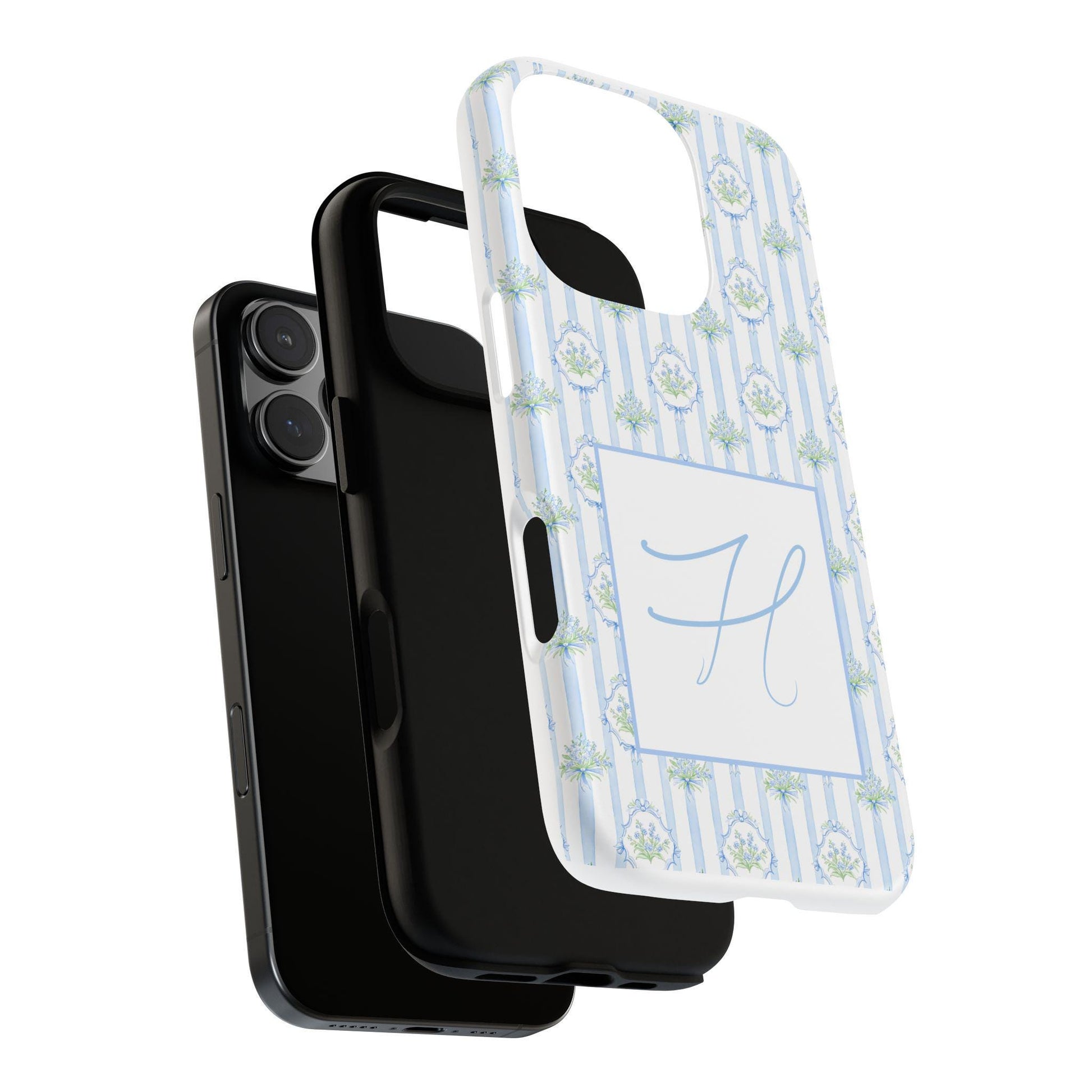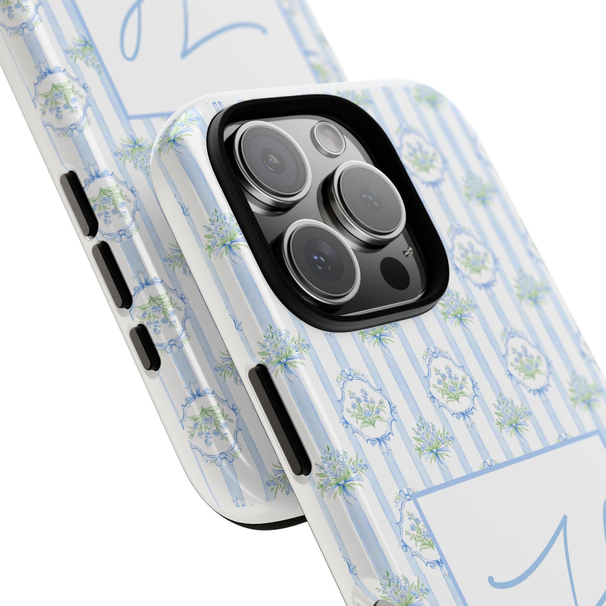 Show off your style with this personalized blue floral phone case, featuring delicate watercolor forget-me-not flowers framed with bows and ribbons, paired with your custom initial in an elegant script. Designed with both beauty and durability in mind, this tough phone case protects your device while giving it a vintage-inspired, feminine charm.